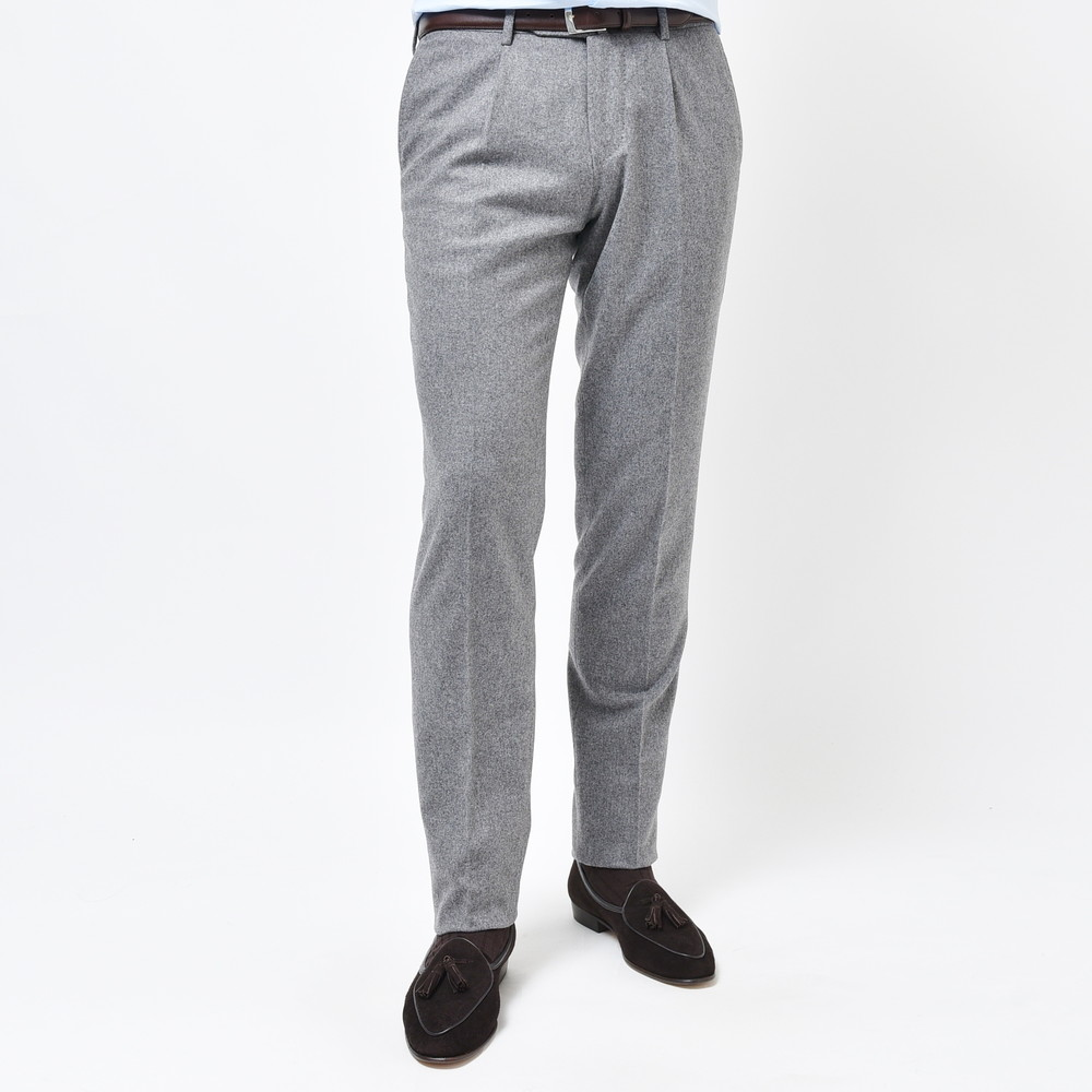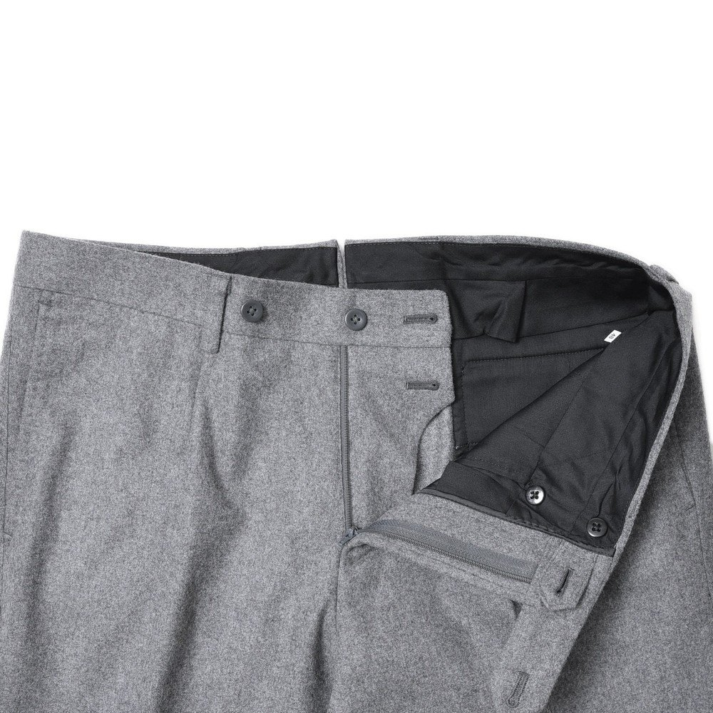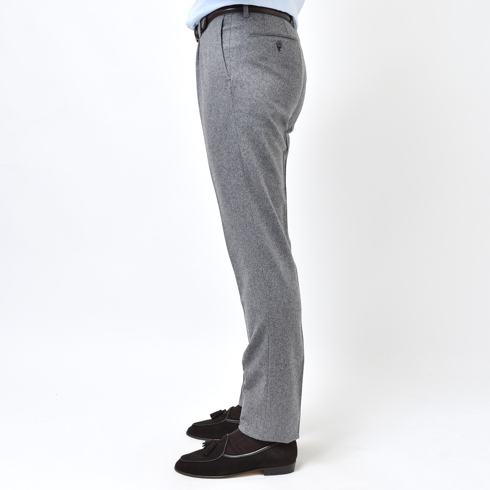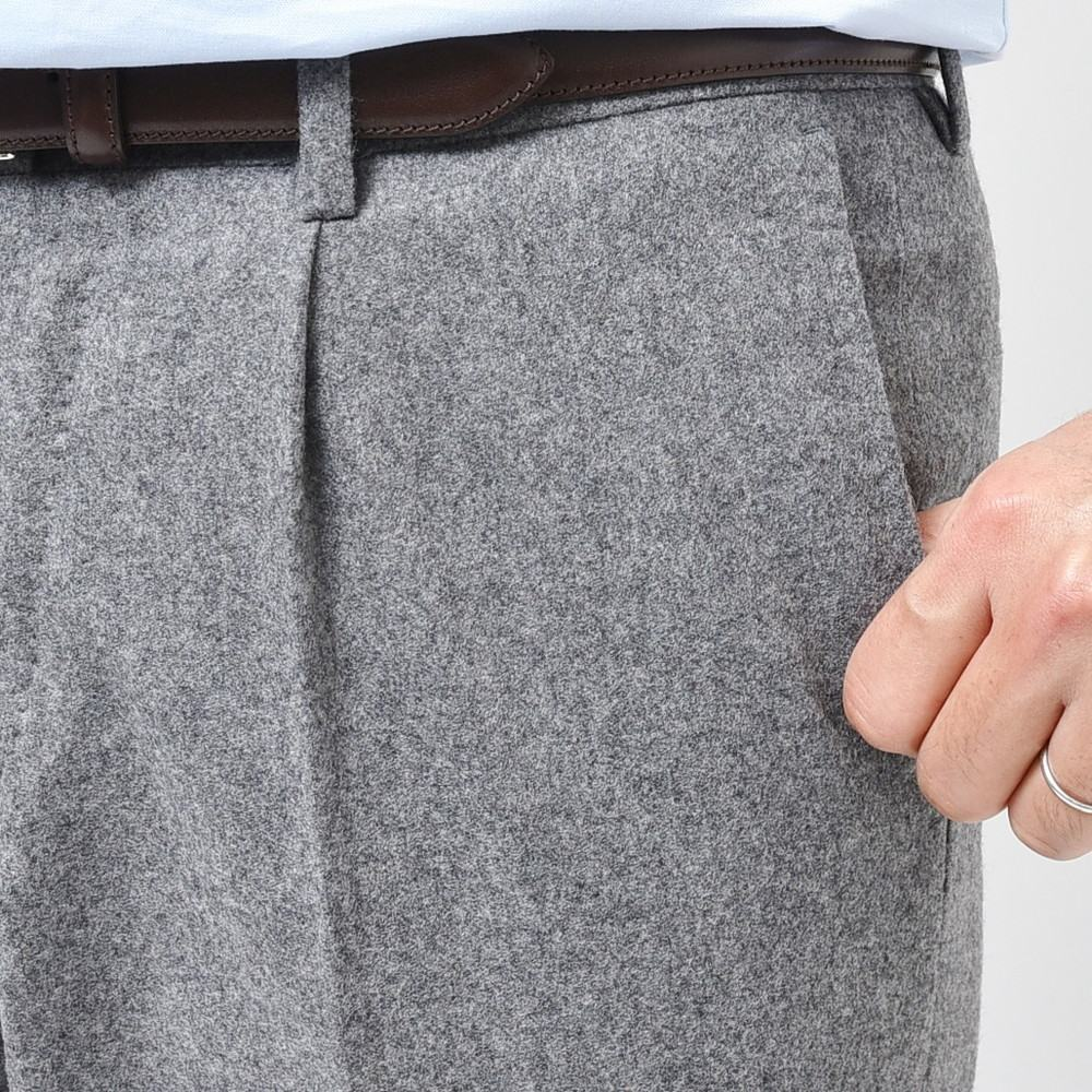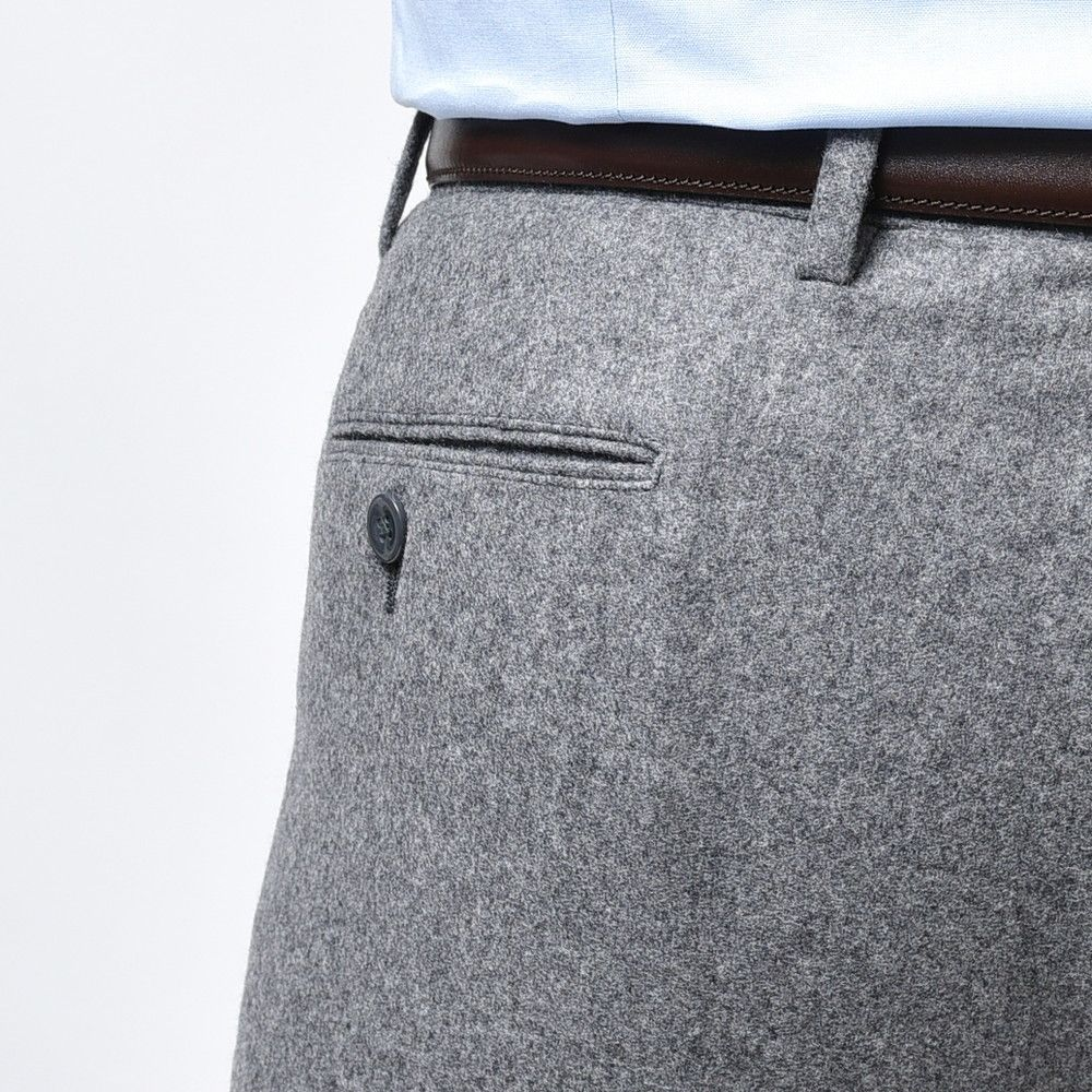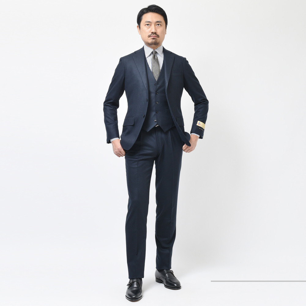 モダンでシャープ、ビジネススタイルに色気と艶気をもたらしてくれる完成度の高い仕上がりはいつもの別注クオリティなので、生地の説明を少し。“Cream Flannel”と銘打たれた、程良いウェイト感とイタリアらしい柔らかさを併せ持つファブリックはCARLO BARBERならでは。地下倉庫で糸を寝かせ、熟成させた後に織り上げる製法はオンリーワン且つ効率度外視。