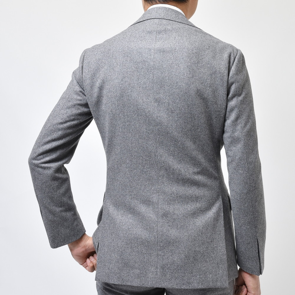 3B腰フラップ、サイドベンツ、ラペル巾8.5cm、袖アンフィニッシュド、組下1プリーツです。
