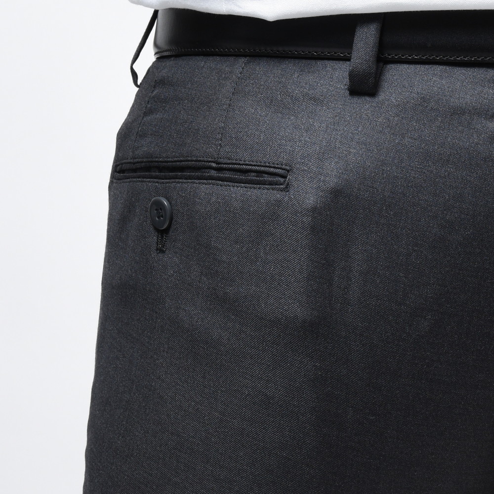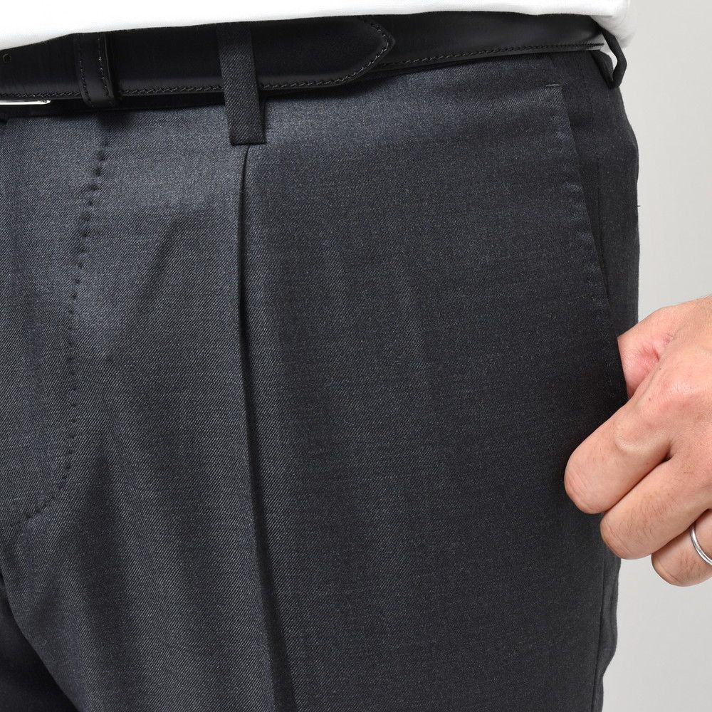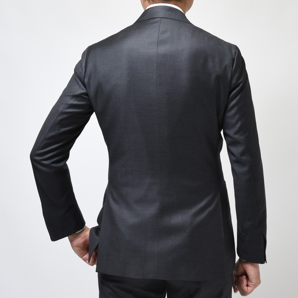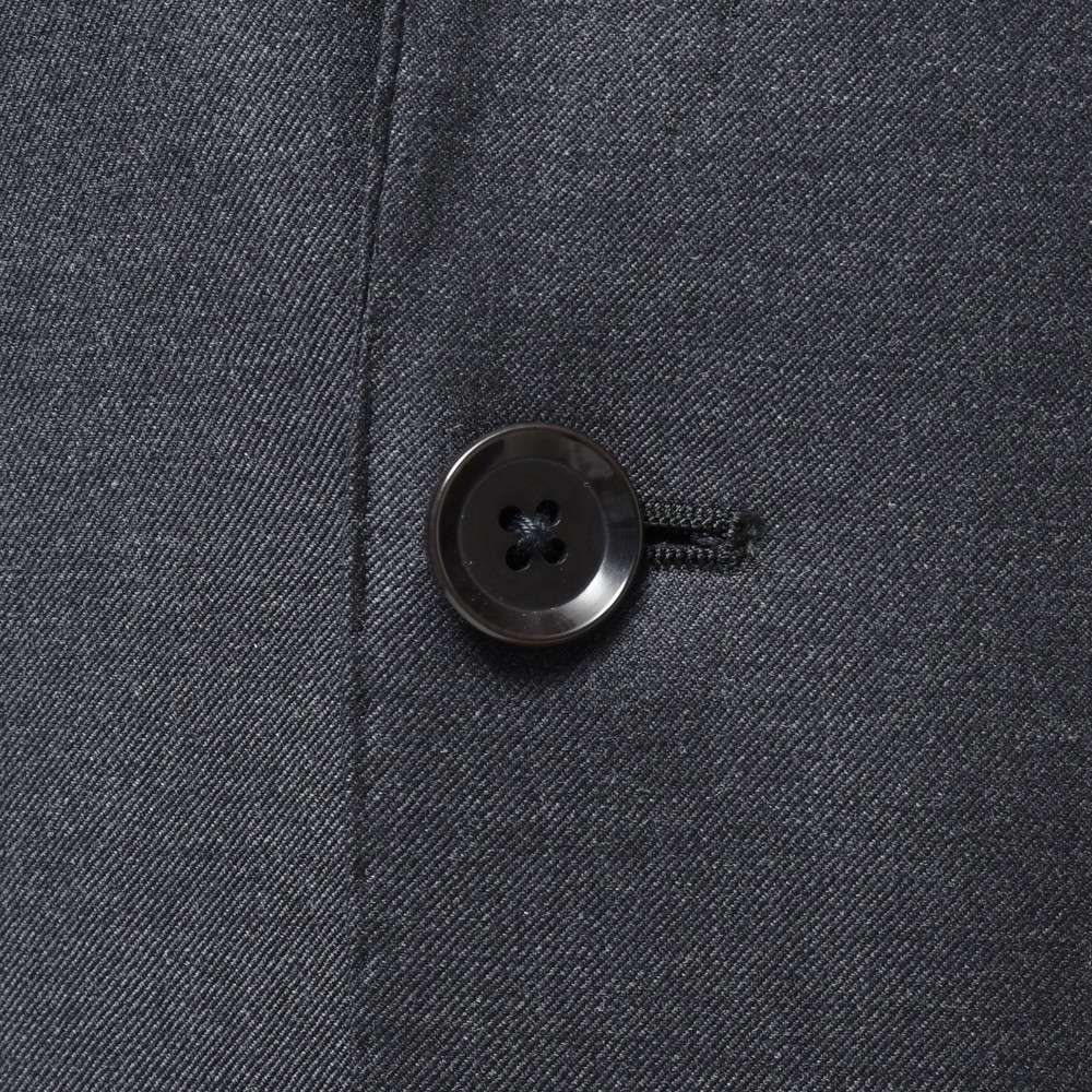 6B腰玉縁、サイドベンツ、ラペル巾11.5cm、袖アンフィニッシュド、組下1プリーツです。