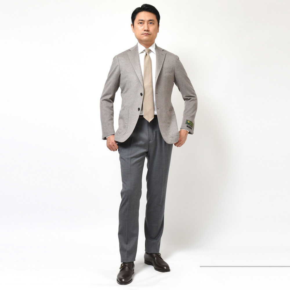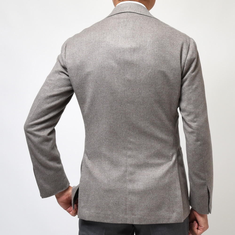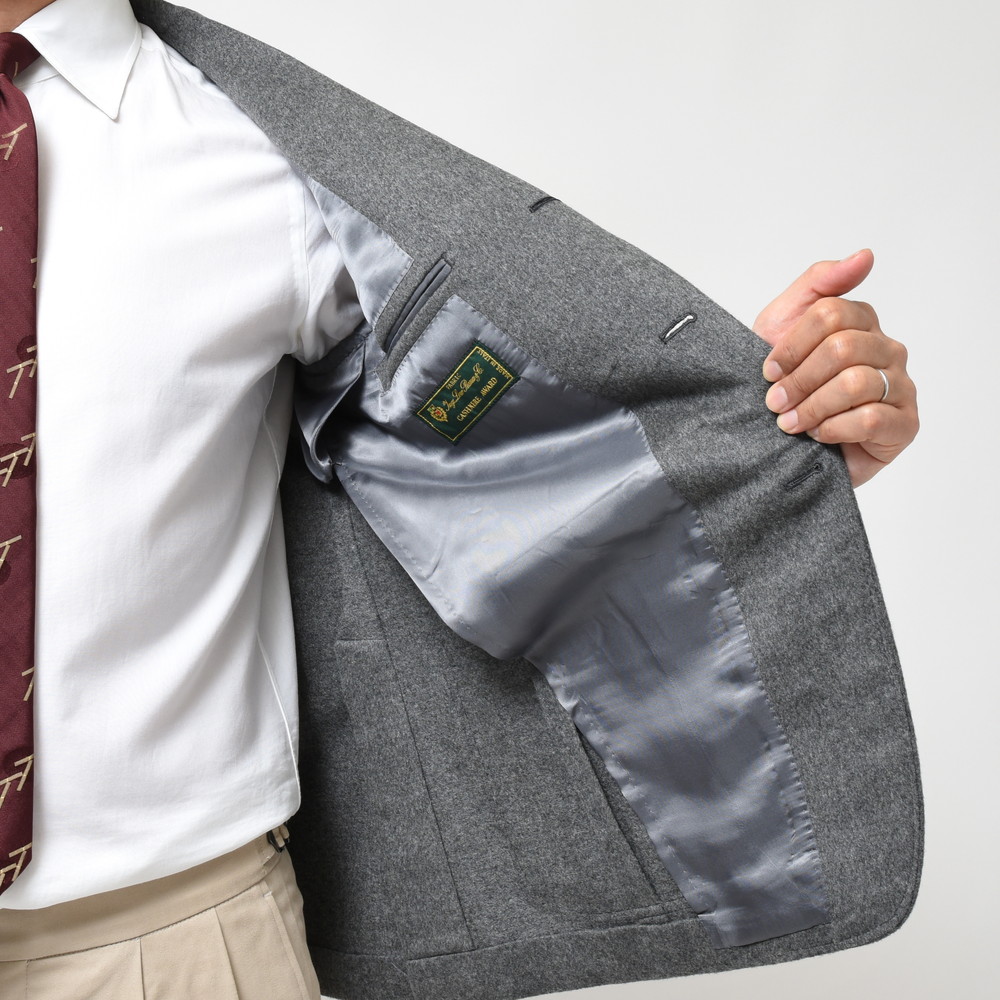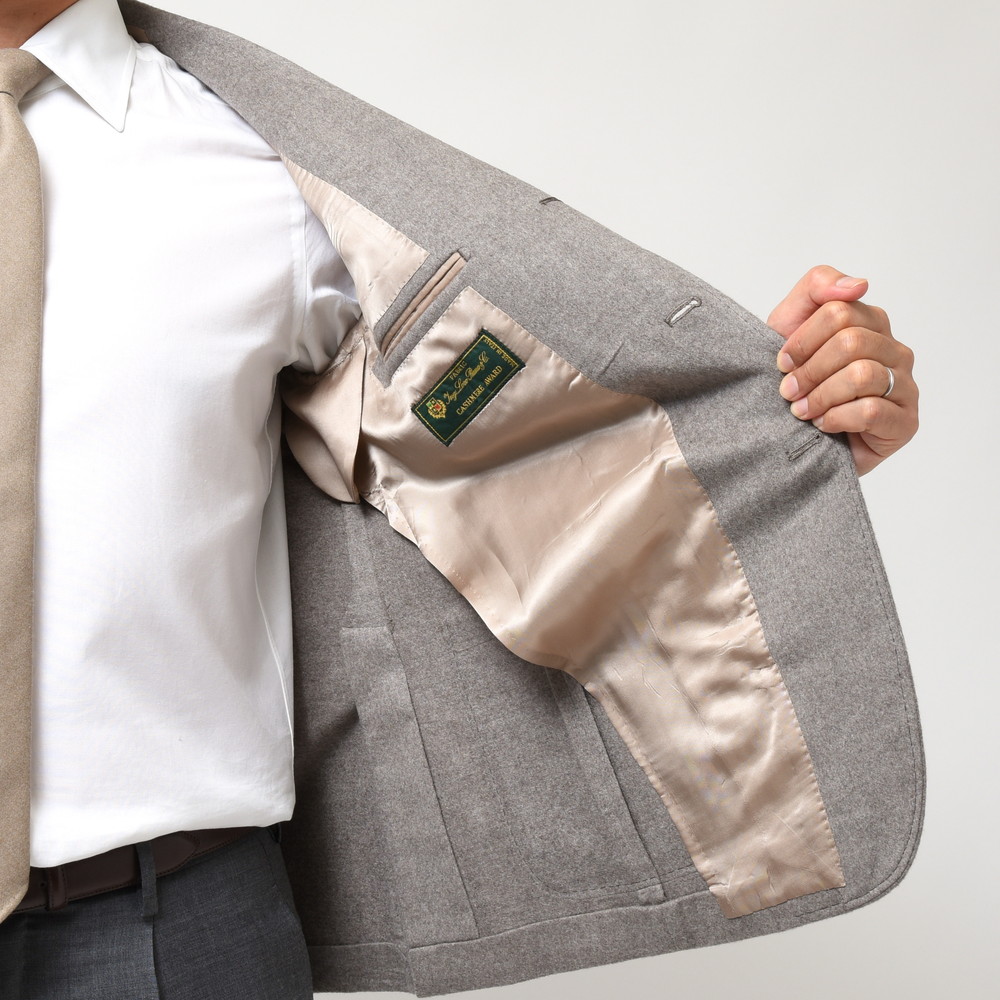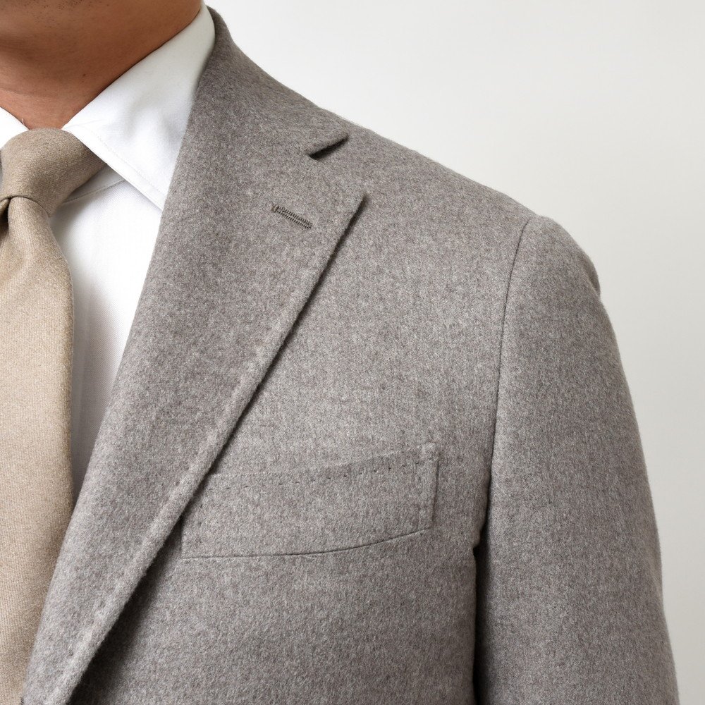 原毛の良さから来る風合いの良さと発色の美しさが魅力のLoroPianaロロピアーナ社のカシミアフランネルを贅沢に用いた一着。多数色が提案されている中でも特に素晴らしいと感じたグレージュとグレーでオーダー致しました。