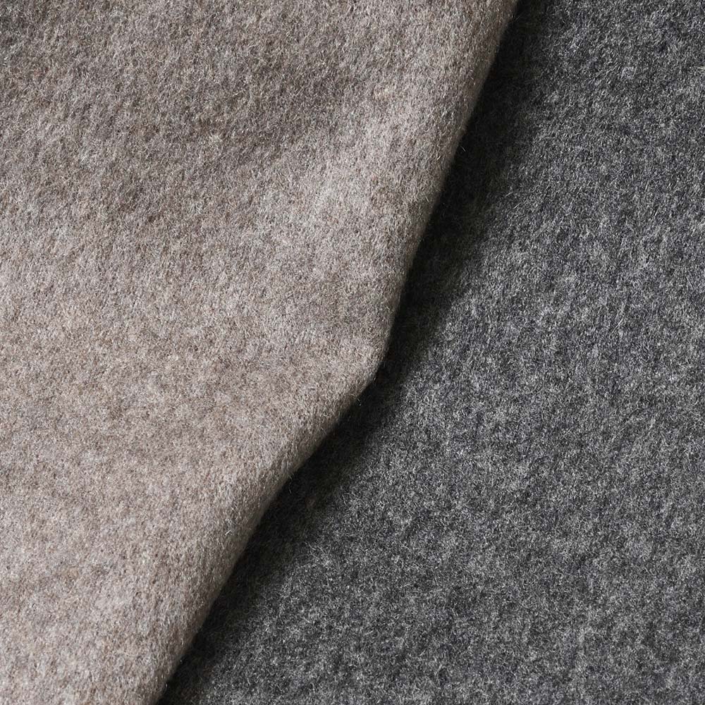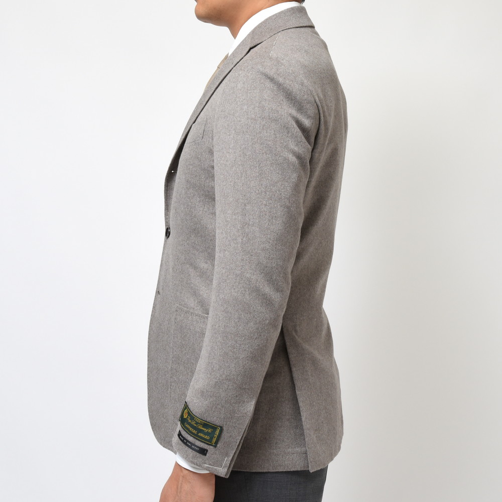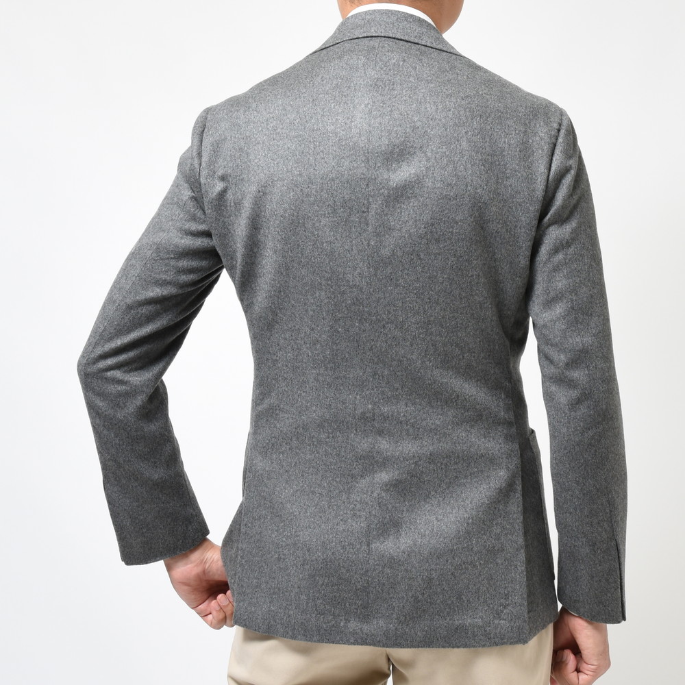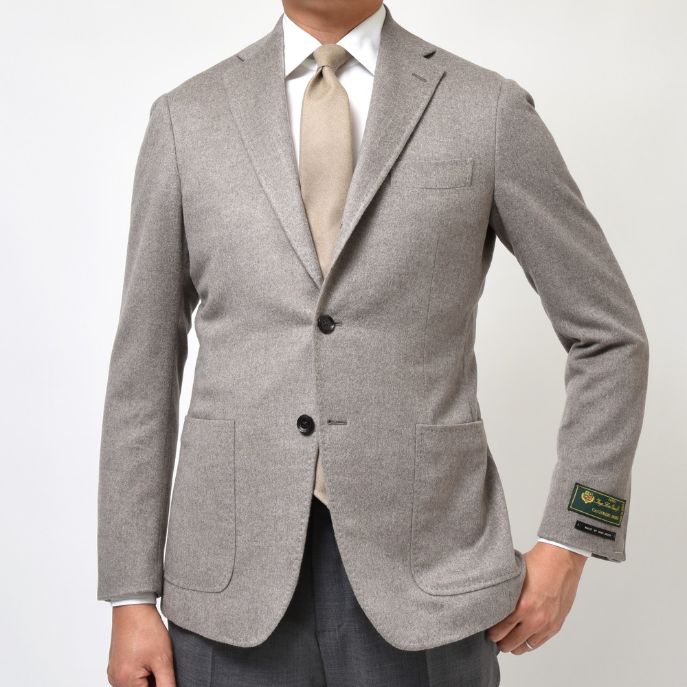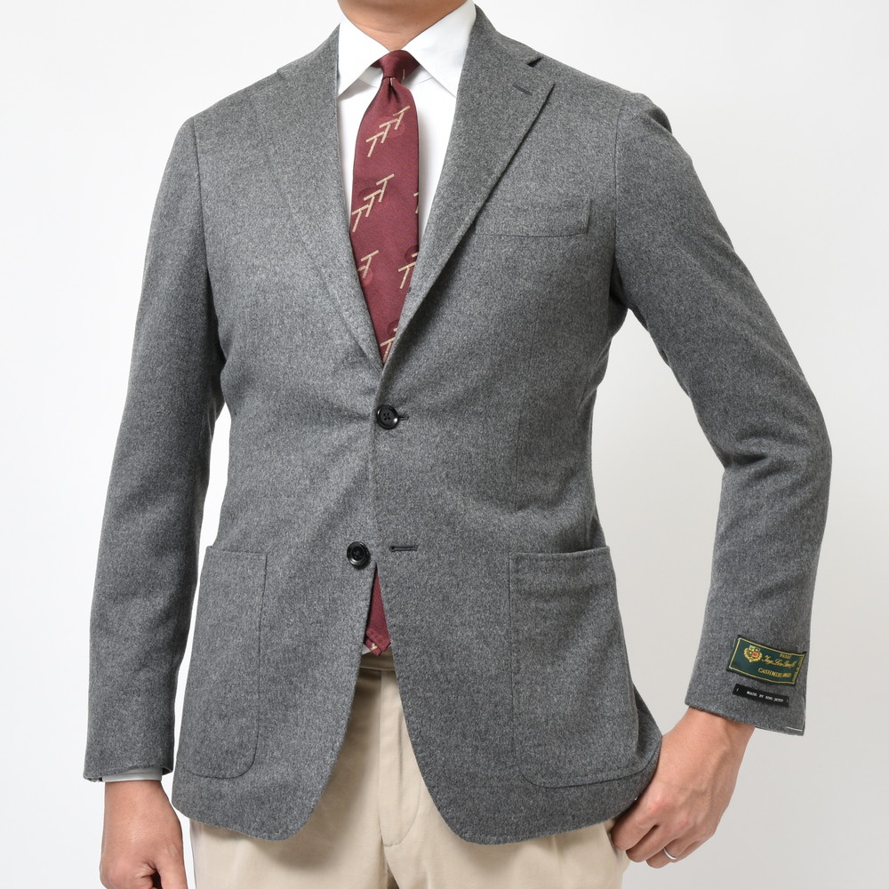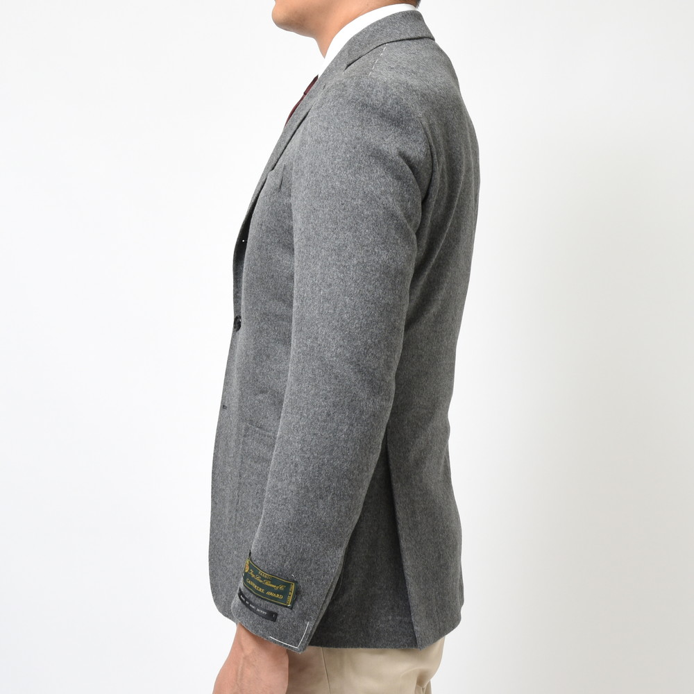 原毛の良さから来る風合いの良さと発色の美しさが魅力のLoroPianaロロピアーナ社のカシミアフランネルを贅沢に用いた一着。多数色が提案されている中でも特に素晴らしいと感じたグレージュとグレーでオーダー致しました。