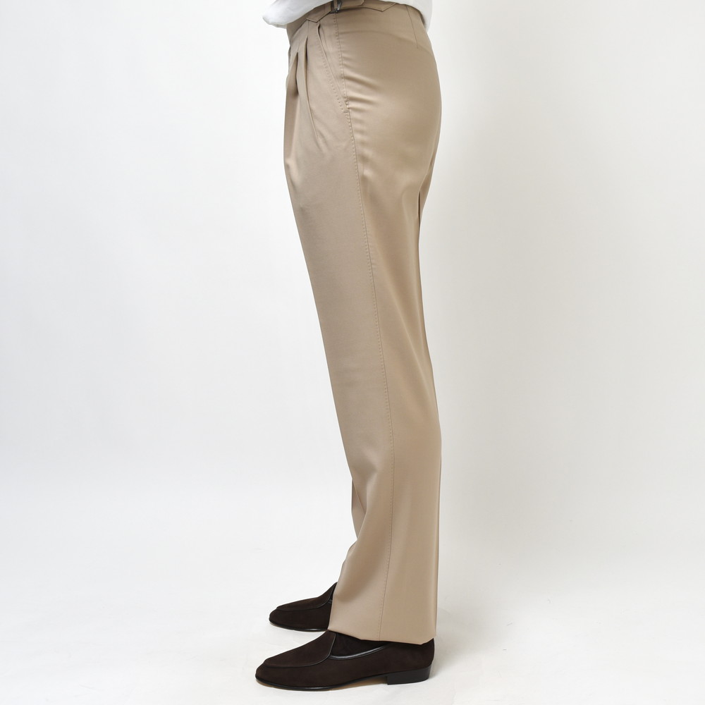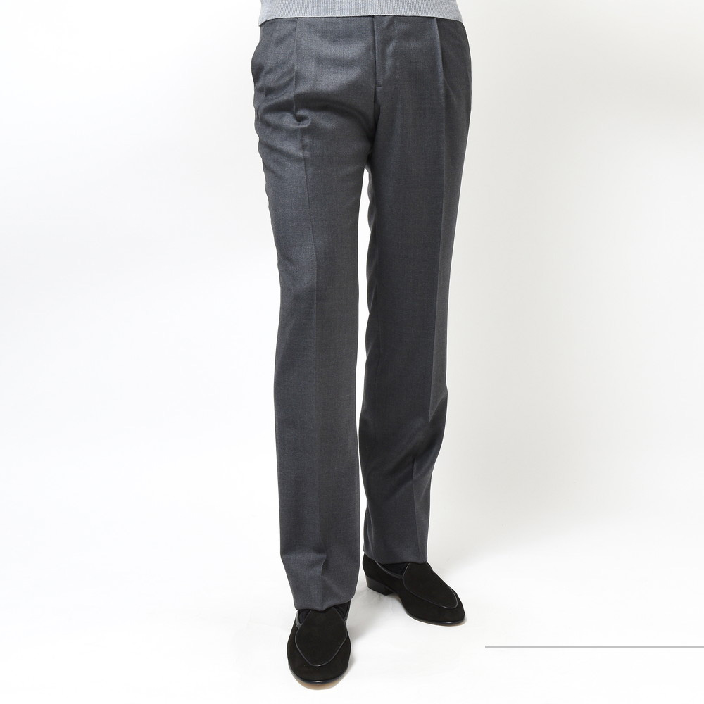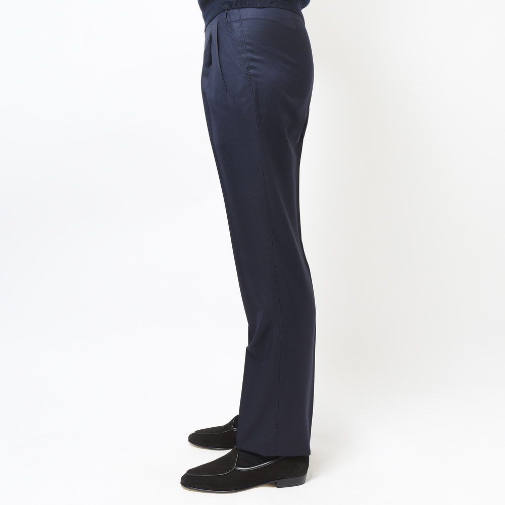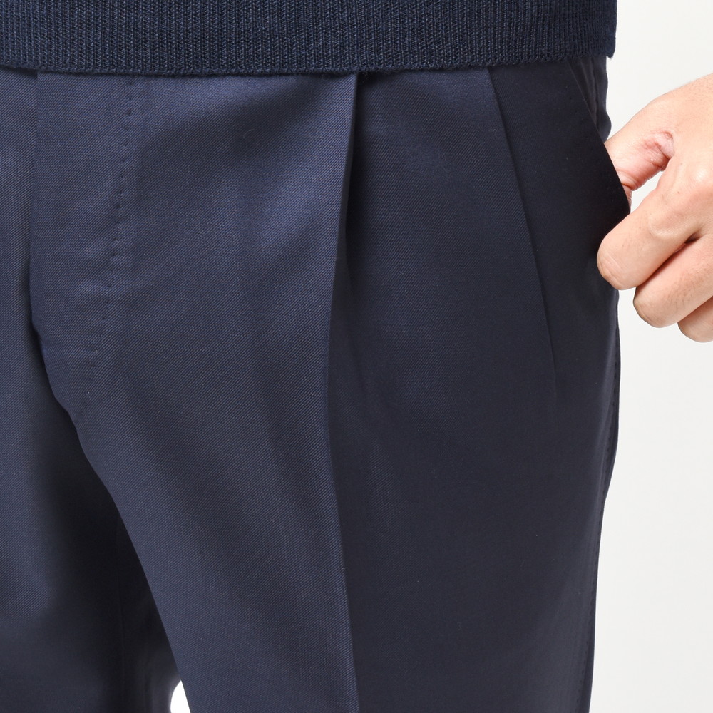 ドレスパンツとして最もベーシックな生地の一つであるVITALE BARBERIS CANONICO社の上質なウールサージ生地を用いており、サルトリアルなテクニックを駆使することで非常にエレガントな仕上がりになっています。