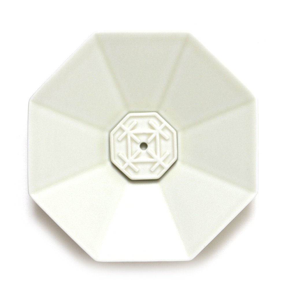 ポーセリンインセンプレートオクタゴンの中央に付属の香立てをセットし、その穴にお香を挿し、プレートに灰が落ちるようにセットしてください。付属の香立ての穴は、KITOWAインセンスの径(太さ)に合わせて作られており、他の径の細いお香を使用すると上手く挿さらずに灰がプレートの外に落ちることがありますので十分に気をつけてください。