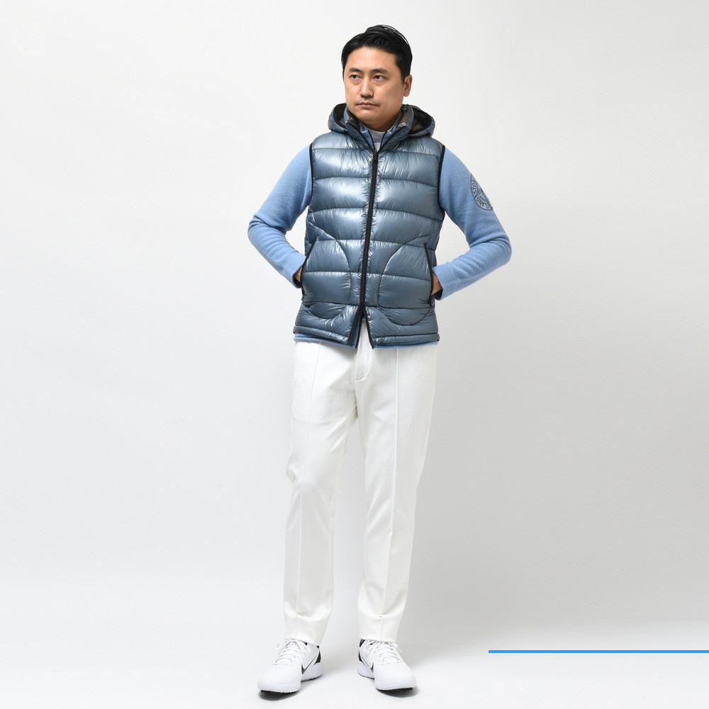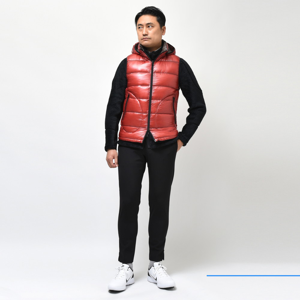 様々なスタイルのダウンベストが提案されていますが、HERNOの中で最軽量のモデルがこちらですね。7デニールの超極細糸を用いて織り上げられたテクニカルな一着は発色も素晴らしく、ゴルフ場で映えること間違いなしかと。
