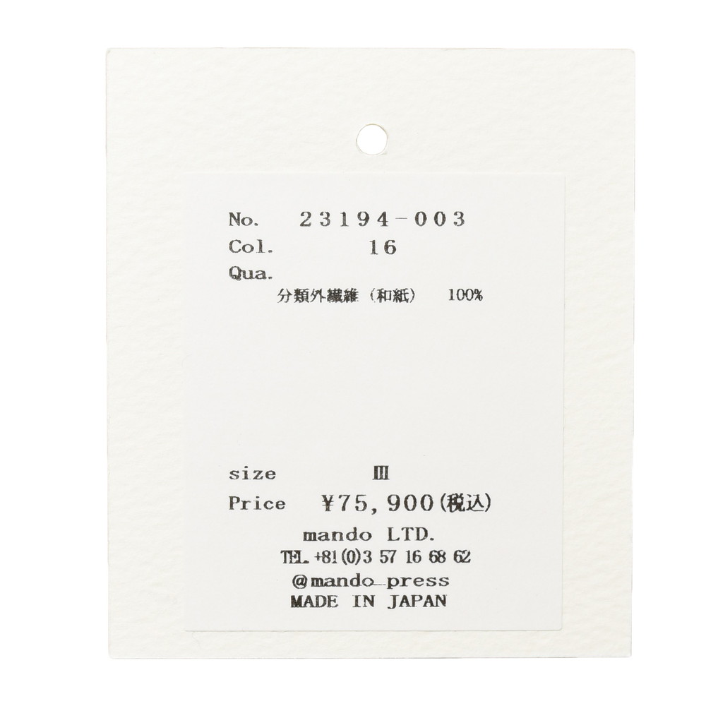 日本では古来から馴染みのある和紙を使用したmando(マンド)のトラッカージャケット。化学繊維+和紙という組み合わせは近年よく見かけるようになりましが、こちらの和紙100%というのは中々珍しいタイプです。通気性、速乾性、に優れているのはもちろんの事、実は軽量で耐久性もあるので春夏シーズンにはうってつけの素材なんです。