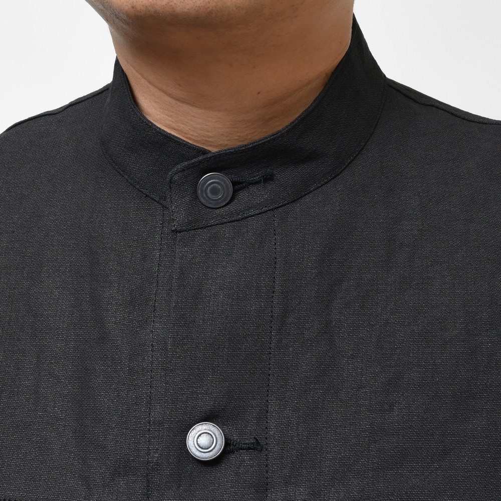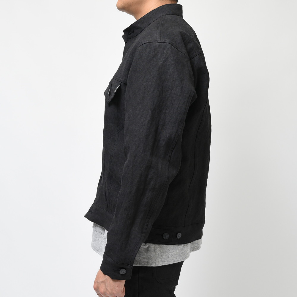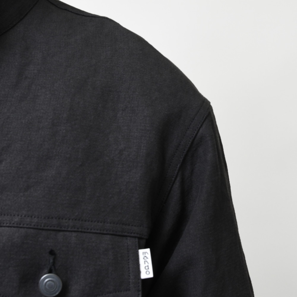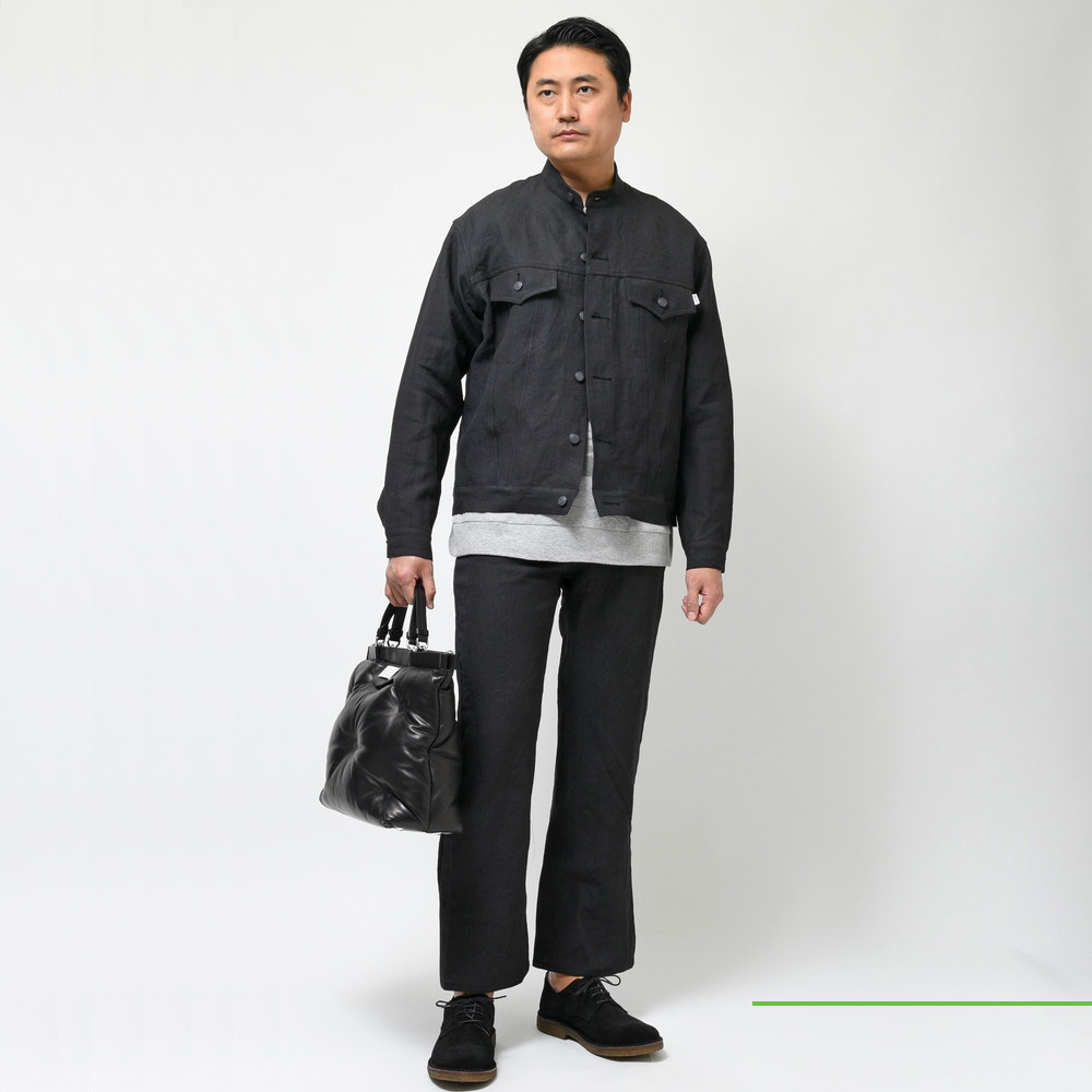 程良く緩さのあるトラッカージャケットがベースになっていますが、襟部分をスタンドカラーにすることによってmando(マンド)らしい抜け感を演出、素材の雰囲気も相まってブラックながらも重くなり過ぎない見え方になっているのもポイント。
