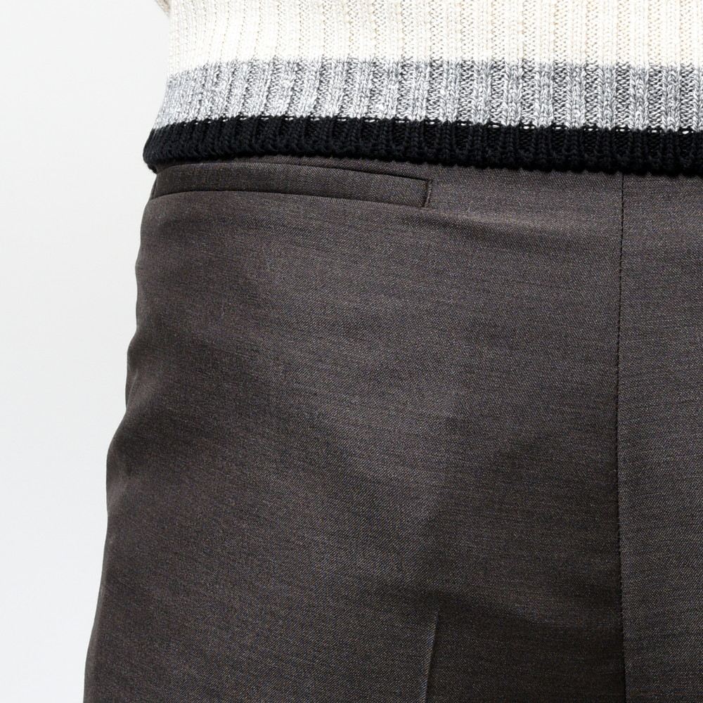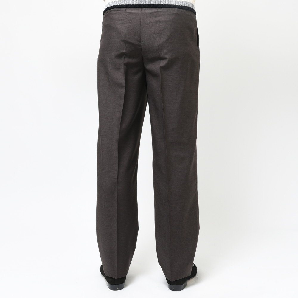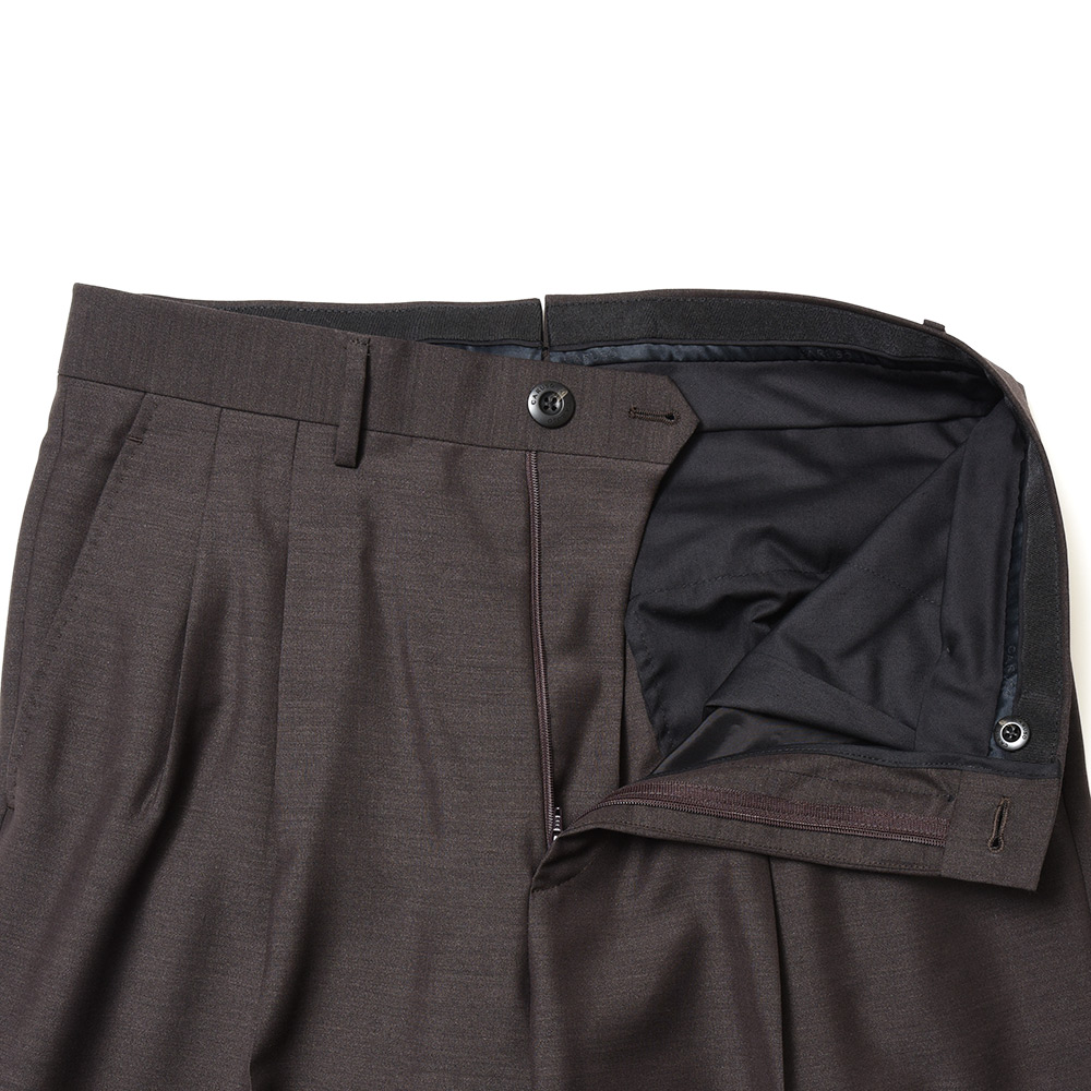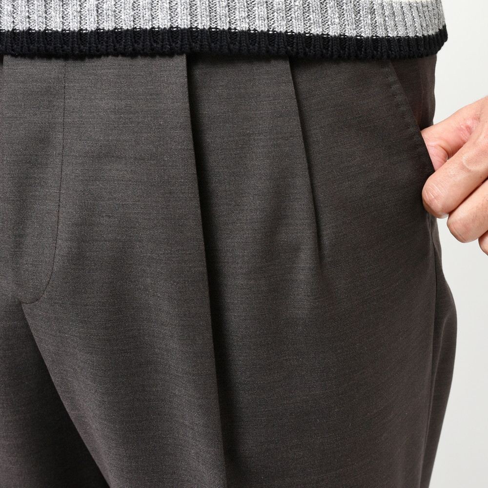 ハリコシとしなやかさを併せ持つウール×モヘア×シルクの三者混ファブリックは高級感があり、深みのある発色はキリッとしつつエレガントなスタイルを約束。組下パンツと思って簡単にスルーするのは非常にもったいない仕上がりだと思います。