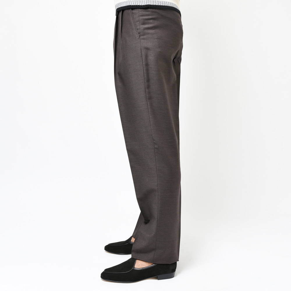ウエストの2プリーツは程良い立体感と丸みを生み、裾にかけて緩やかに絞られたラインはワイドシルエットをナチュラルに整えています。