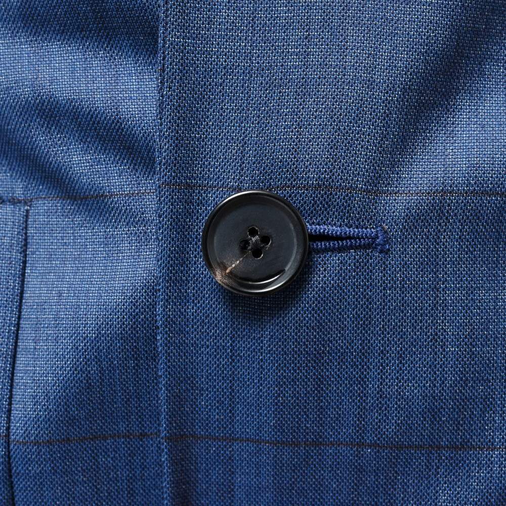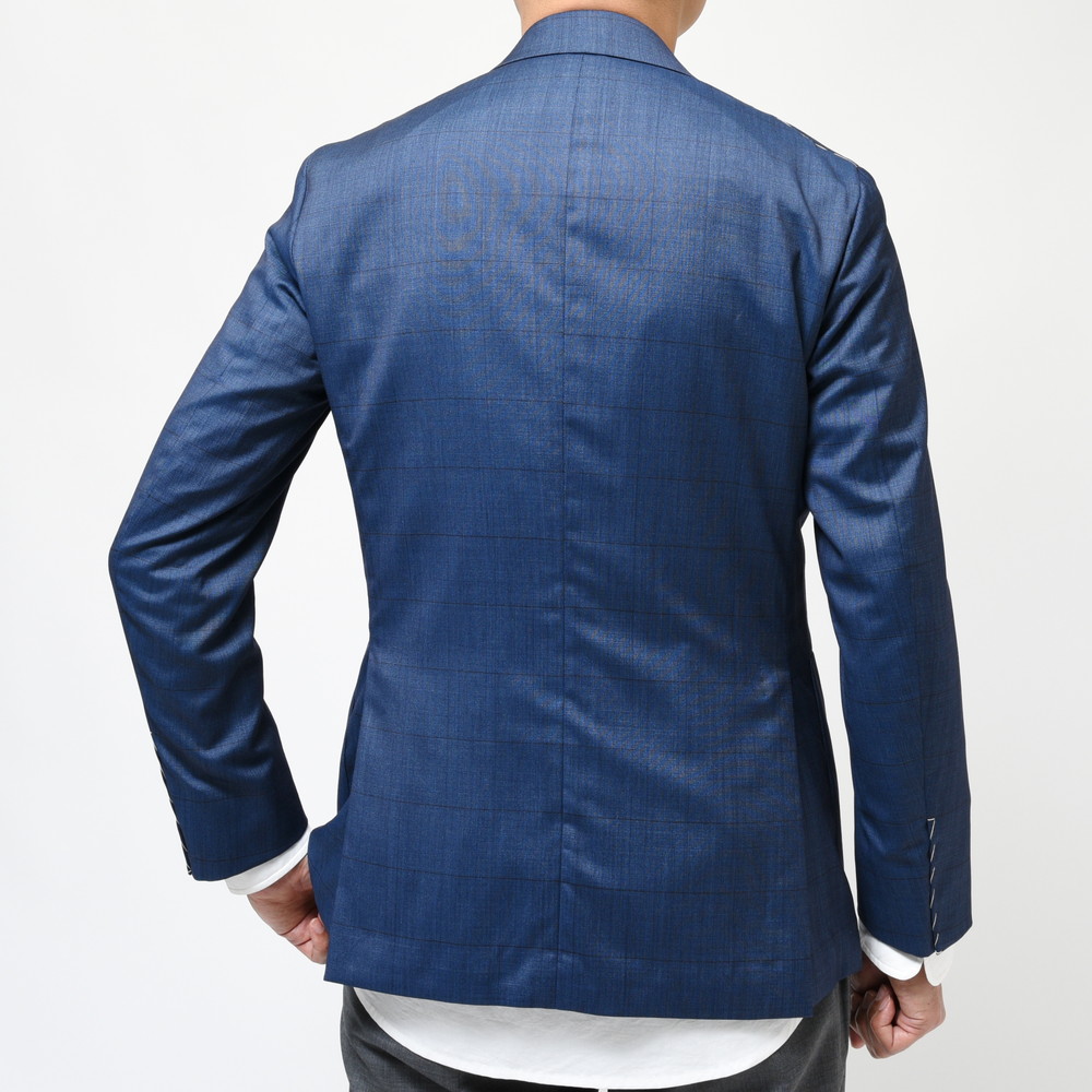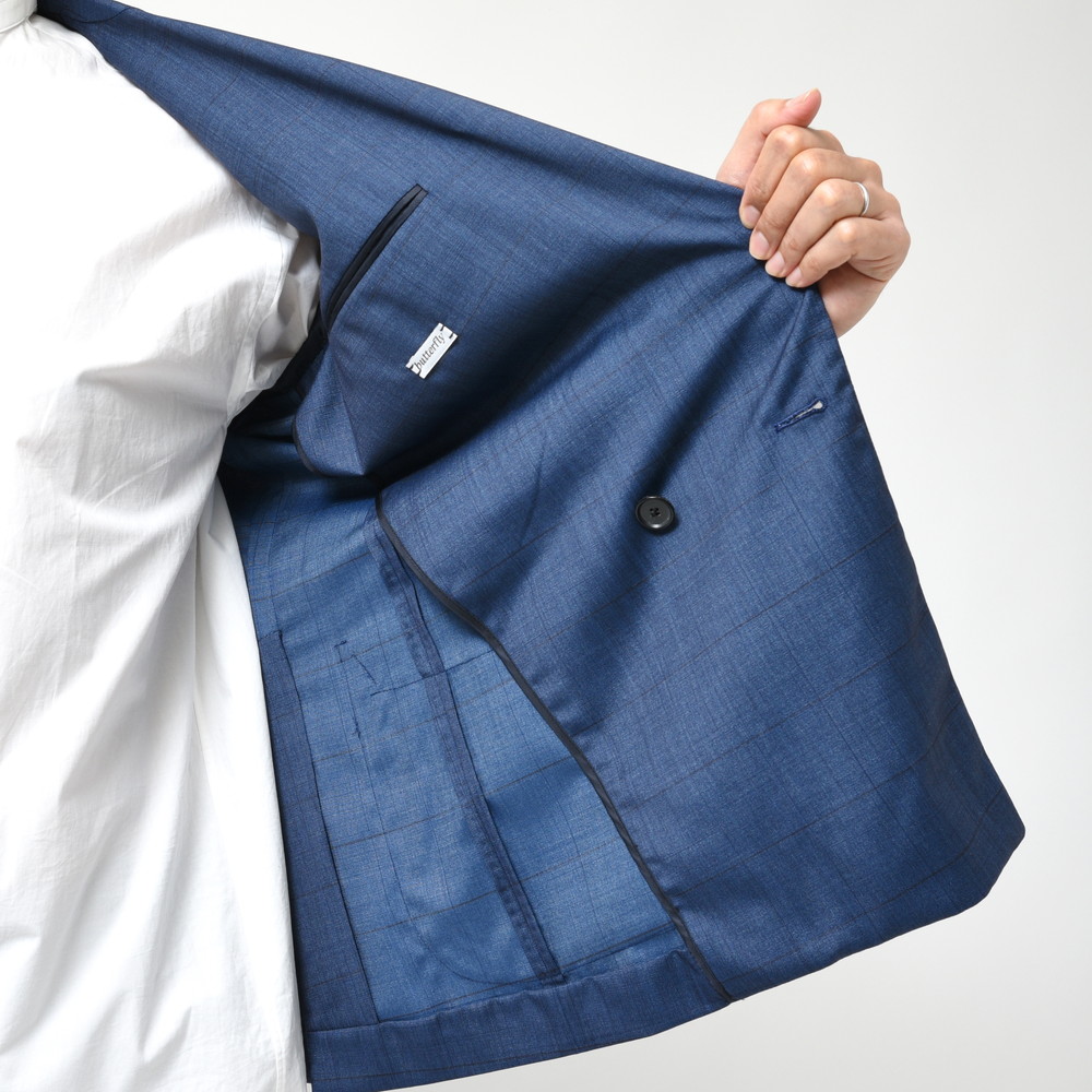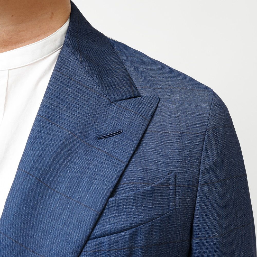生地は春夏シーズンらしく爽やかで色気のあるダークブルーのウインドーペーン。シルクミックスで程良く艶やかで、柄の主張はかなり控えめながら全体としては凄く華やかな見え方に仕上がっています