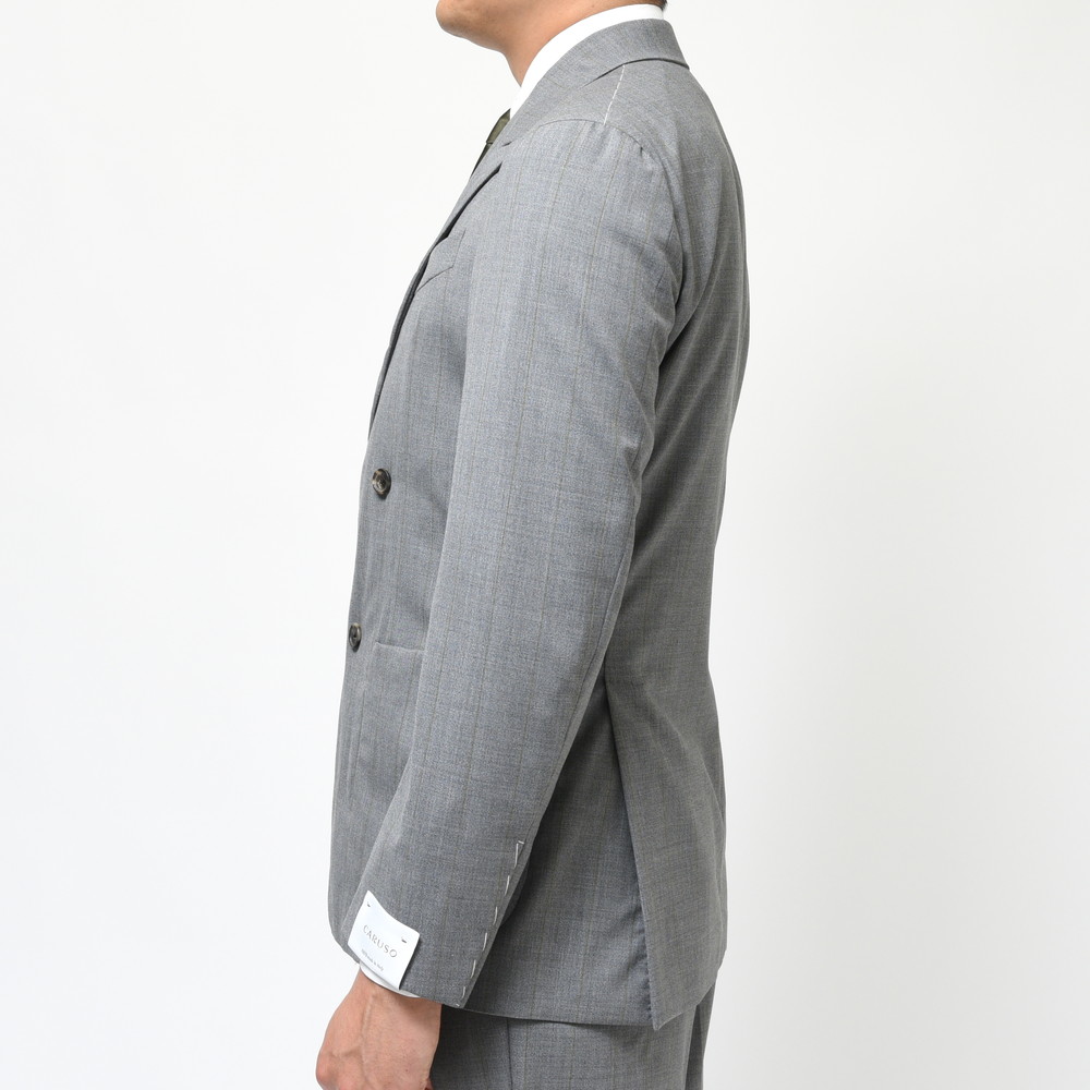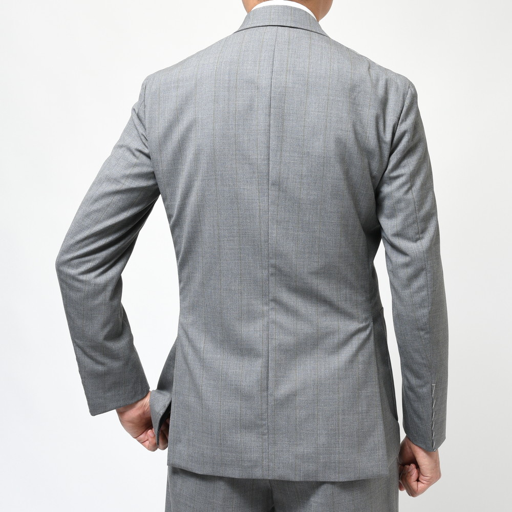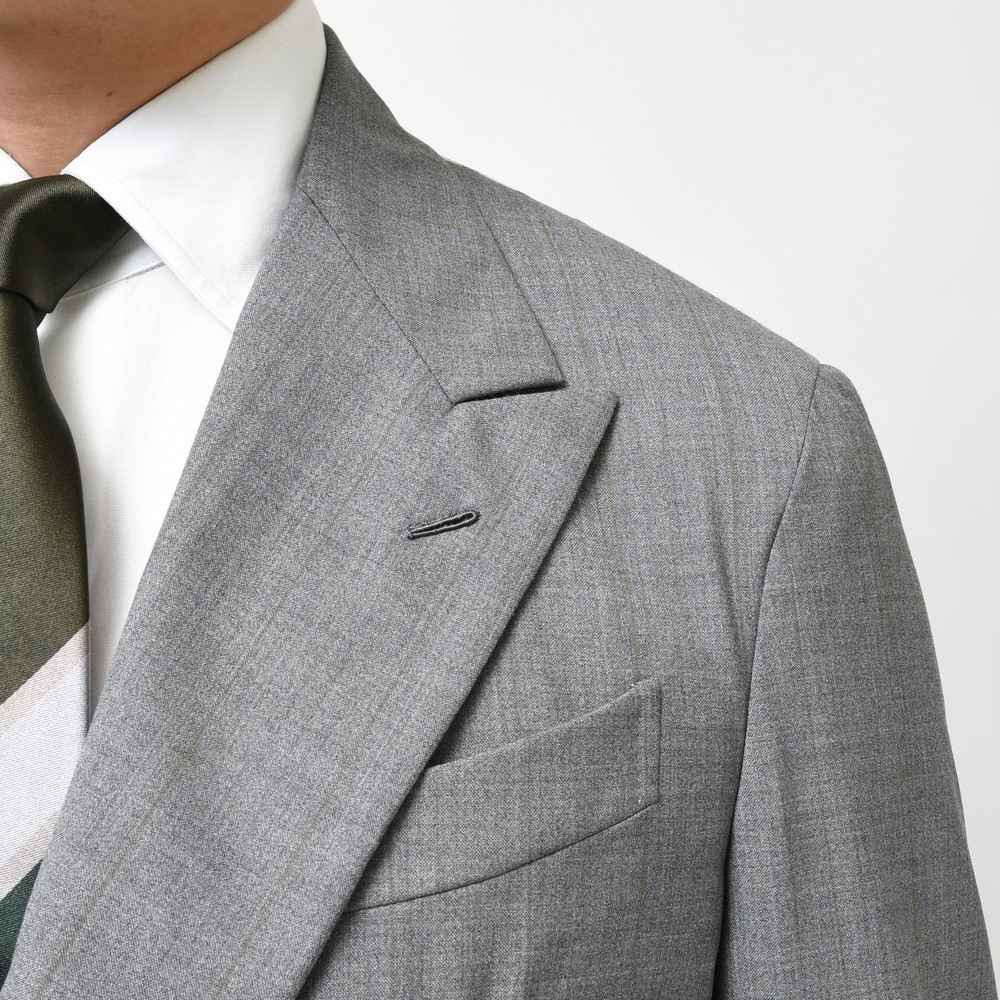 CARUSO(カルーゾ)の“BUTTERFLYバタフライ”4Bジャケットで採用したウールシルクファブリックは一見中庸なグレーですが、よく見るとペンシル状にナローなストライプが配されており、且つグリーンというマニアックなカラーをチョイスしているところがポイントです。