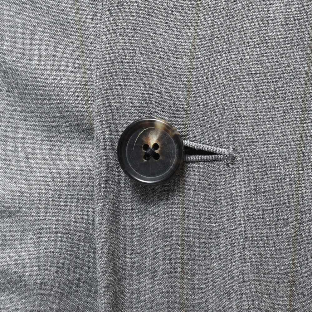 2パッチ4B、サイドベンツ、ラペル幅10cm、袖アンフィニッシュド(本切羽・開き見せなどの釦付け修理が必要)です。