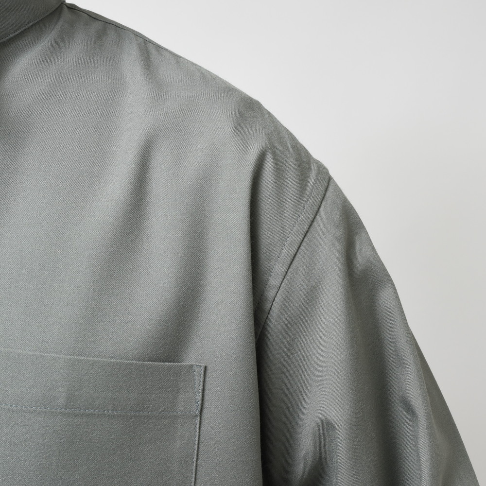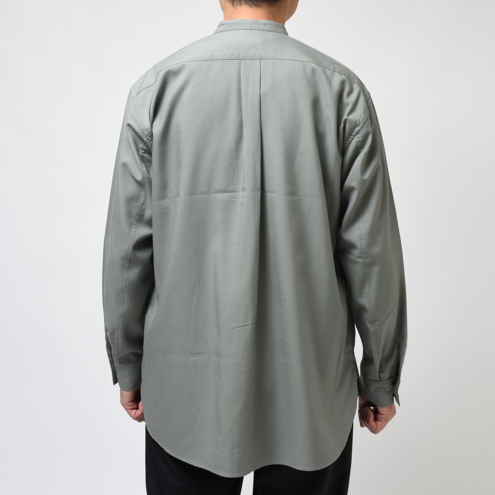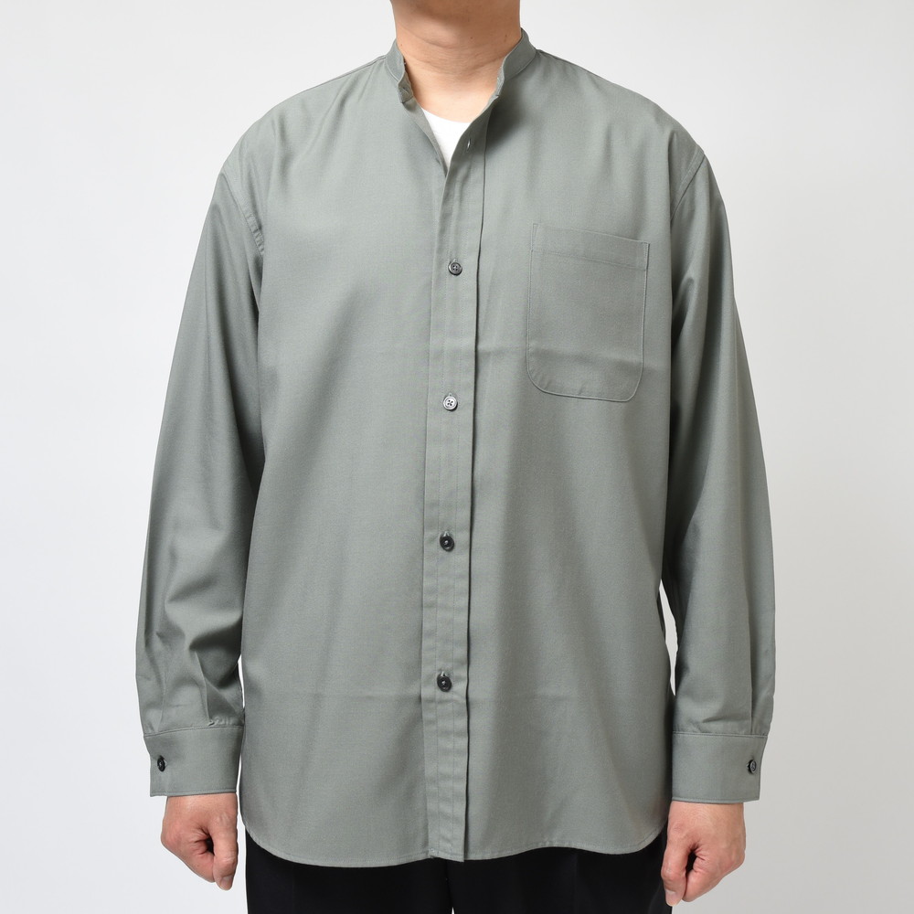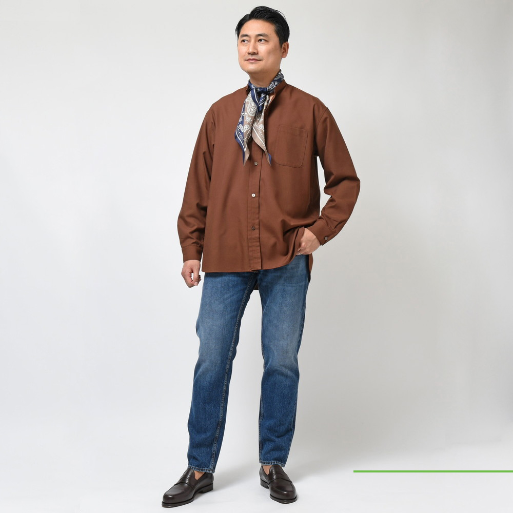 バンドカラー特有のフリーダムなムードがありつつも、コットンやリネンにはないキリっとした生地のムード、品格とまでは言いませんが、スタイルに一定の品の良さをもたらしてくれるのは間違いないかと。