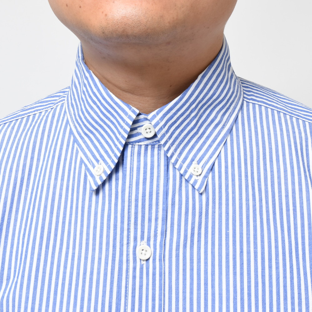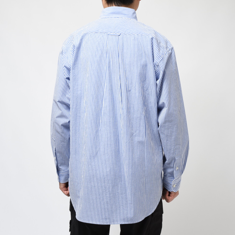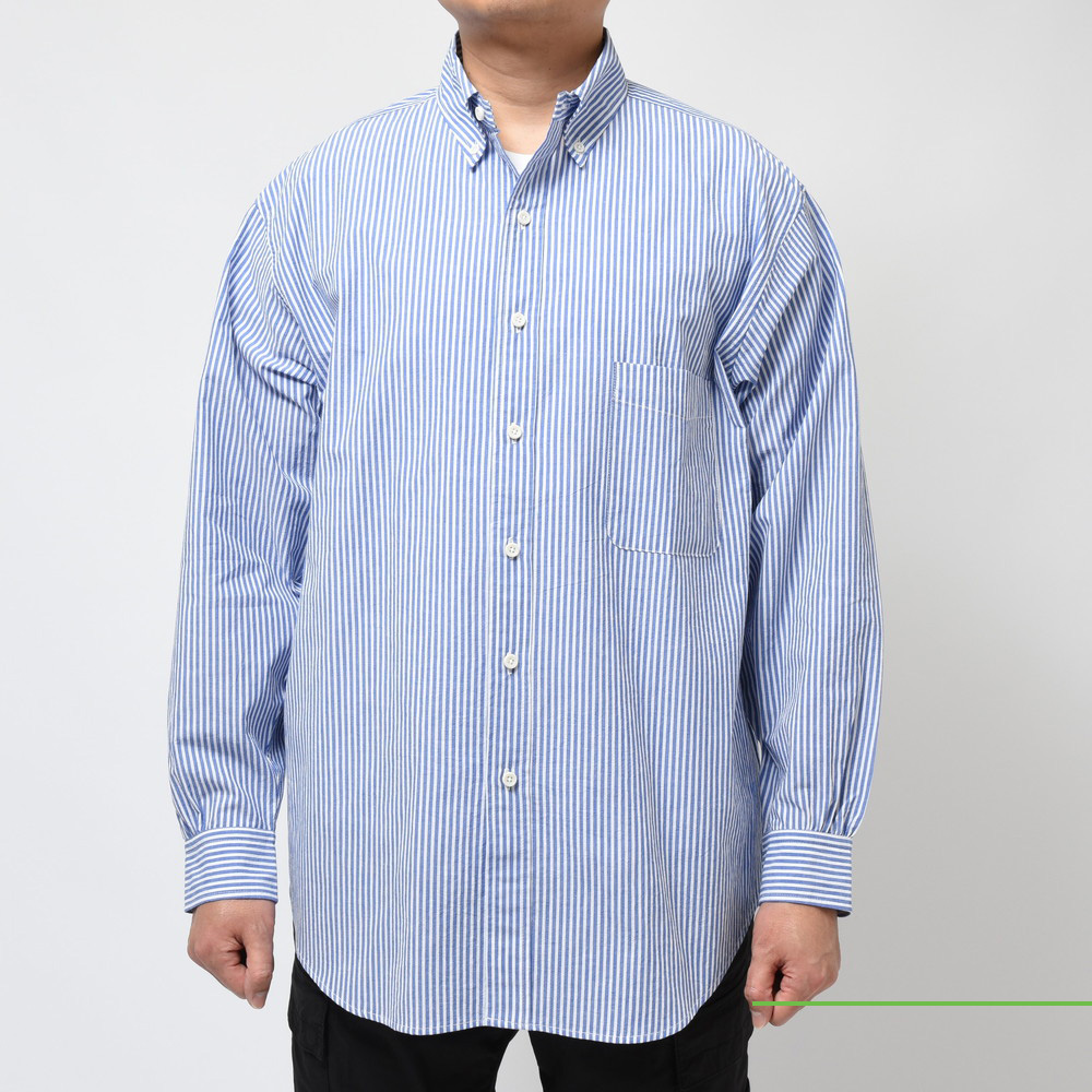 爽やかな色合い、ストライプにボタンダウンカラー、ある意味王道の組み合わせと言いますか、それをシルエットで上手く現代的に表現している一着と言う印象でして、フィット感に余裕があるのもポイント、オーバーサイズ過ぎずタイト過ぎない絶妙な塩梅。これが有るとスタイリングに安定感が増すというのは間違いないかと思います。