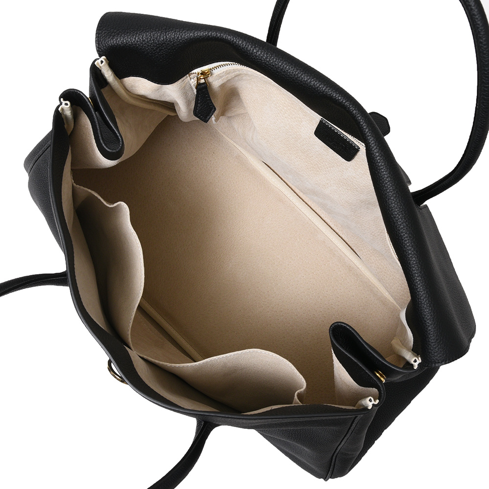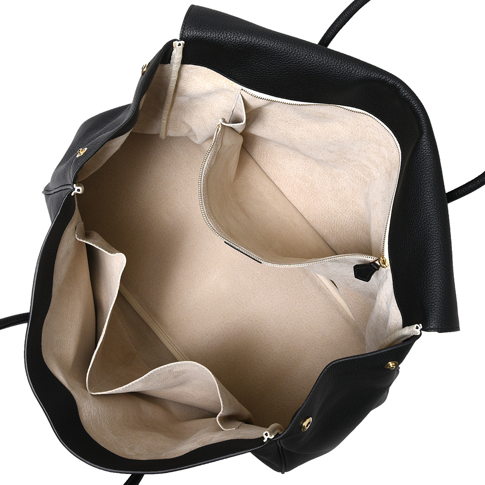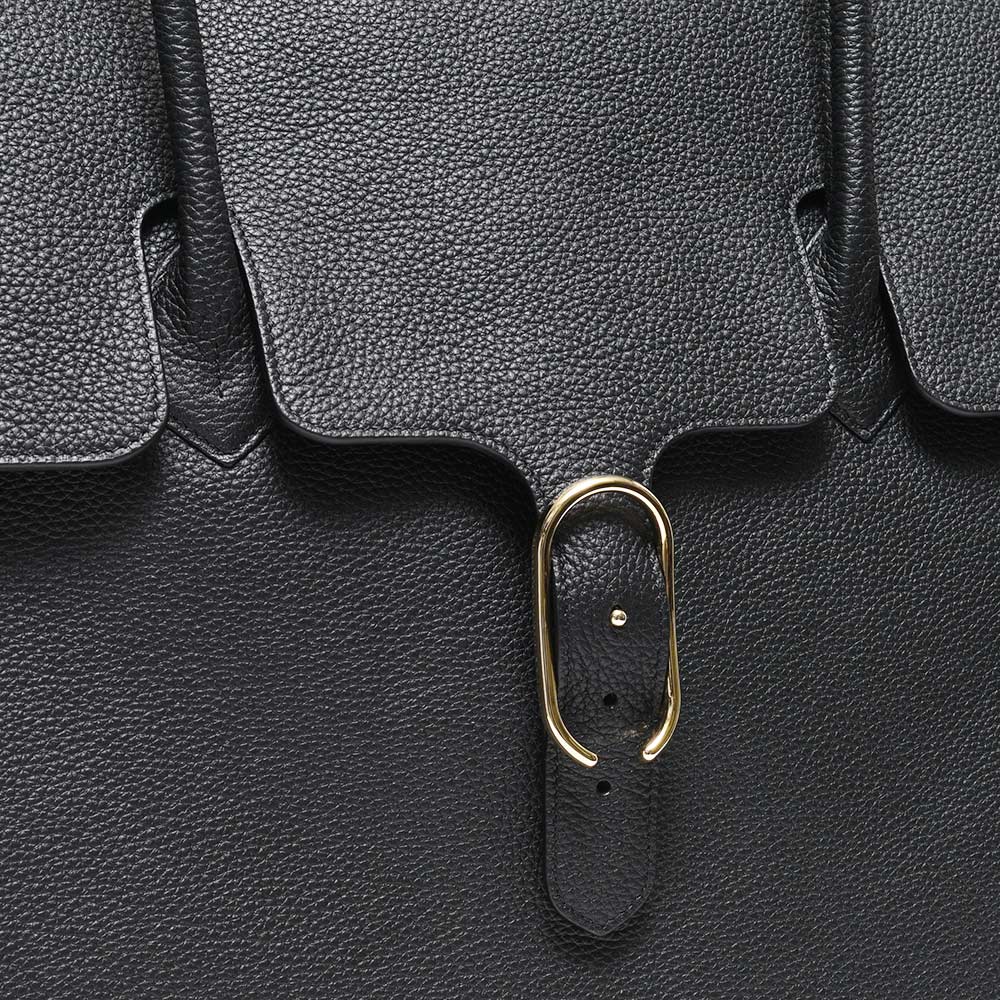 背面から続く個性的なデザインのフラップ、内側にはピッグスキンが使用され、バッグの形崩れを防ぐ機能面を備えた高級感高まるディティールです。