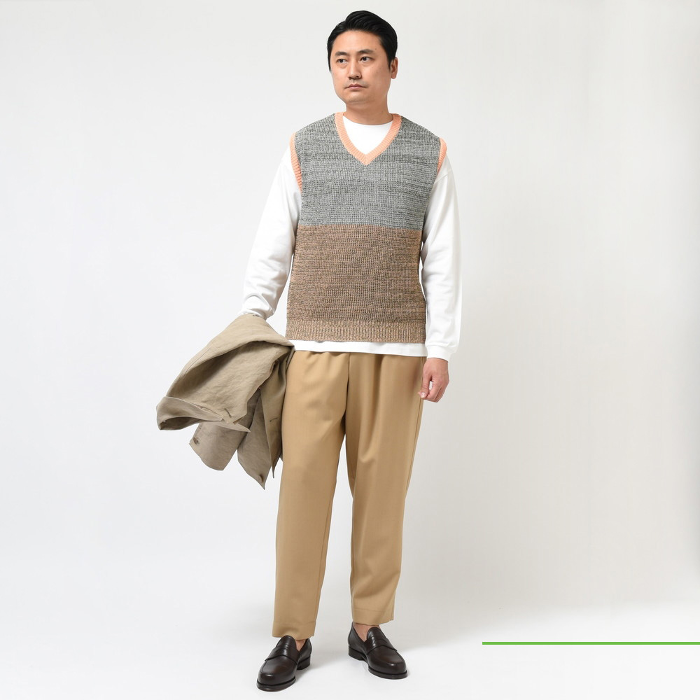 Tシャツにサンダル、ジャケットにレザーシューズ、真逆な合わせであっても対応出来てしまう汎用性の高い一本、実際に購入して穿いてもらうと毎シーズン欠かさずオーダーしている意味がご理解いただけるかと思います。