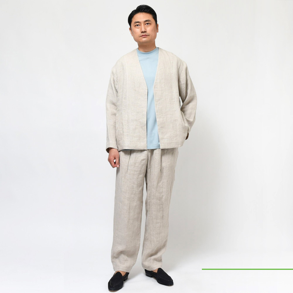 gujiではそんなセットアップを多数ご用意していますが、カジュアルテイストの中で確たる品を漂わせるのがAMBELLで、こちらのリネン素材の物はその代表格ですね。