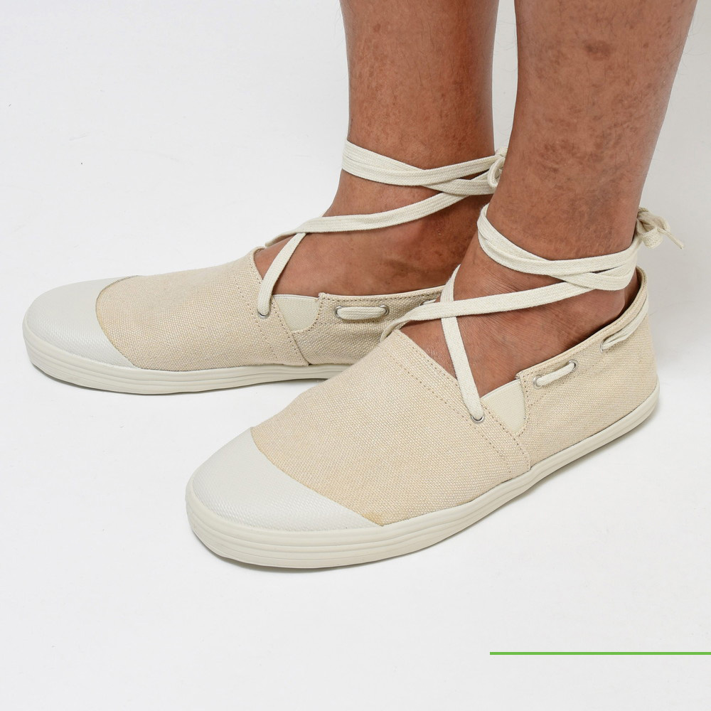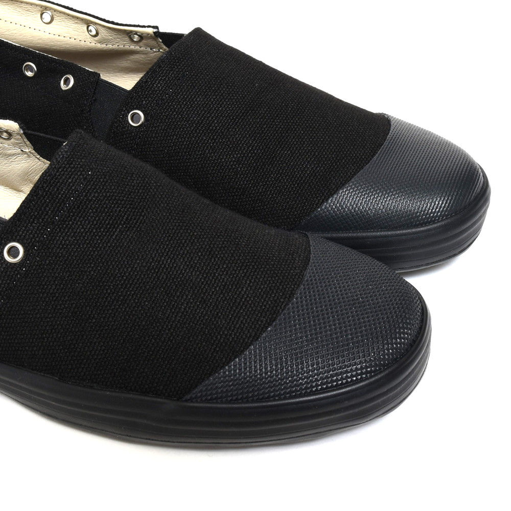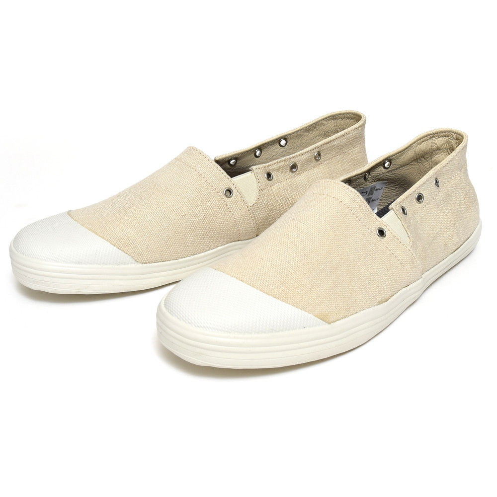 シューズの両サイドにエラスティックを仕込むことでホールド感と着脱が用意に出来るようになっている為、シンプルなスリッポンとしても活用可能、またシューレースも付属しますのでエスパドリーユとしても使用可能な2WAY仕様。メンズでは珍しいアイテムかもしれませんが、リネンの清涼感とエスパドリーユ独特の抜け感がミックスされることで生まれる余裕は大人のオフスタイルに持ってこいだと思います。