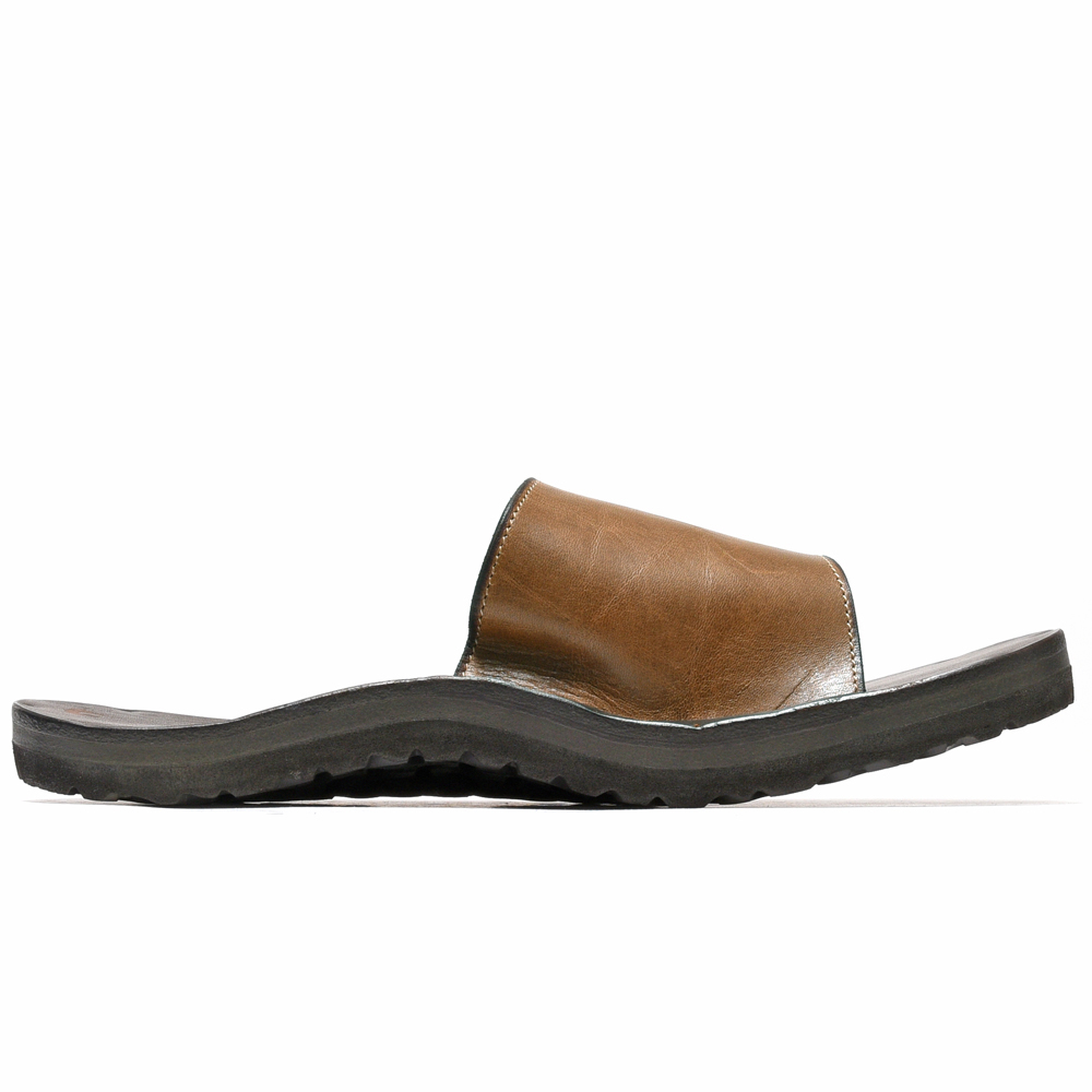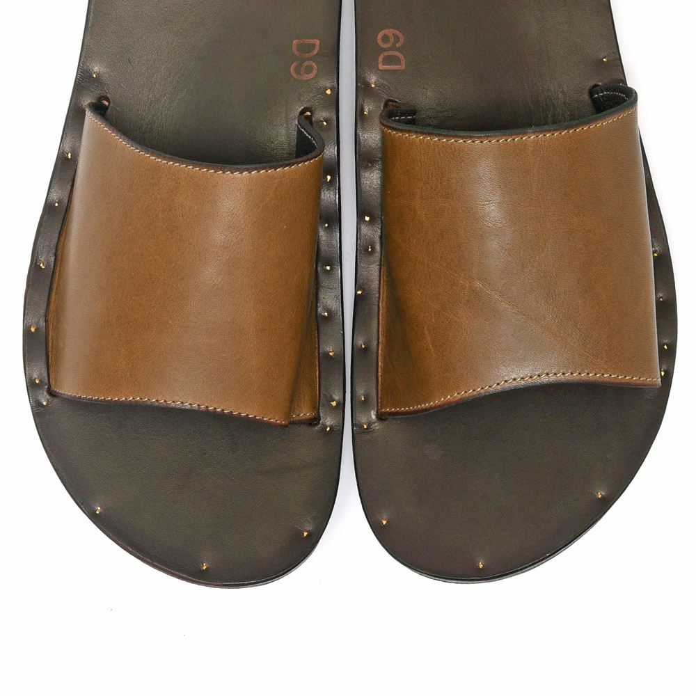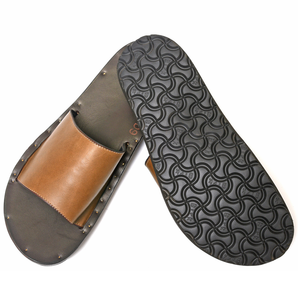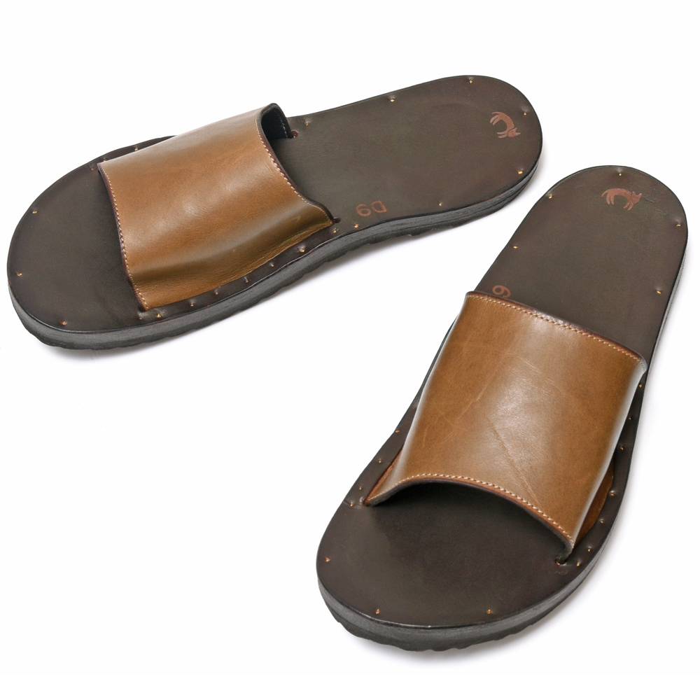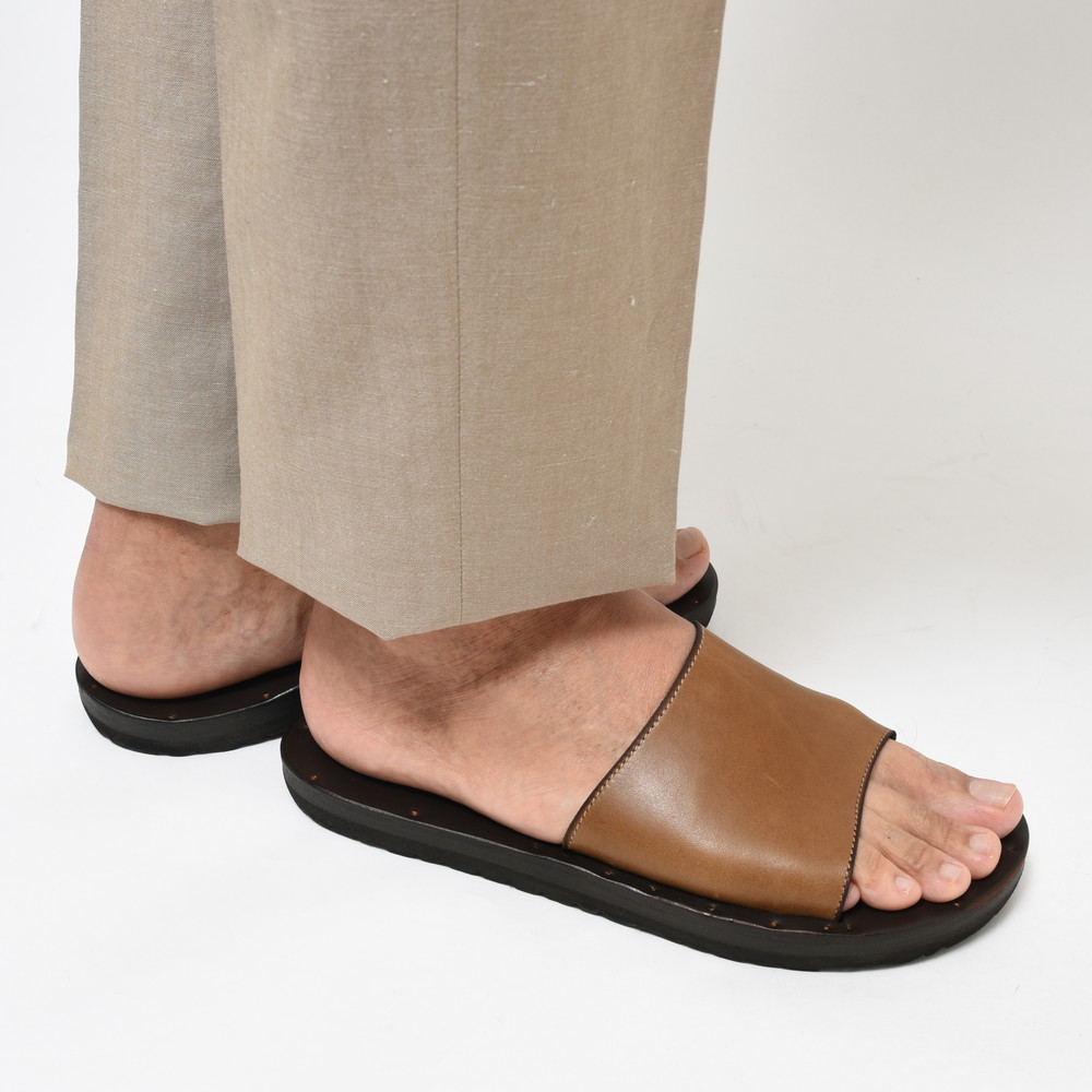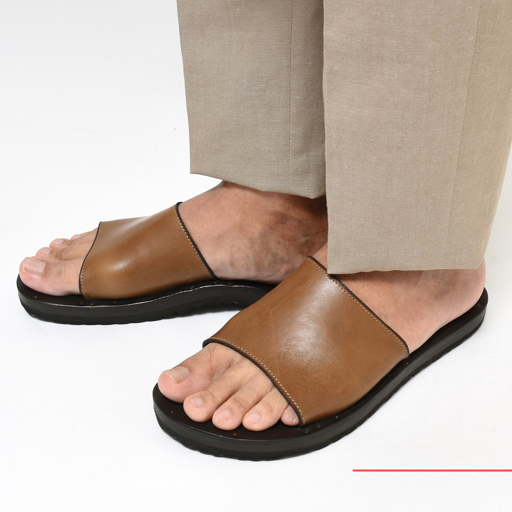 一枚革の幅広ストラップタイプSIMONEサイモンは、特に普遍的なデザインですね。スリッパや突っ掛けというようなタイプですが、男らしくてタフ、それでいてどこか繊細で緻密さを感じさせるムードはさすがの一言です。