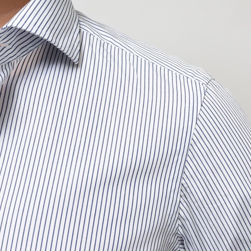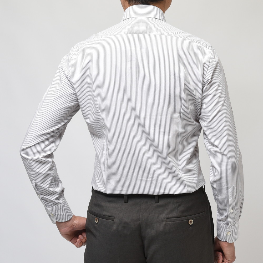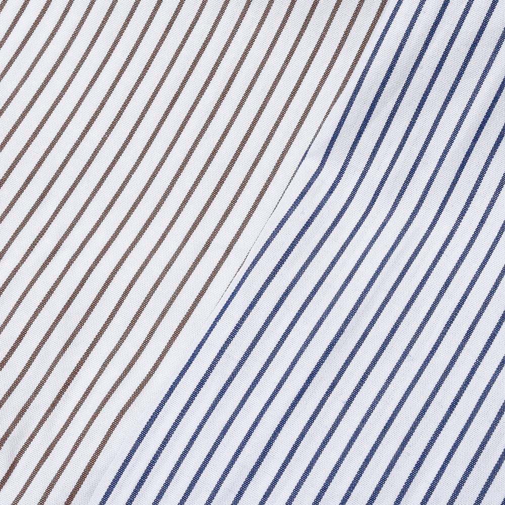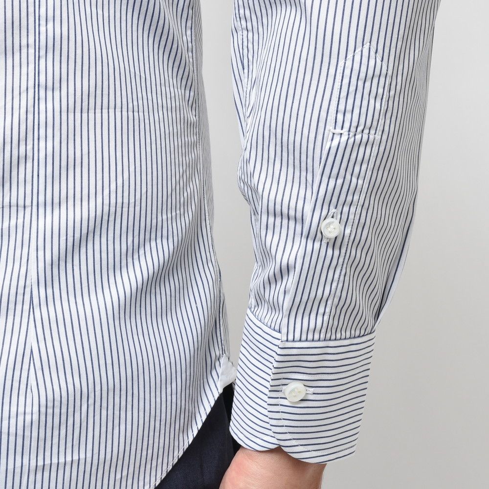 生地はベーシックなストライプ。ロンスト程パキッと出ず、ペンシルほど薄くなく、いわゆる普通の“ザ ストライプ”というイメージなので、スタイリングにおける汎用性が非常に高い仕上がりになっています。