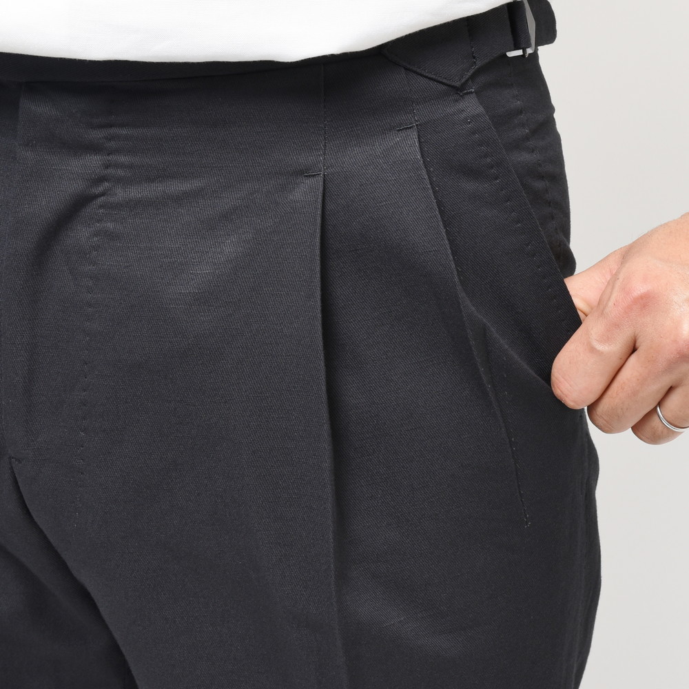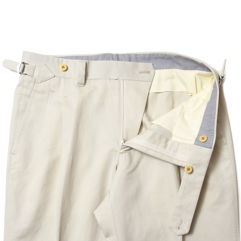 こちらはツイル組織ですが、生地厚を持たせることでヘタることなく長く穿いて頂けるコットンリネン生地を採用。リネンミックス特有の清涼感を保ちながら、ピリッとしたシャープさも感じさせる素敵なファブリックです。