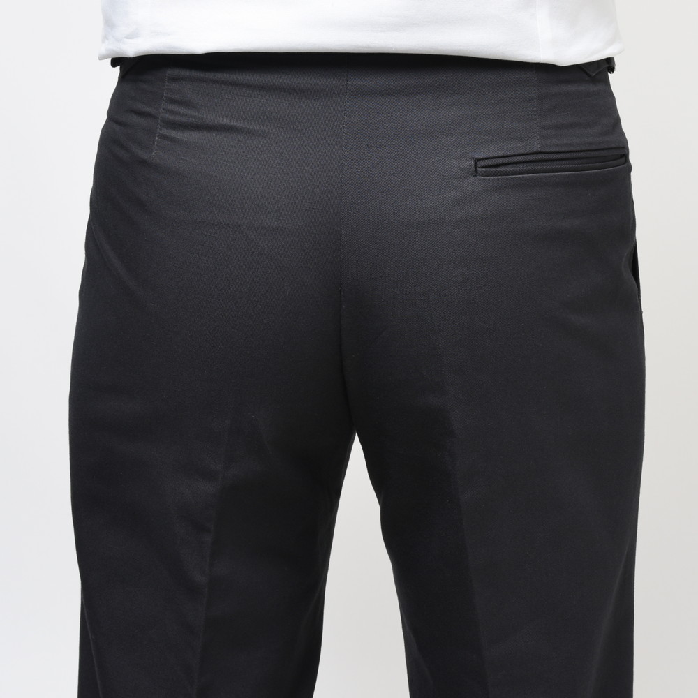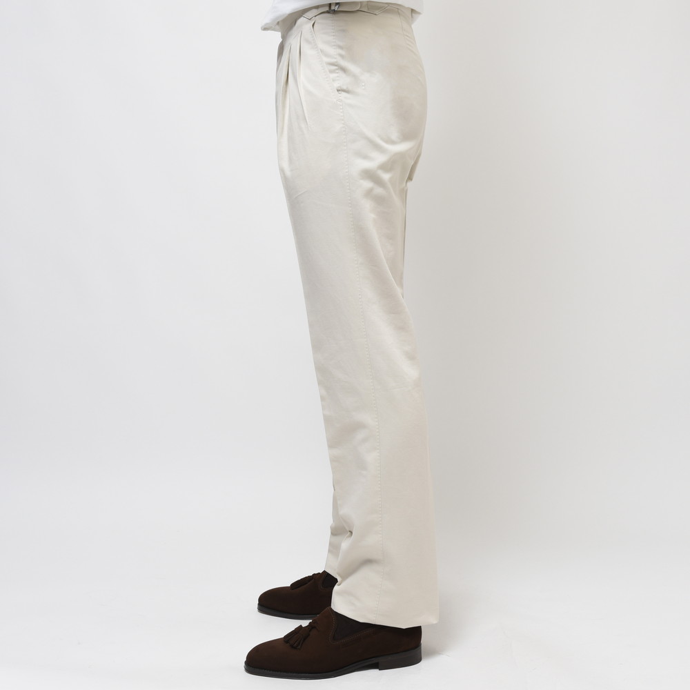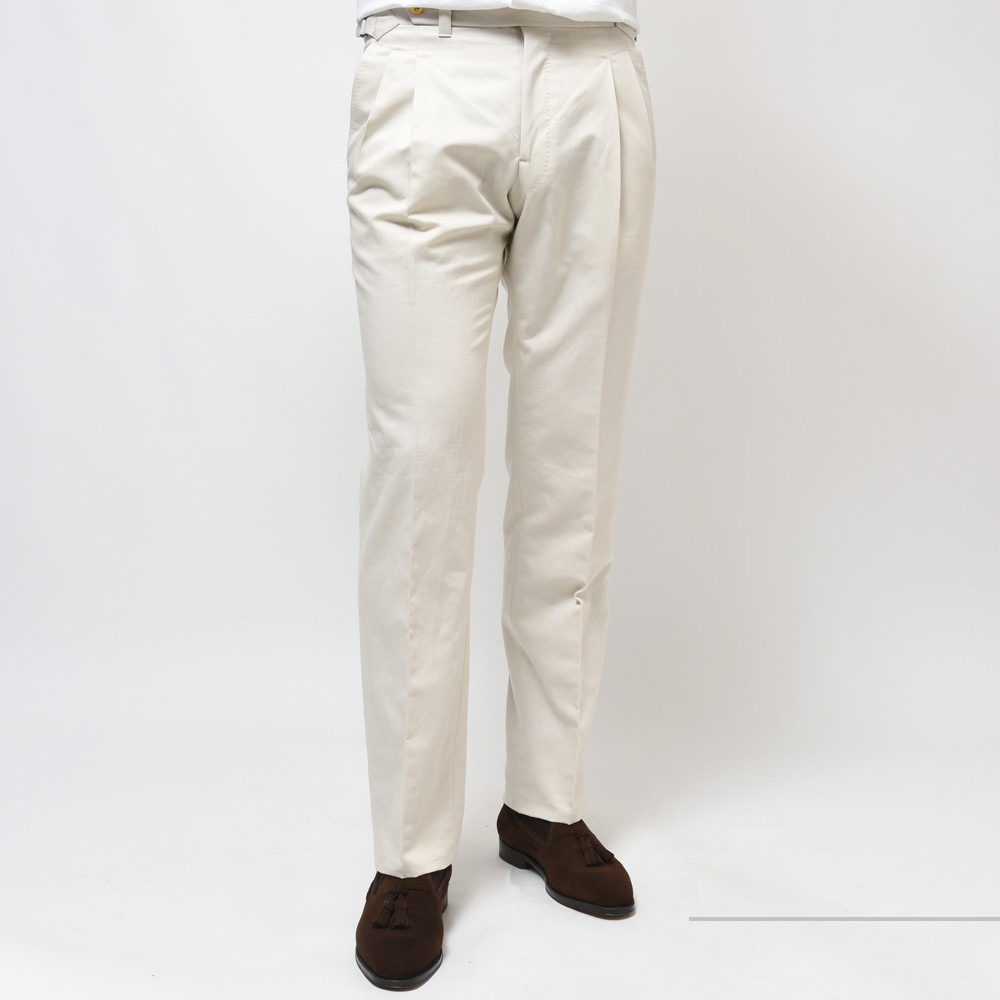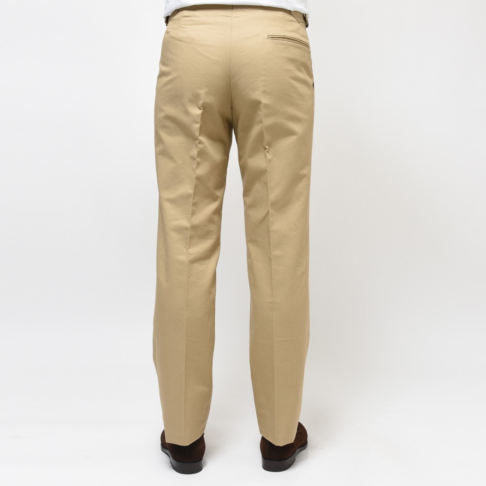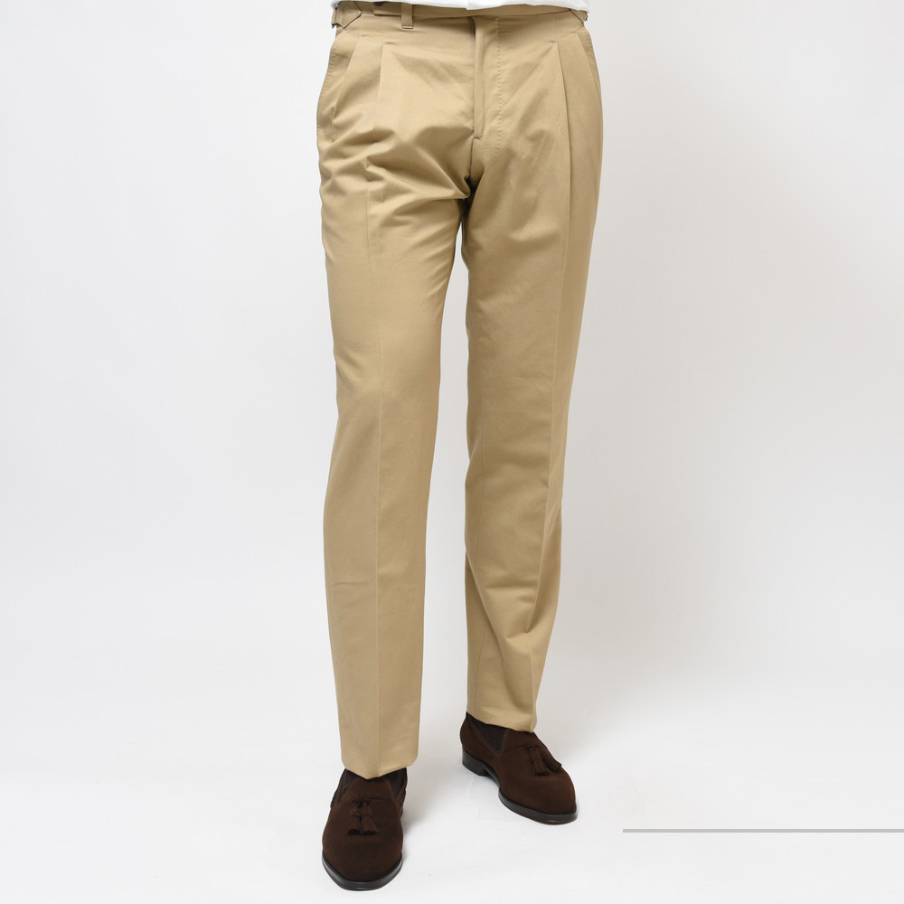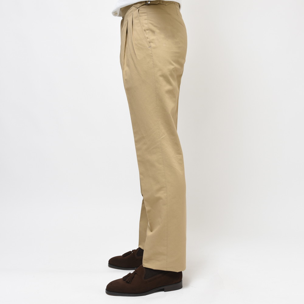 モデルは定番展開している2プリーツ&サイドアジャスタータイプ。ベストレススタイルが良く似合う、膝下から裾にかけてのテーパードをやや控えめにしたモダンなラインが特徴です。