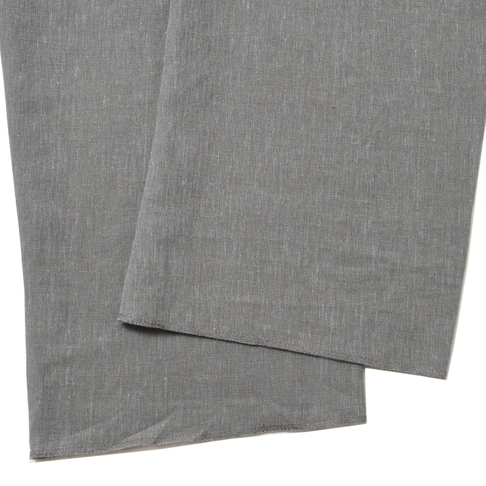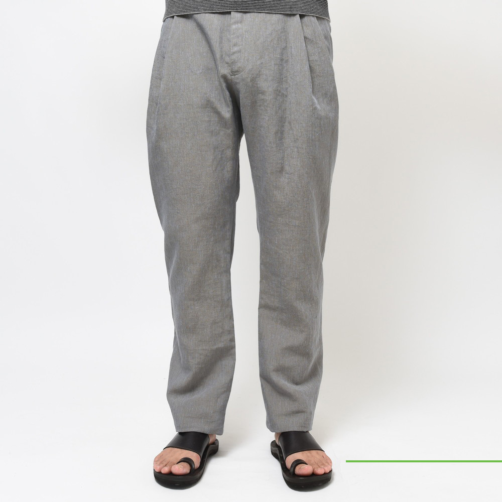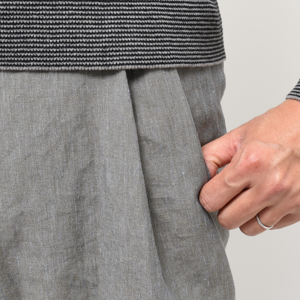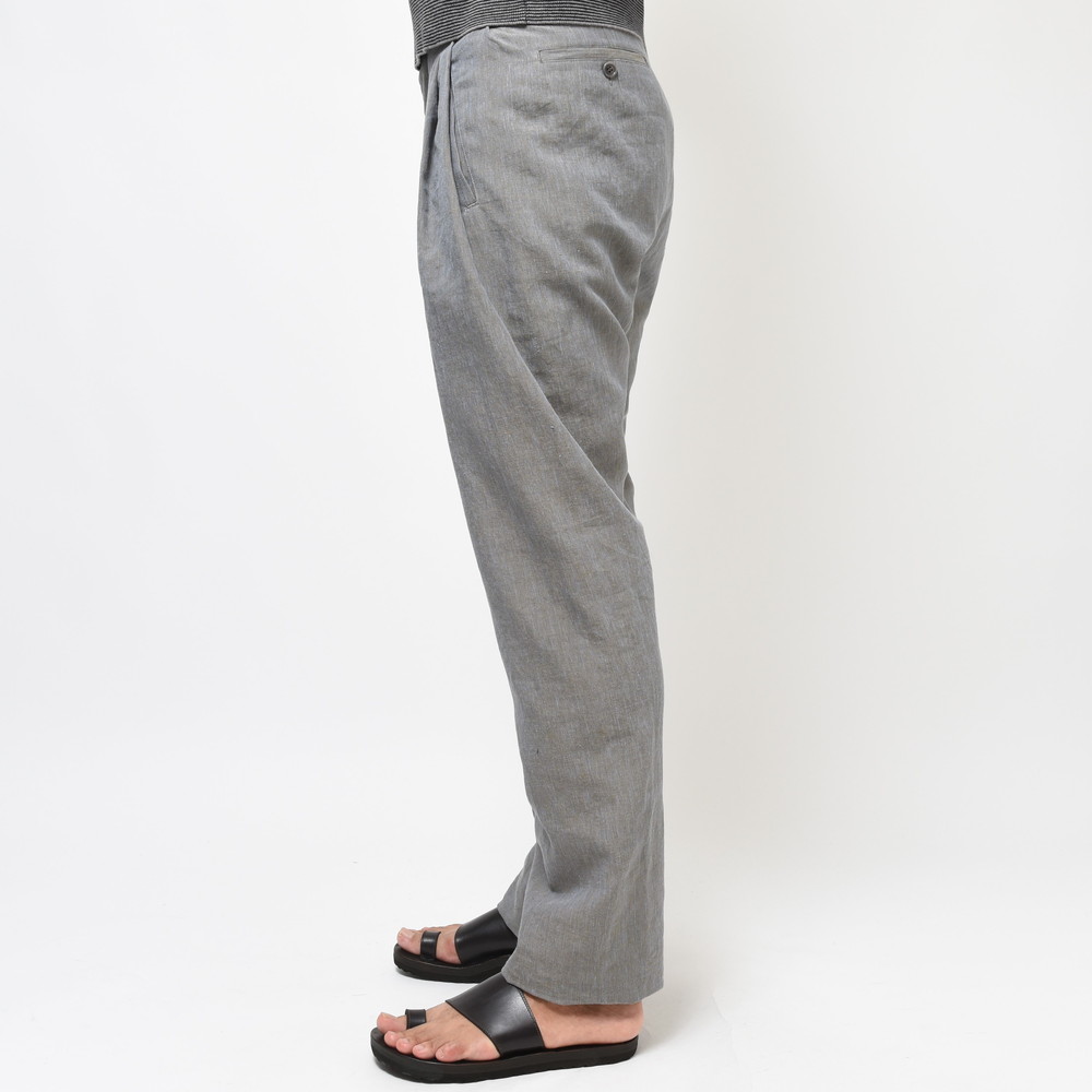 リネンにナイロンを混紡したmando(マンド)の3プリーツサルエルパンツ、シルエットに関してはお馴染みの股上を深く取ったテーパード仕様のゆったりリラックスしたタイプですが、今回は生地にハリとドライ感があるものを採用することでより夏向けのパンツになっています。