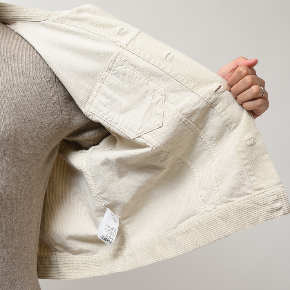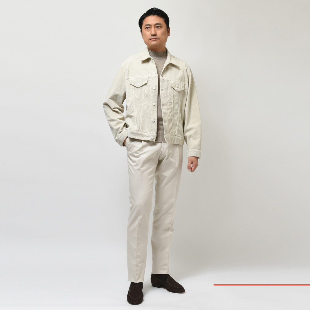 生地は中畝のコーデュロイ。製品染めを施すことで適度なヴィンテージ感が生まれ、美しいシルエットと相まって非常に魅力的なルックスに仕上がっています。