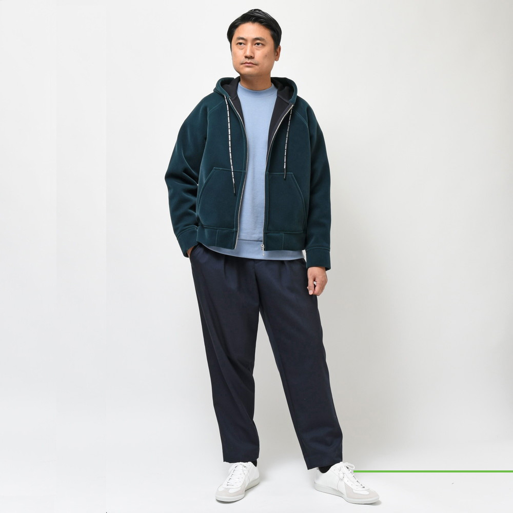 ベーシックなスウェットのフーディとは違いアウター的な雰囲気で着用出来るのが良いですね。意外と使い勝手の良いグリーン、ネイビー系のアイテムとも親和性がありますよね。
