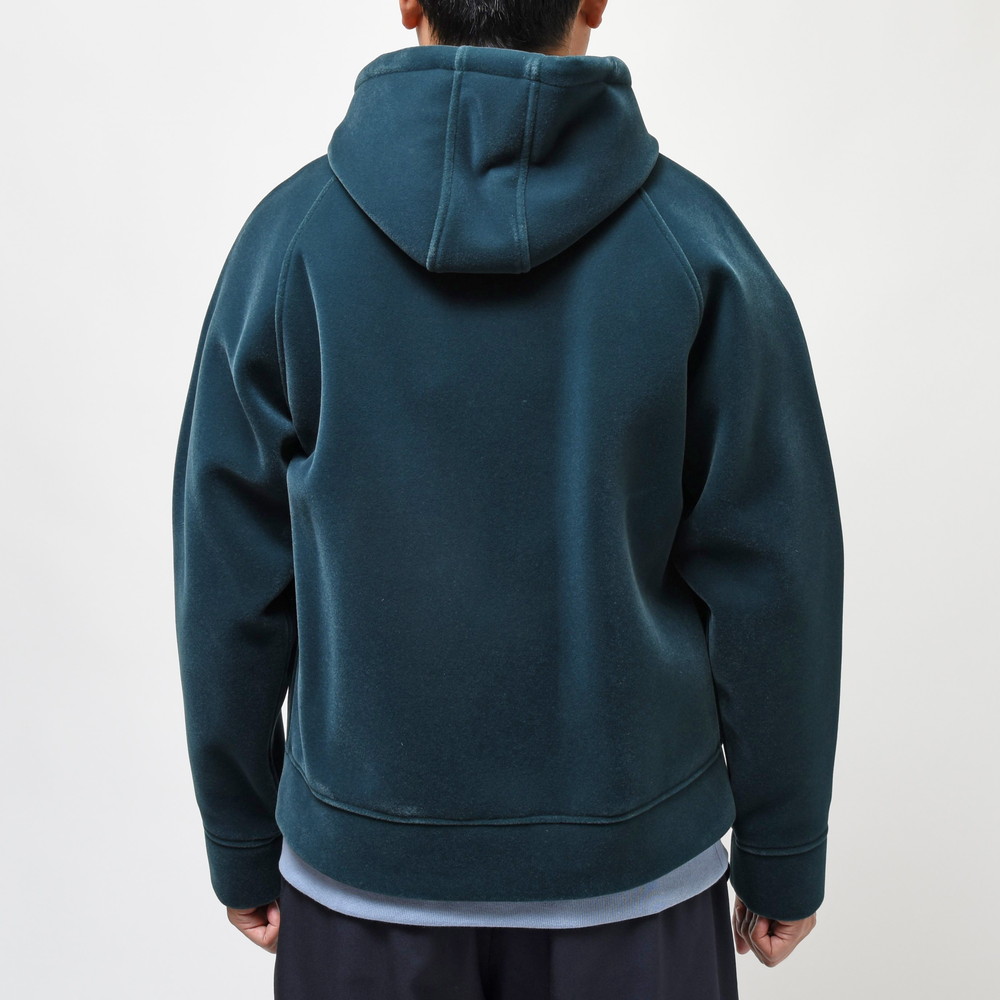 シルエットはややリラックス感のあるものを採用、こうする事でアウター的な感覚で着用頂けます。生地自体に厚みがある為、フード部分も自然な雰囲気で立ってくれるのもポイントの一つ。またドローコードはロゴをセットする事でちょっとしたアクセントになってくれるのも嬉しい所。