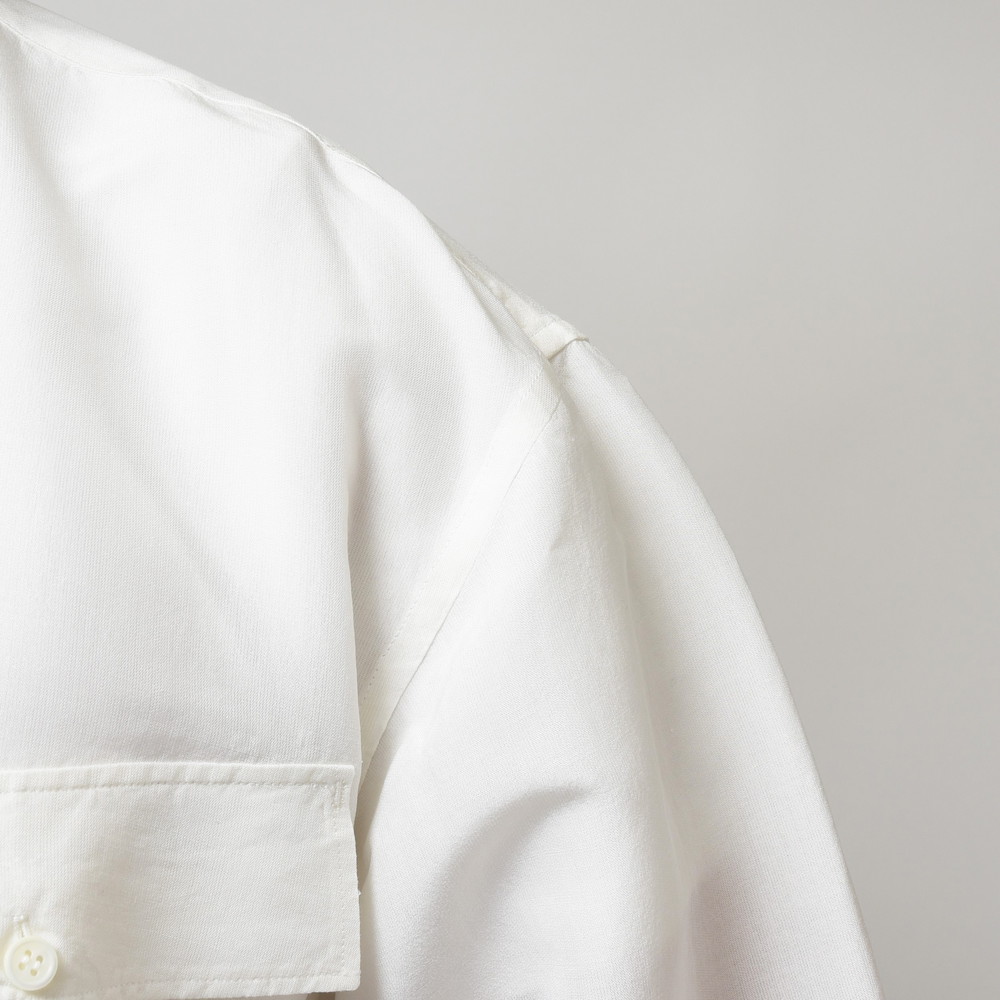 高めに設定されたスタンドカラーはインナー使いであっても主張してくれますし、大ぶりのフラップポケットはボディに対して少し斜めに付けることで、ちょっとした違和感を表現。こういった絶妙なバランスで成り立っているシャツ、実は使い勝手も良くそれでいて確かなファッション性を日々のスタイルに付加してくれるんです。