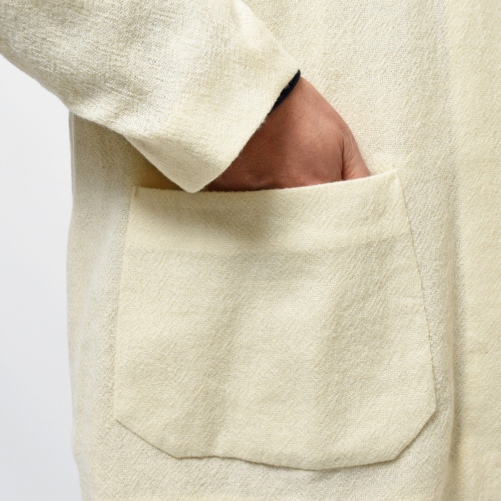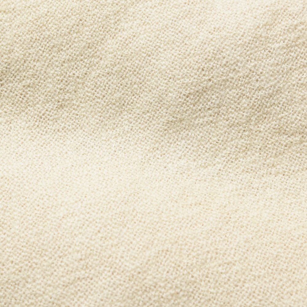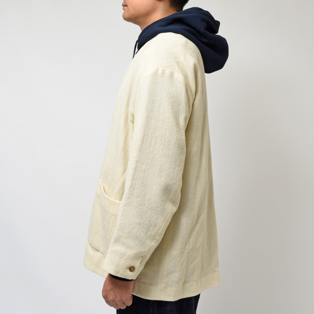 la favola(ラファーヴォラ)のカーディガンジャケット、ブランドの中でも良く提案されているタイプの型ですが今回はパイピングのデザインは無く、よりサラッとライトに羽織ることができるような仕上がりに。ノーカラーのデザインと無染色のウールを用いたナチュラルな色合いの組み合わせも絶妙ですね。