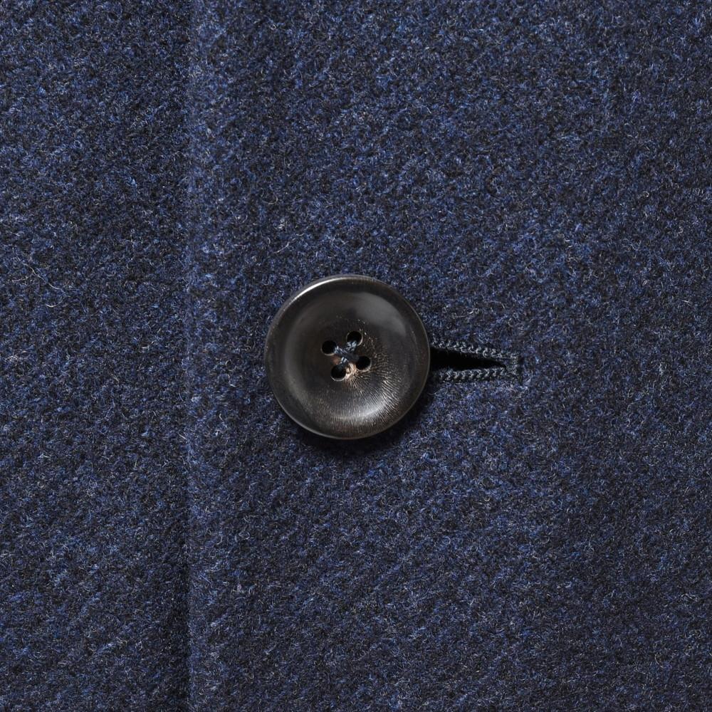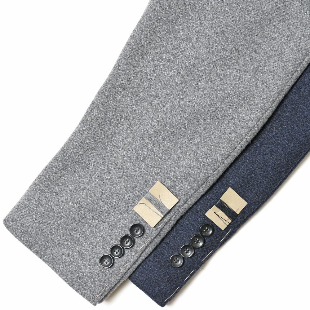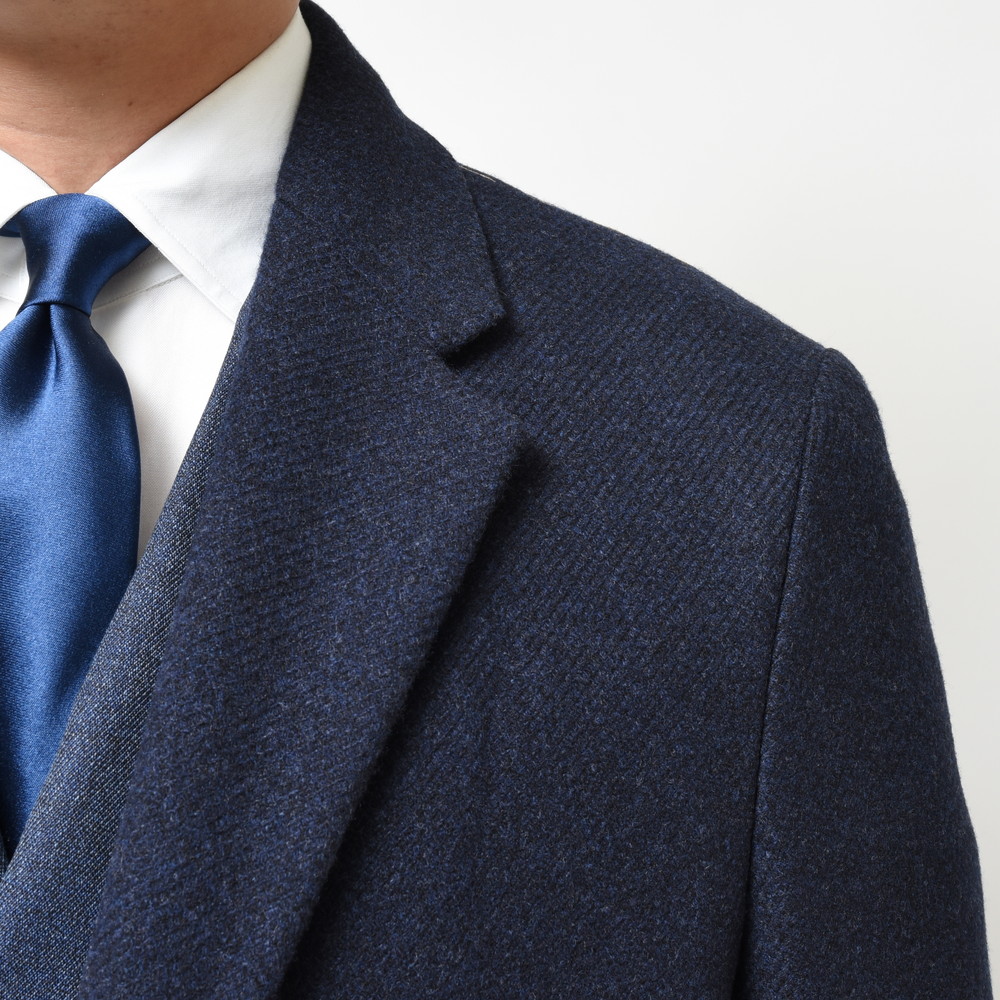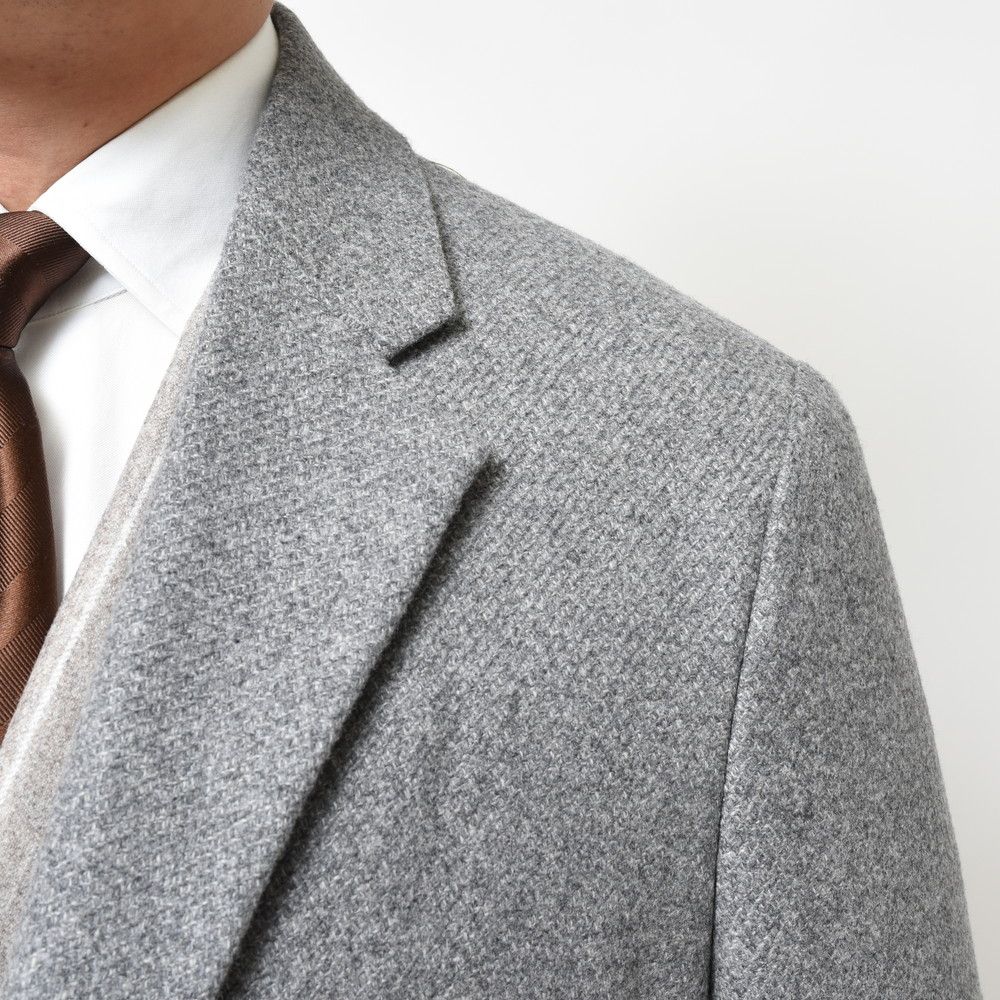 ウール×カシミアの紡毛で、表面にほのかな起毛感のあるライトツィードファブリックは非常にしなやかなタッチで高級感があり、モダンなスタイルに違和感なくフィットしています。