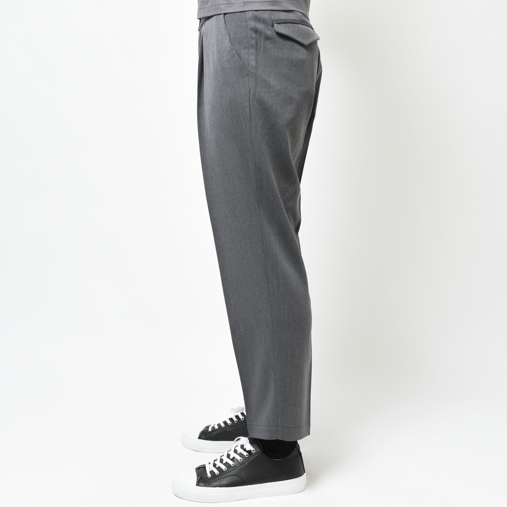 シルエットは安定感のあるワイドテーパードシルエット、程良くテーパードが効く事によって実際に穿いてみると意外にもスッキリとした印象で着用いただけるのもポイント。