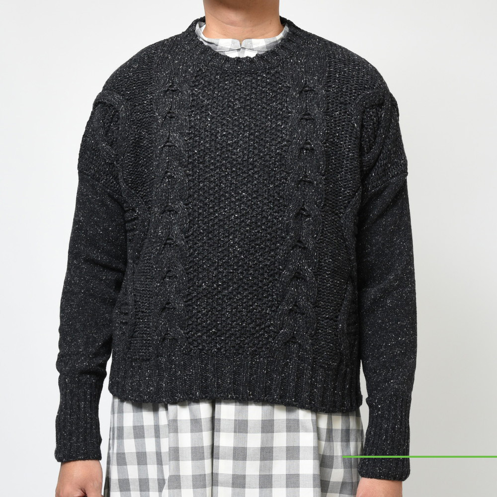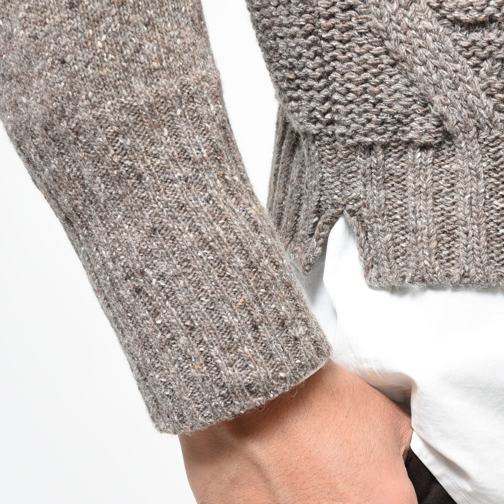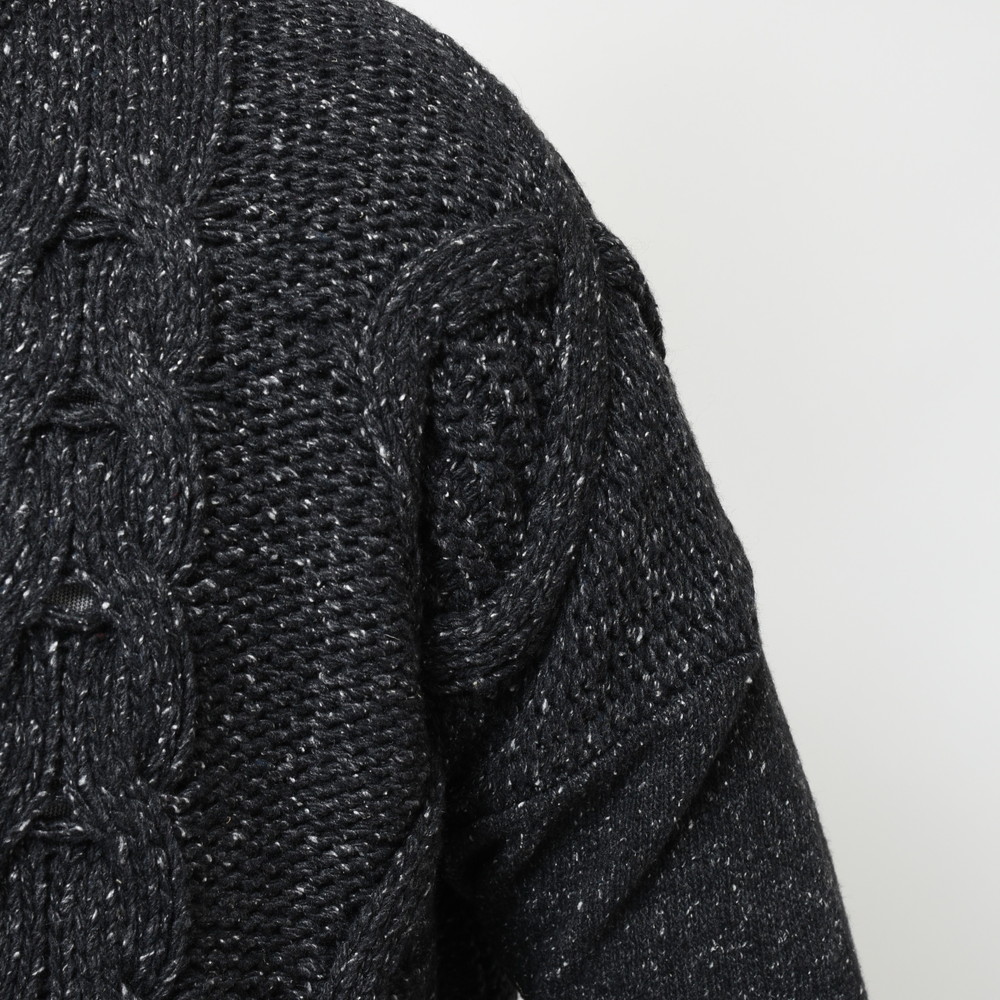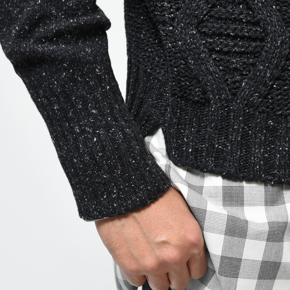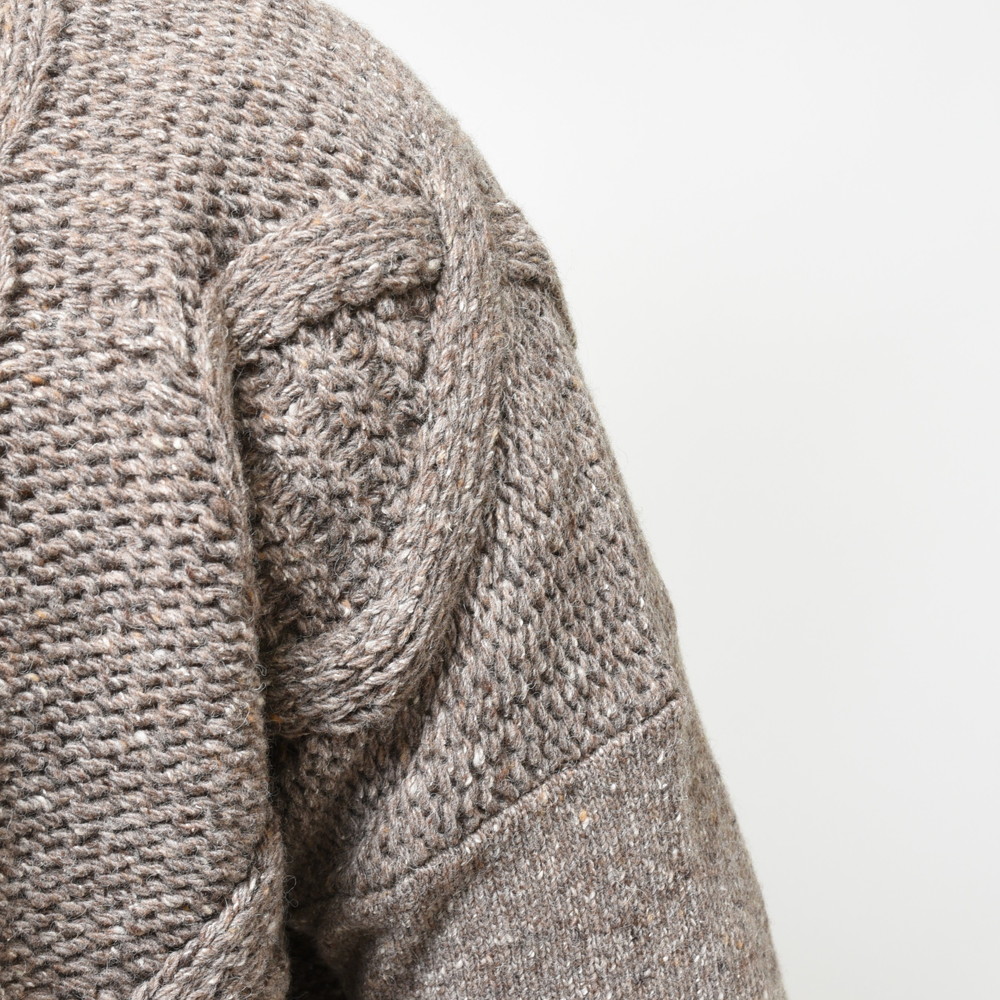 ケーブルに関しては身頃のみとなっていまして、更にメランジになる事で編地の印象をコントロールしているのがポイント。意外性がありながらも様々なスタイルに取り入れることが出来る、そんな一着になっています。