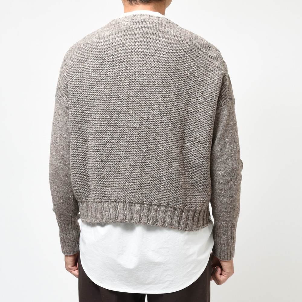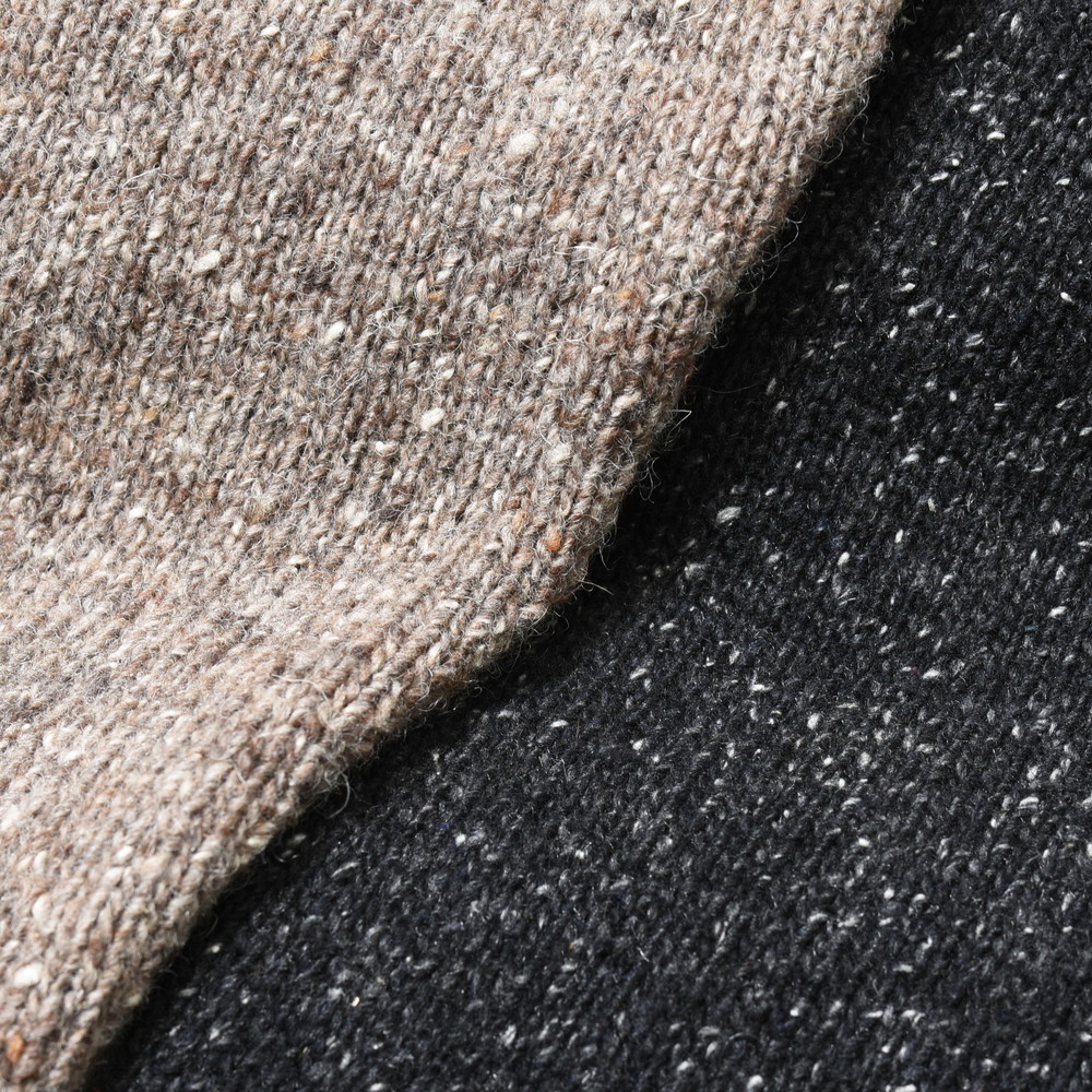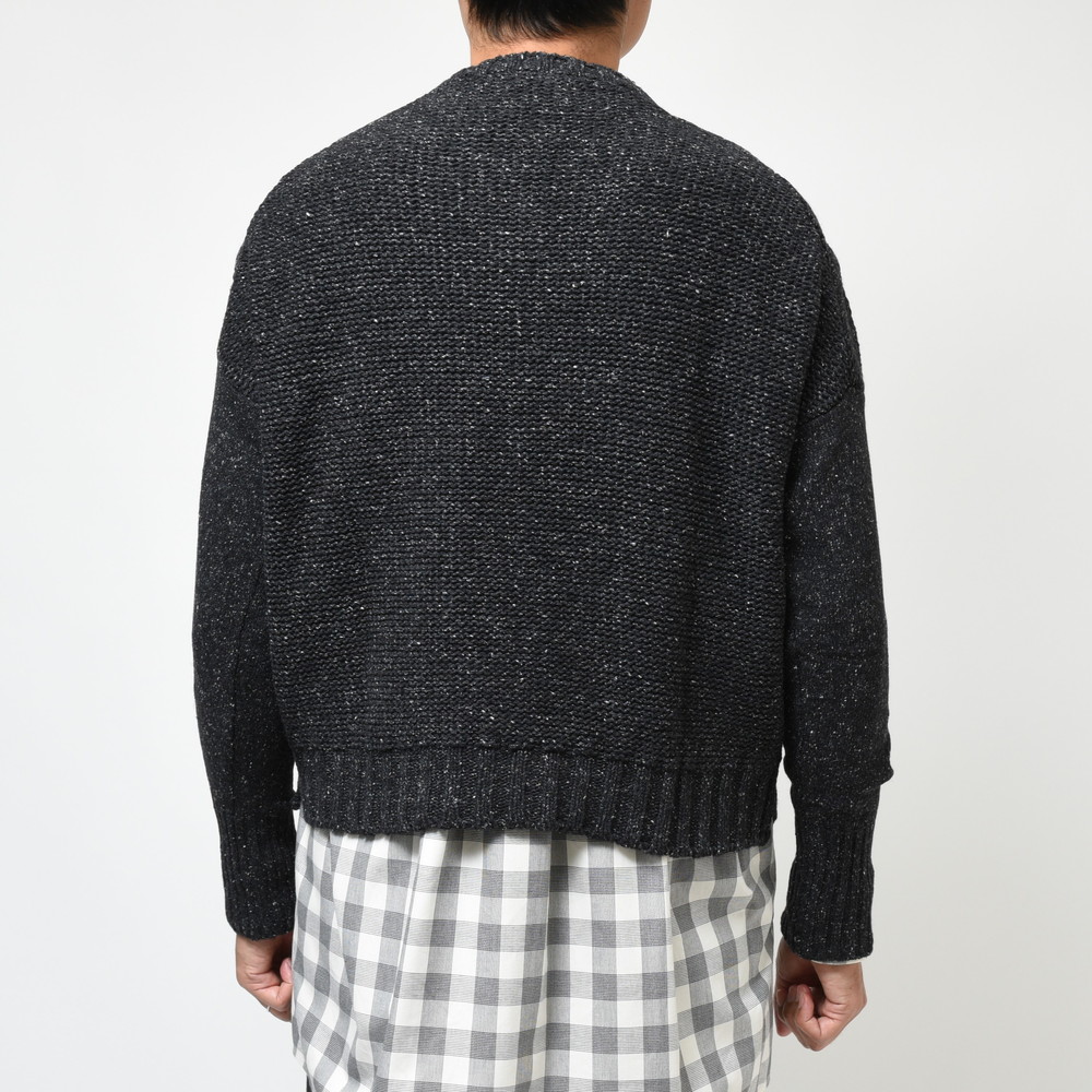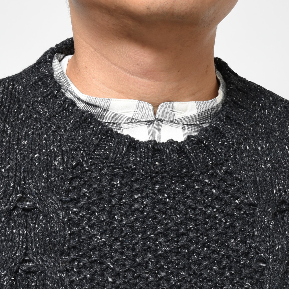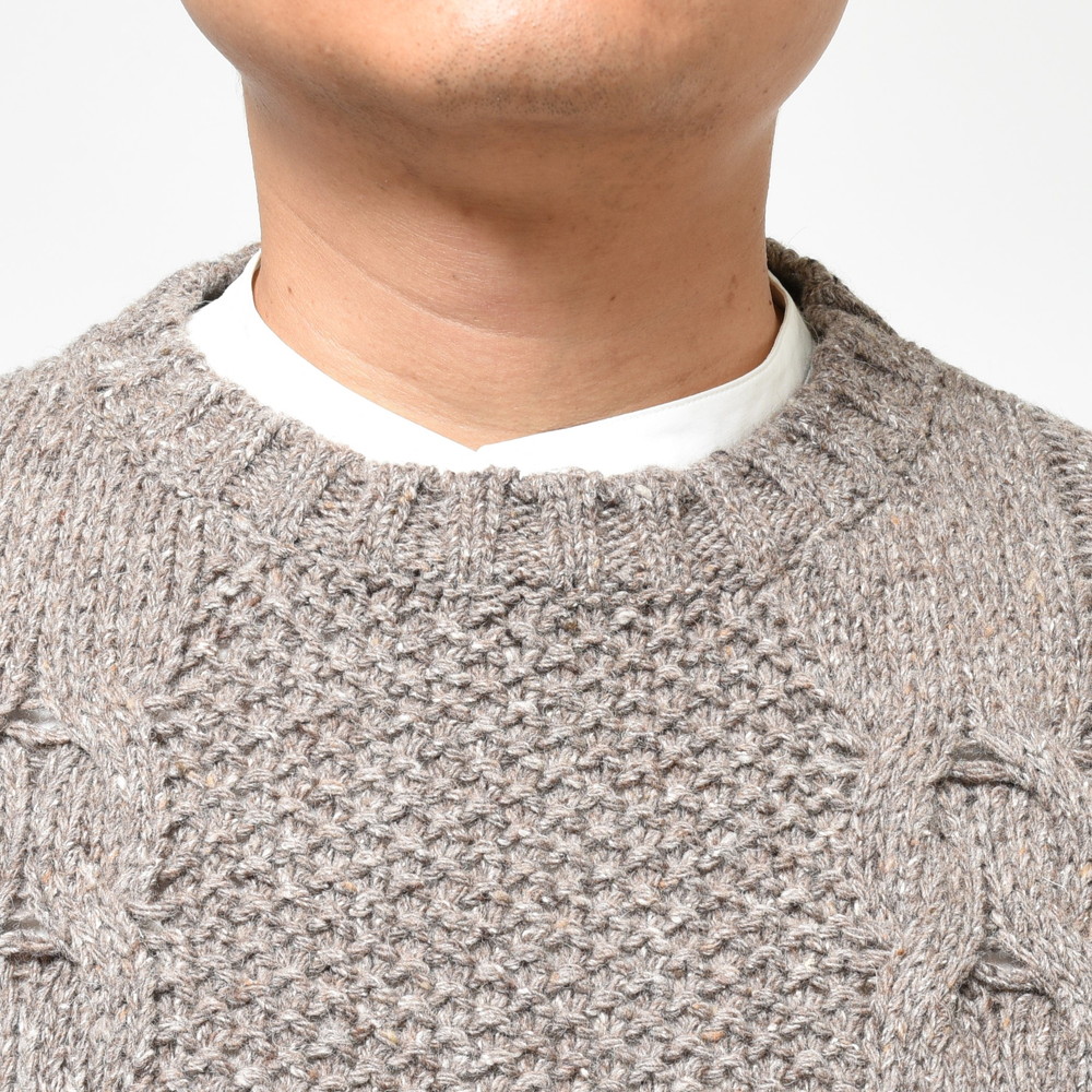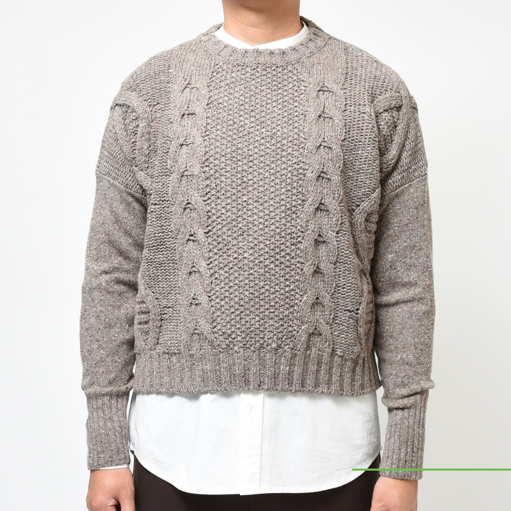 ケーブルに関しては身頃のみとなっていまして、更にメランジになる事で編地の印象をコントロールしているのがポイント。意外性がありながらも様々なスタイルに取り入れることが出来る、そんな一着になっています。