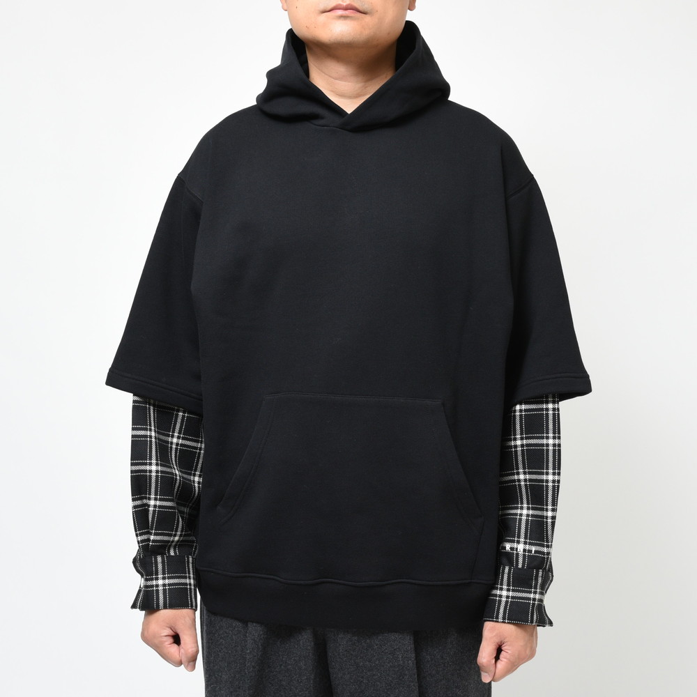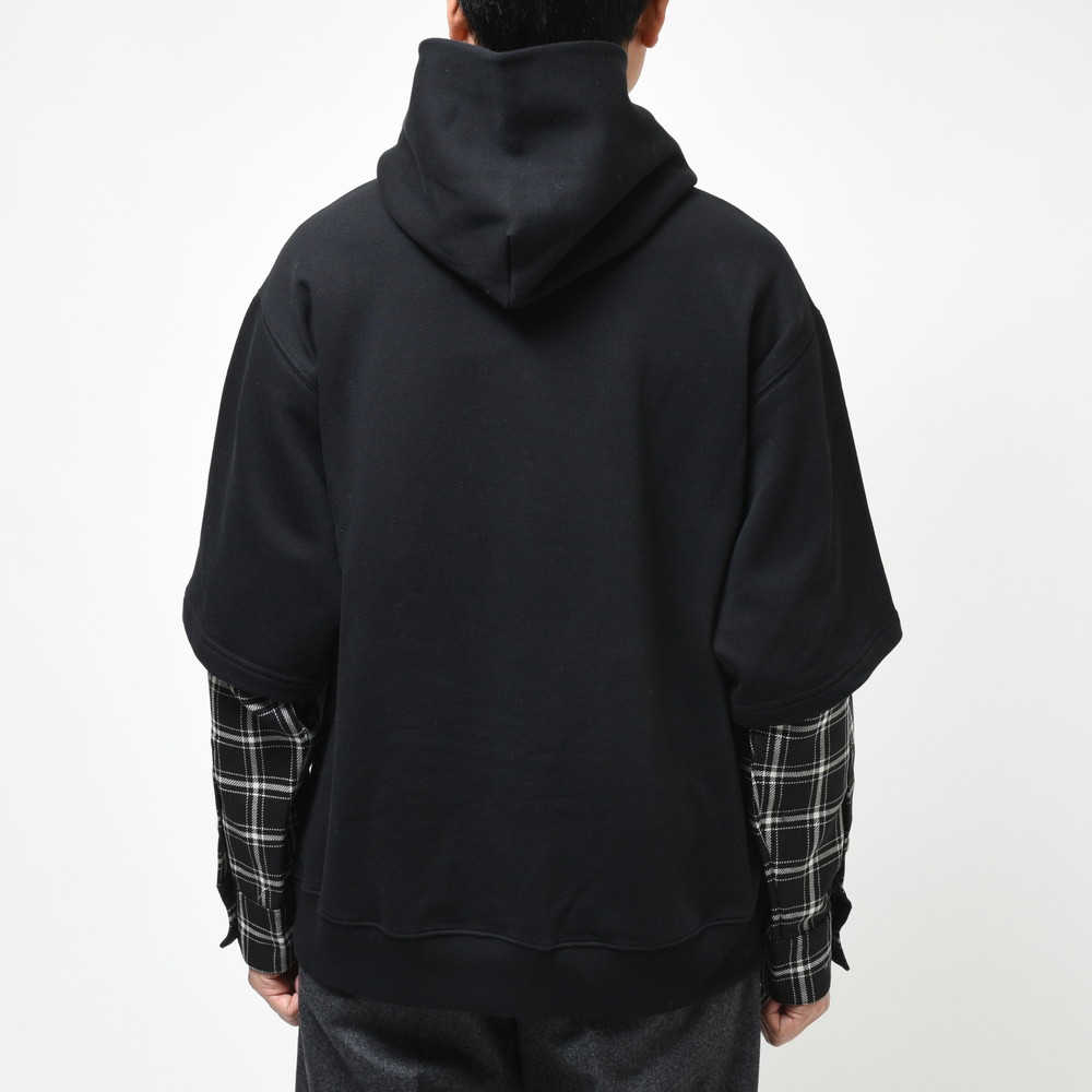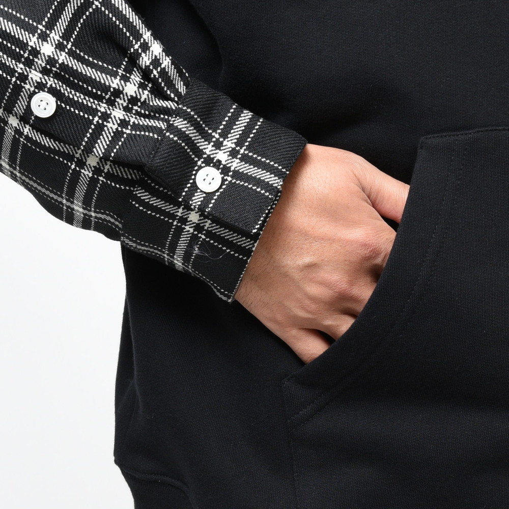 シルエットは程良くリラックス感のあるものになっていまして、フーディ部分は五分袖、そこにチェックシャツの袖を取り付ける事で他にはない雰囲気を形成。