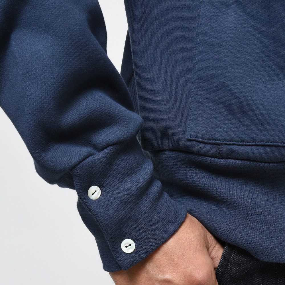 フーディーでもなく、スタンドカラーでもなく、Vネックタイプのデザインを選び、ディティールを詰めてオリジナリティを備えた物作りを遂げるところにELACIOのマニアックさが感じられます。