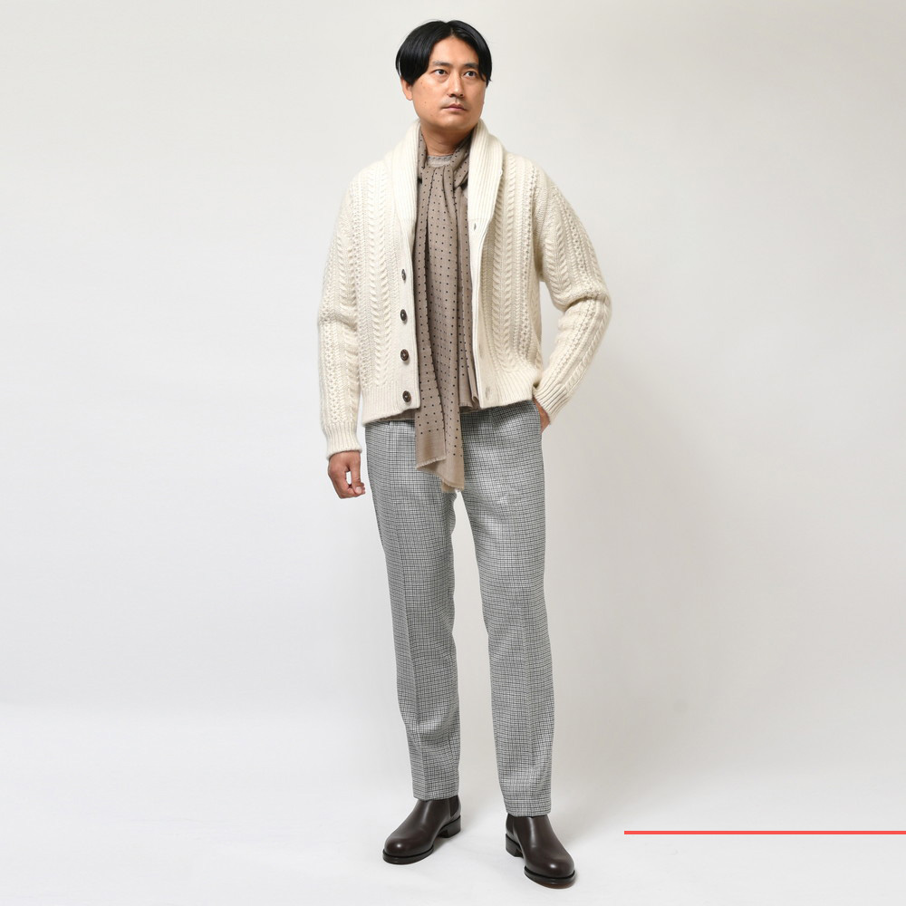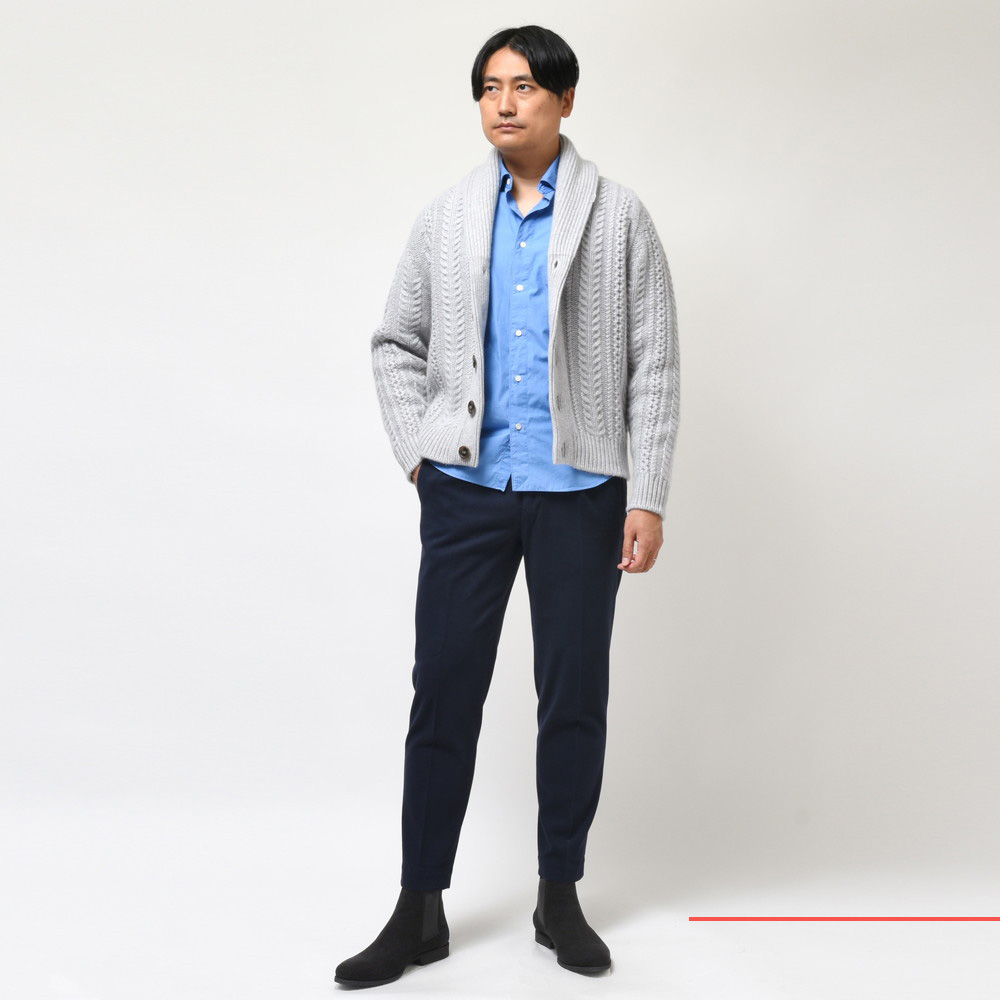 シュールカラータイプのカーディガン、その最高峰がこちらです。と、思わず言い切ってしまいたくなるレベルの仕上がり、さすがBEGG X COだなぁと。所謂一般的にイメージするケーブルよりも緻密に細かく編まれている感じも良いですね、ブランドの生真面目さが製品に出ているように感じます。
