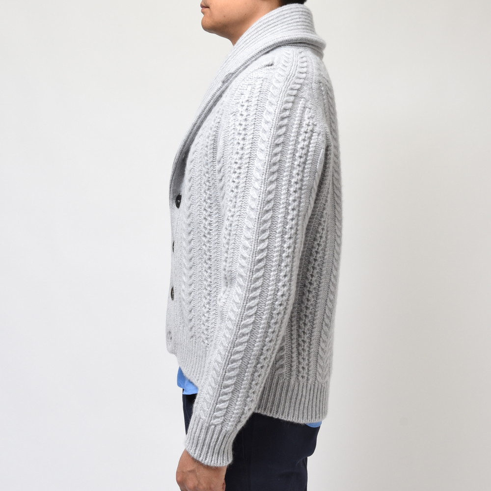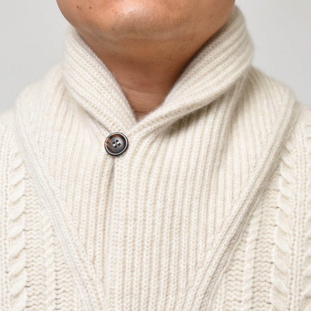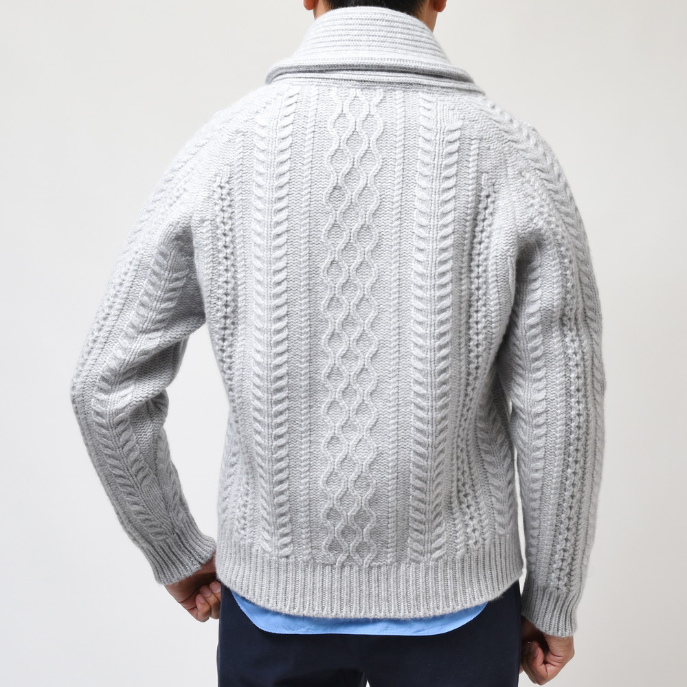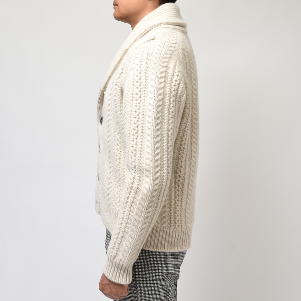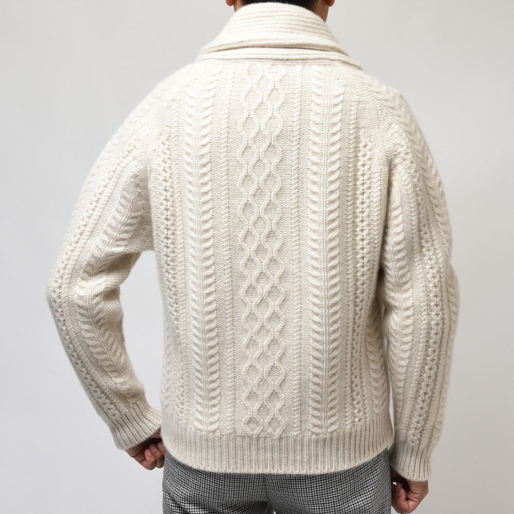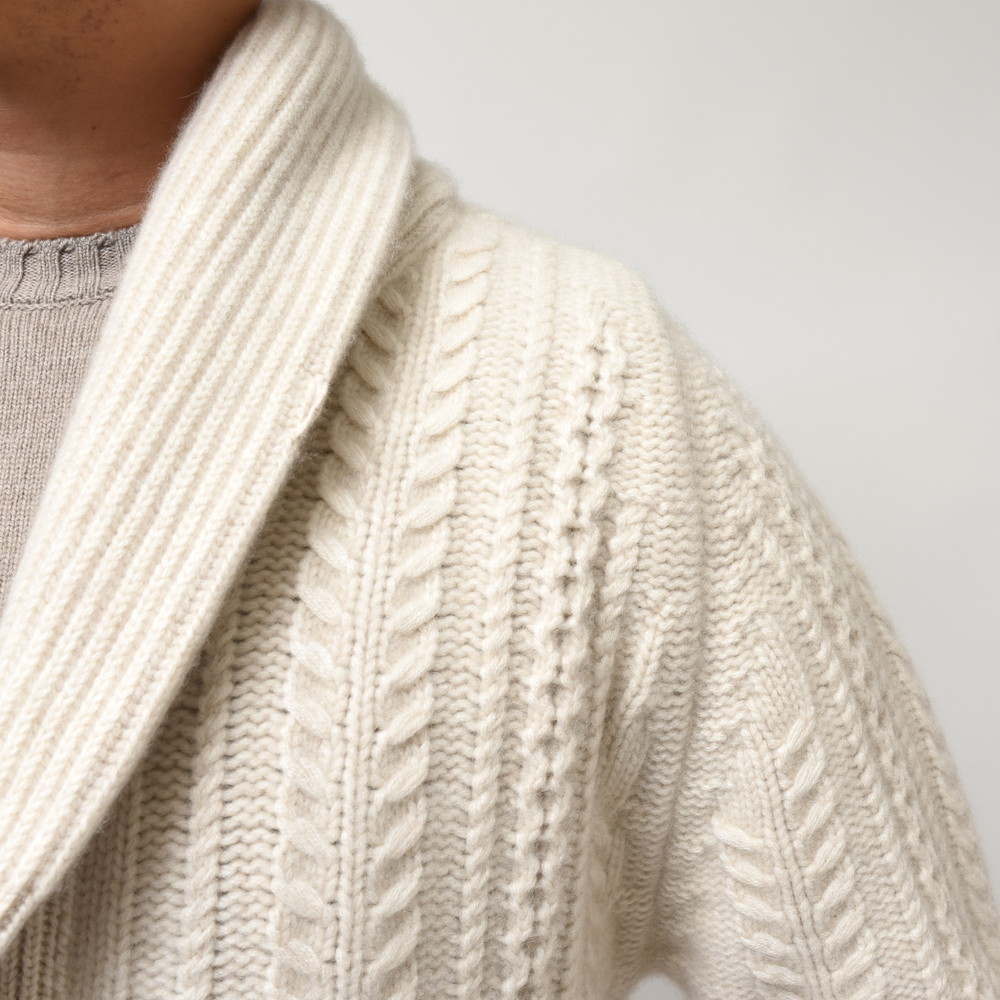 こちらはショールカラータイプのケーブルカーディガン。8プライという他ではなかなか見られない糸を用い、ざっくりと、立体的な柄行きをもって編み上げられた至高の一着です。