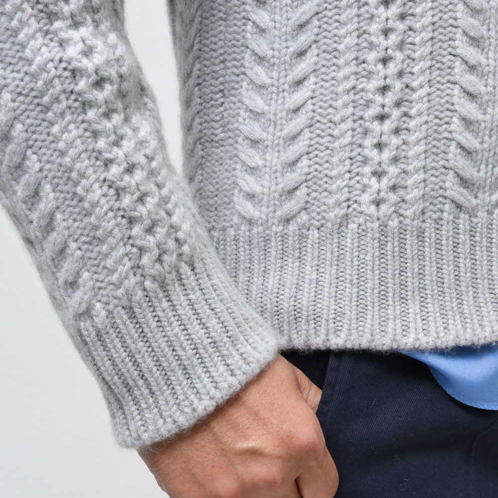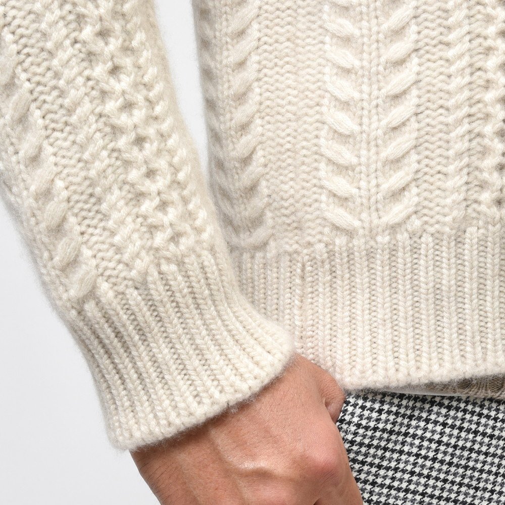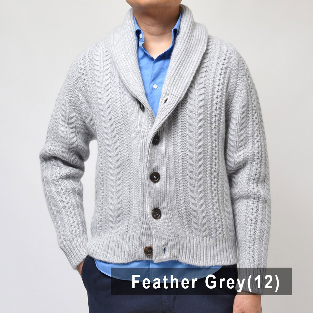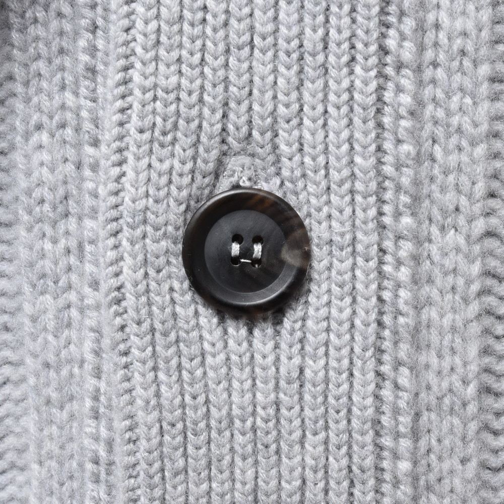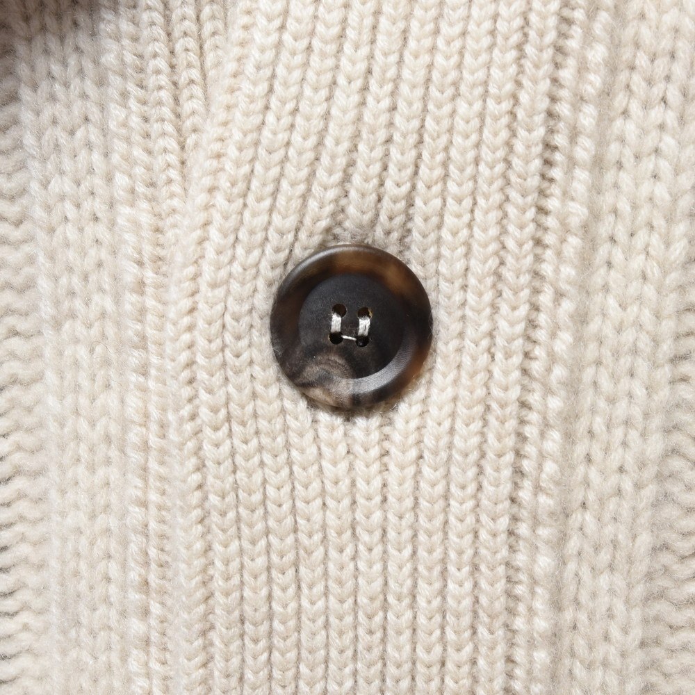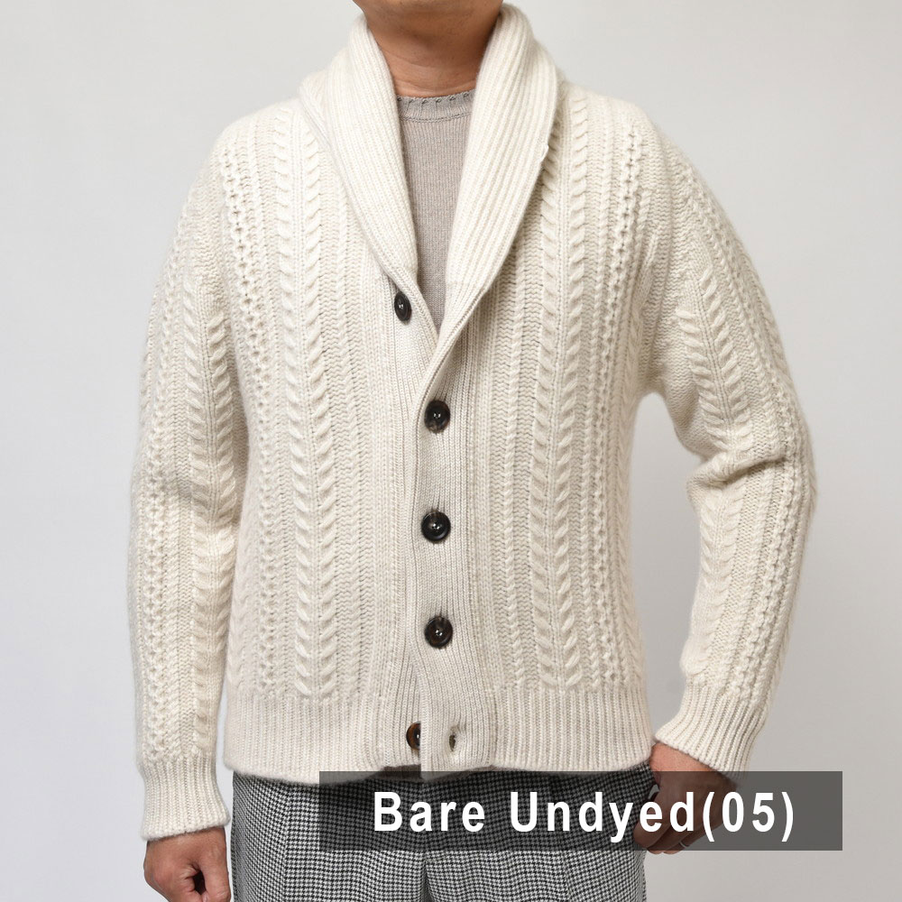 こちらはショールカラータイプのケーブルカーディガン。8プライという他ではなかなか見られない糸を用い、ざっくりと、立体的な柄行きをもって編み上げられた至高の一着です。