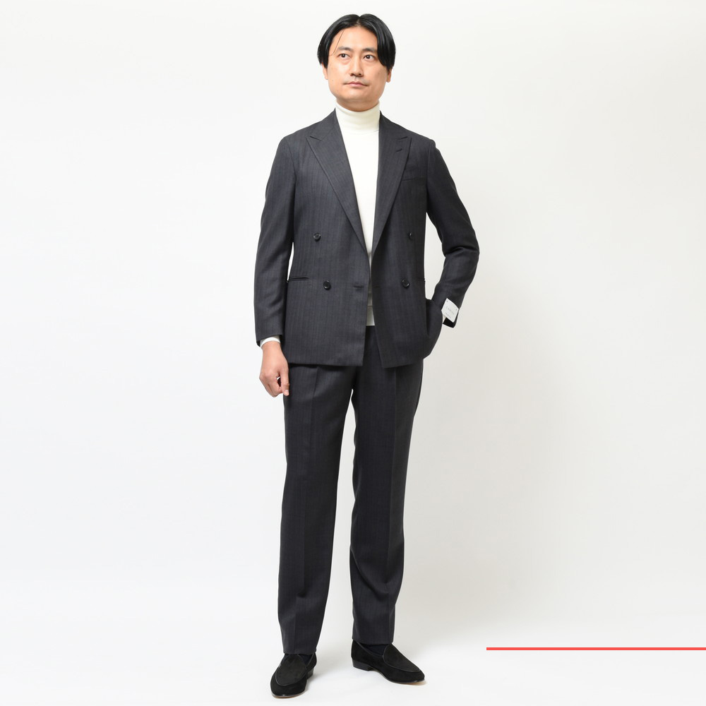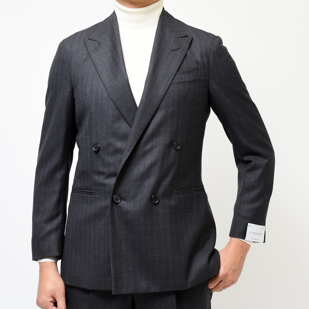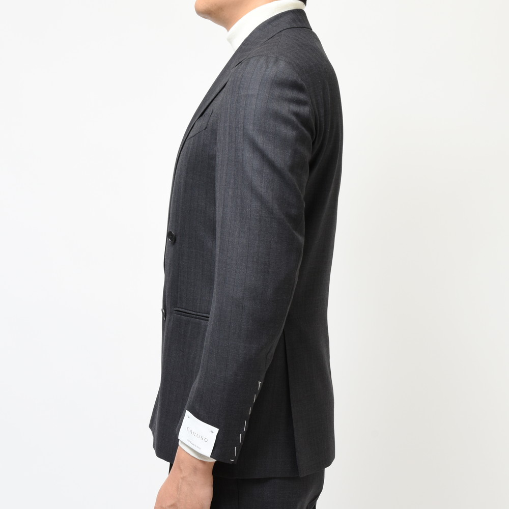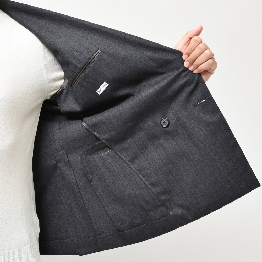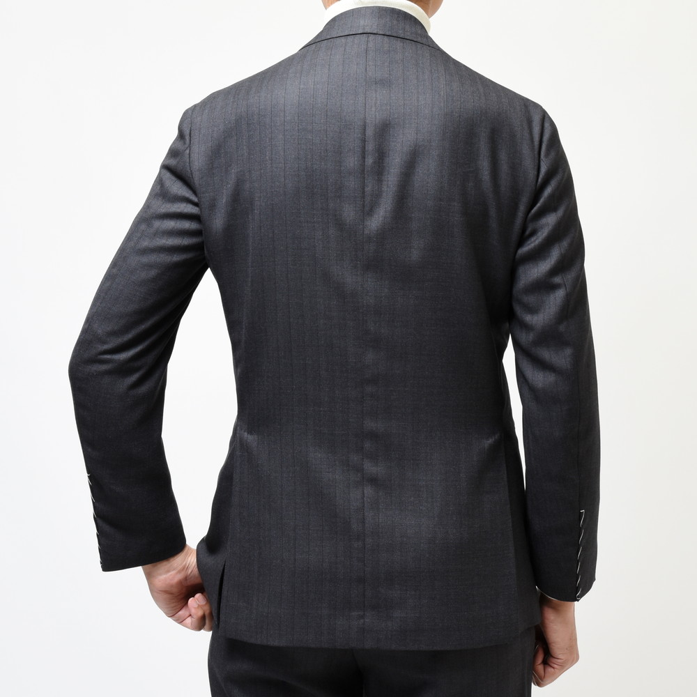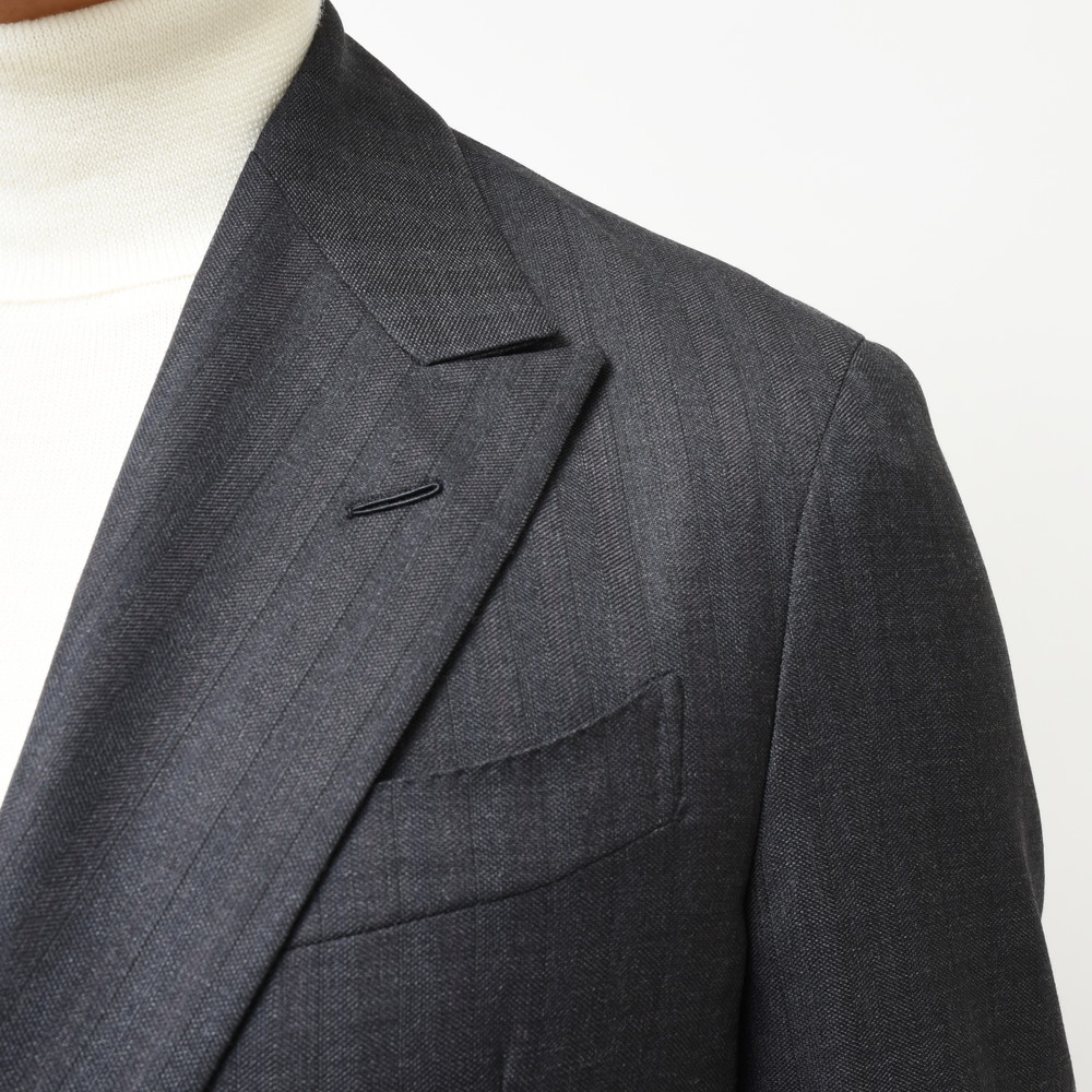 独特な表情があるチャコールのストライプ。滑らかな生地の上品さと落ち着きがと知的な印象があるチャコールが奥ゆかしさのあるジャケットに仕上がっています。