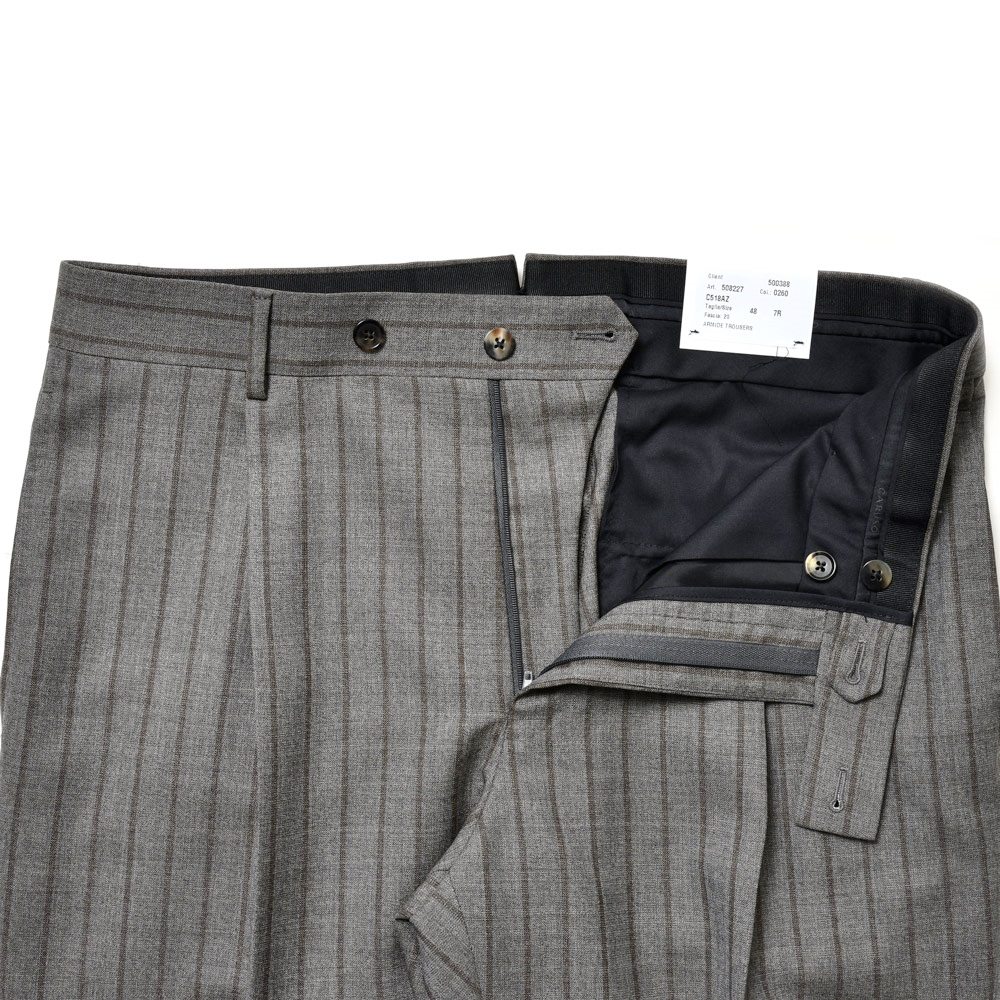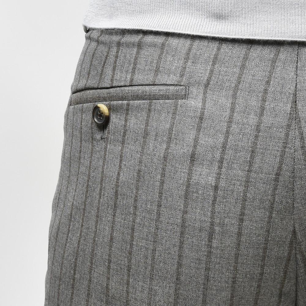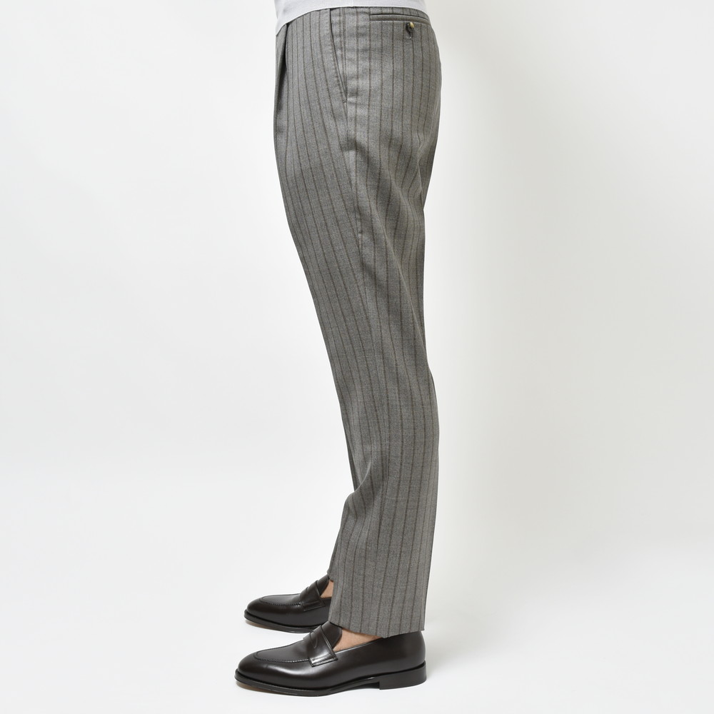 CARUSOならではのチョークストライプ生地は主張が強そうでそこまでではないという、見た目の印象と穿いた時の雰囲気にギャップがあるタイプ。
