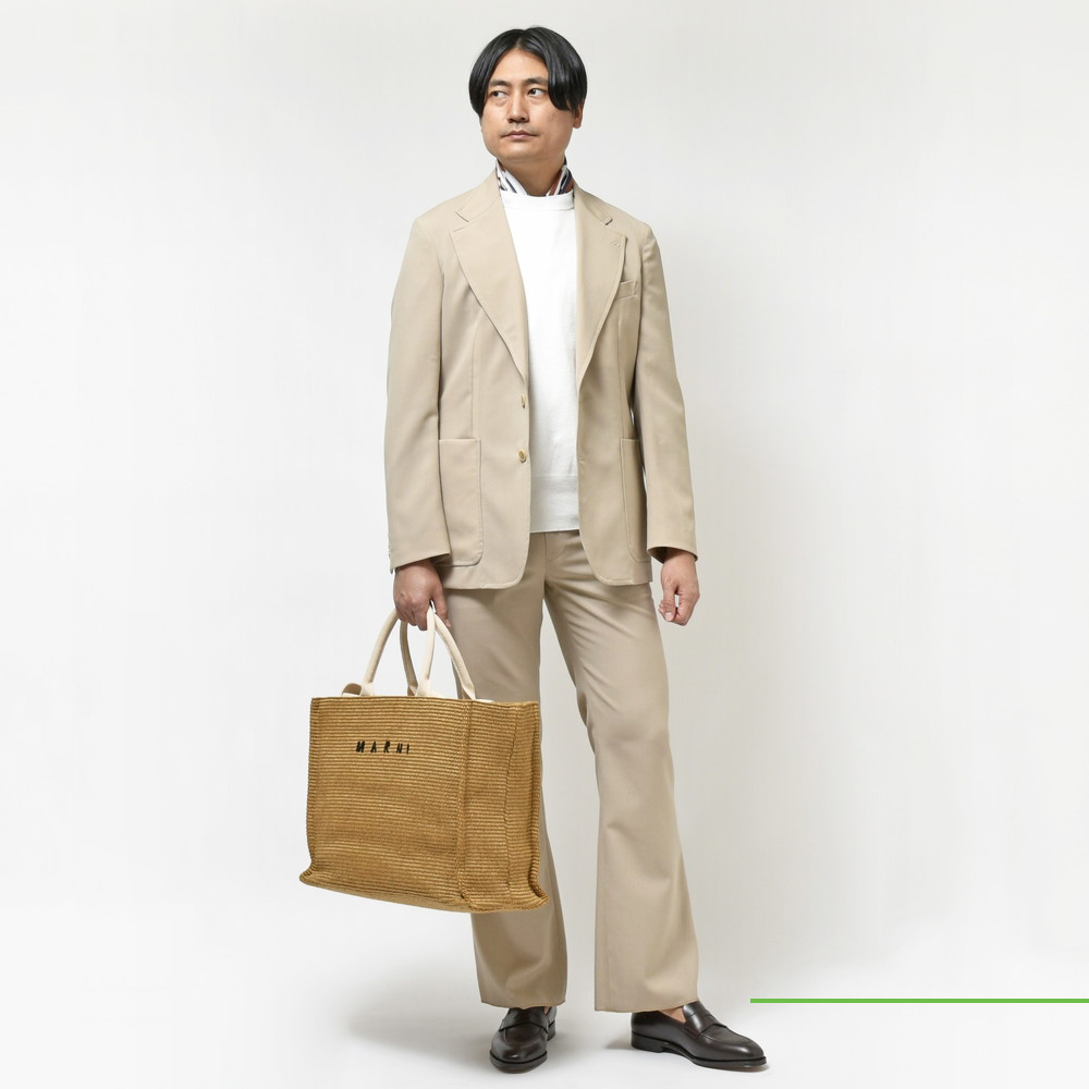 シンプルにサラッとニットなんかと合わせても大丈夫ですし、こういったセットアップでタイドアップというスタイルも面白そうです。