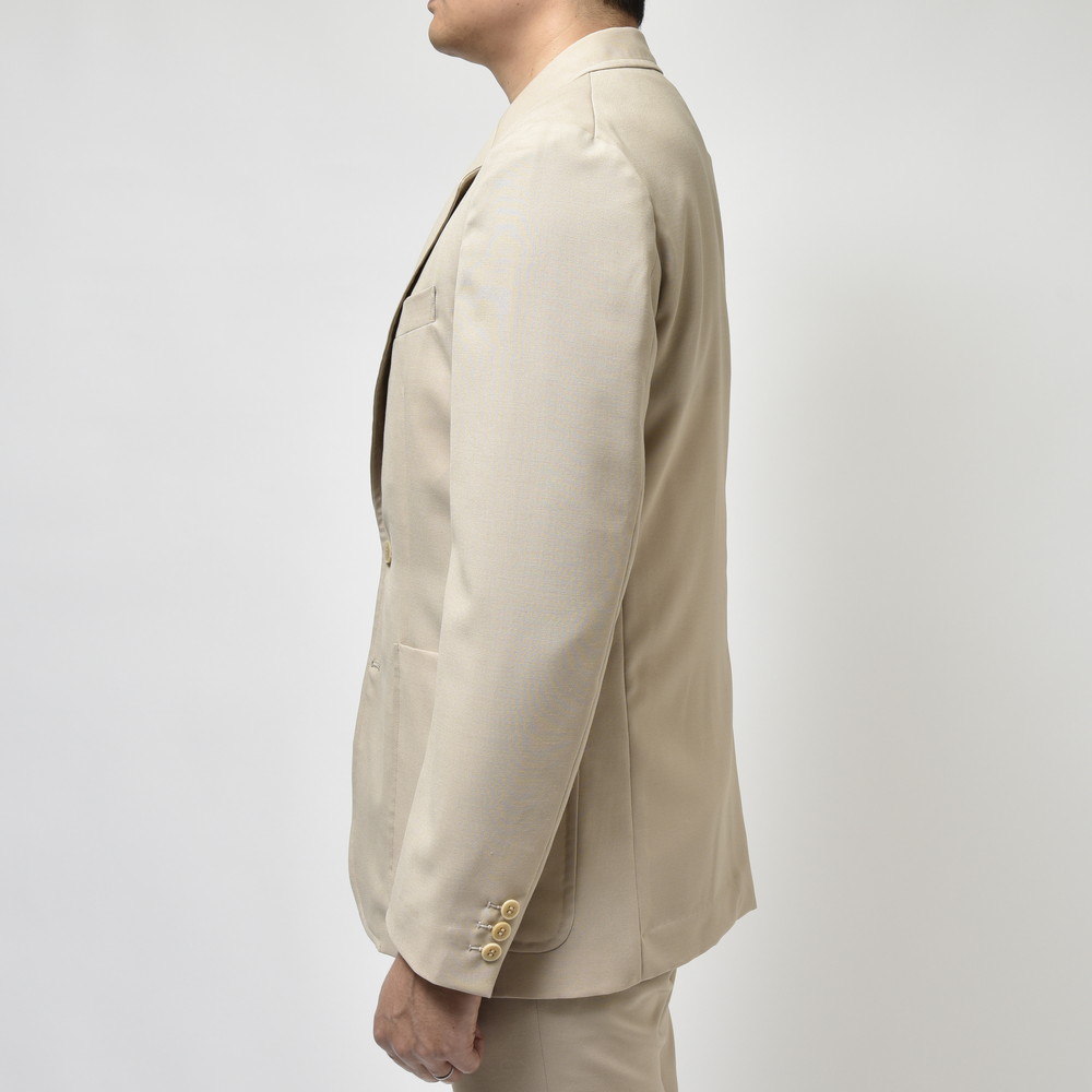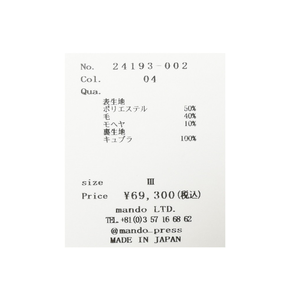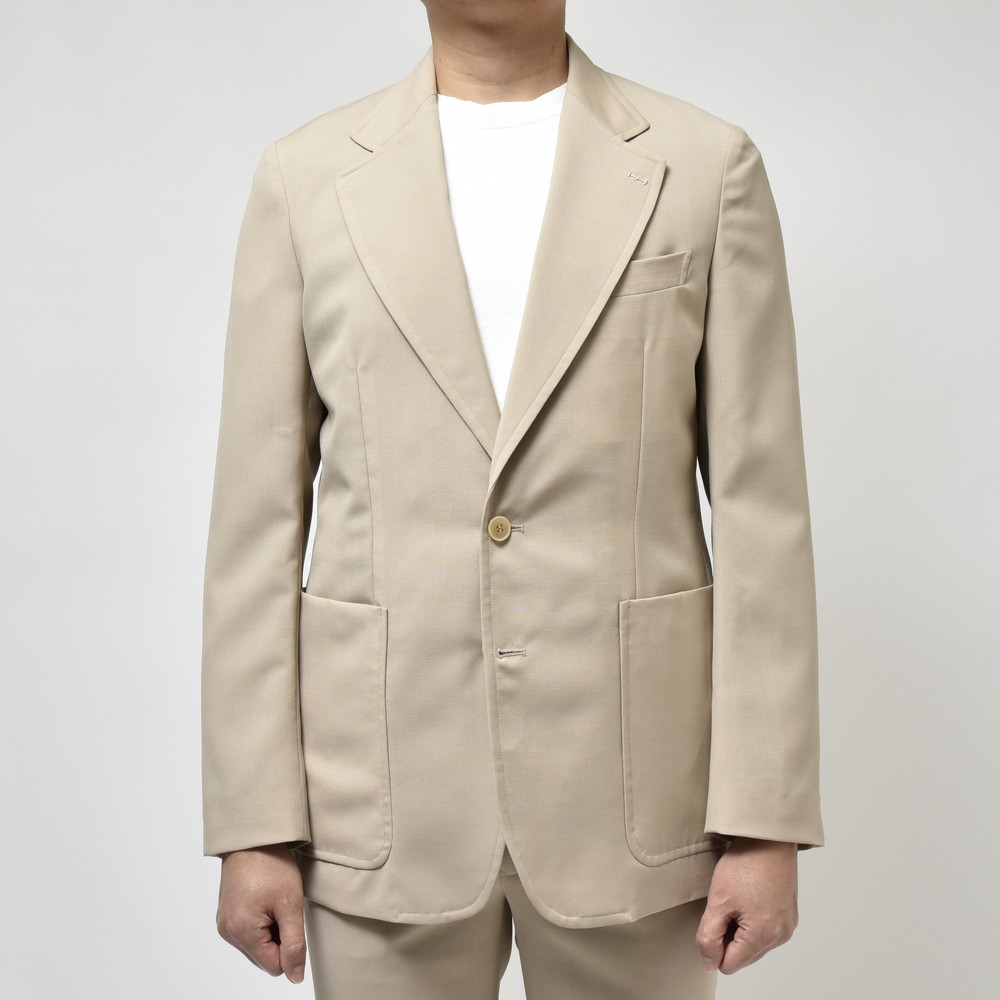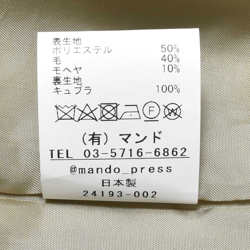 mando(マンド)のシングルジャケット、ポリエステル、ウール、モヘヤの3者混になっていまして、ドライなタッチで程良く清涼感があり、同ブランドらしいクラシックモードとモダンさが上手く融合したシルエット&ディティールの一着になっています。