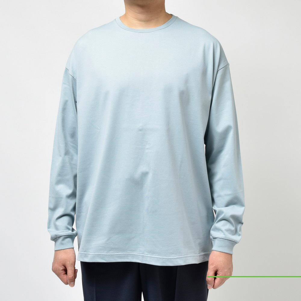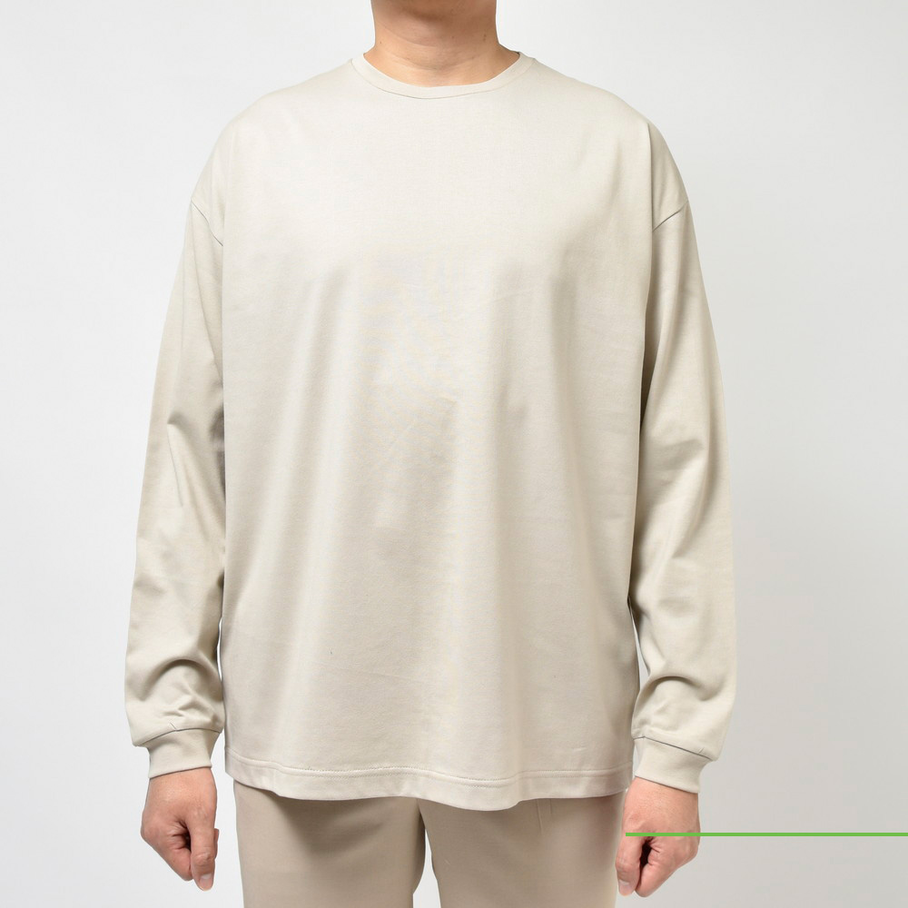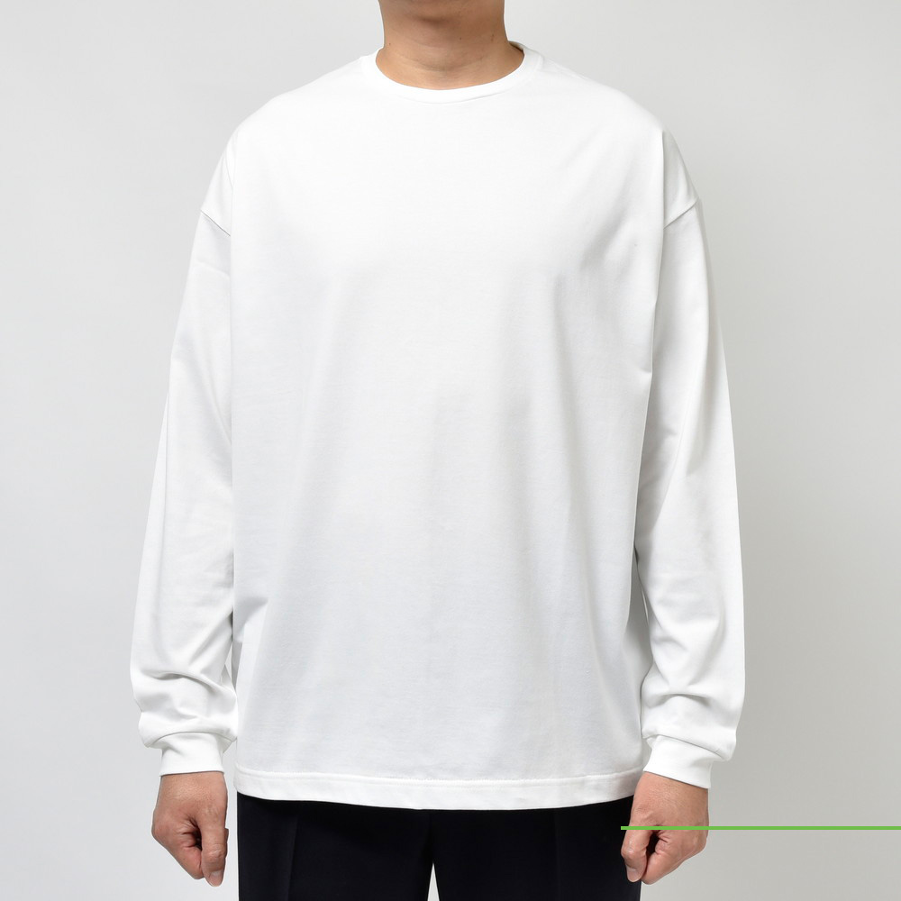 個人的にも愛用している、ちょっと余裕のあるロングスリーブのカットソー、オーバーサイズという訳ではないのでジャケットのインナーとかにもお使い頂けます。あると便利ですし、単体でもそつなく決まってくれるのがポイントかと。