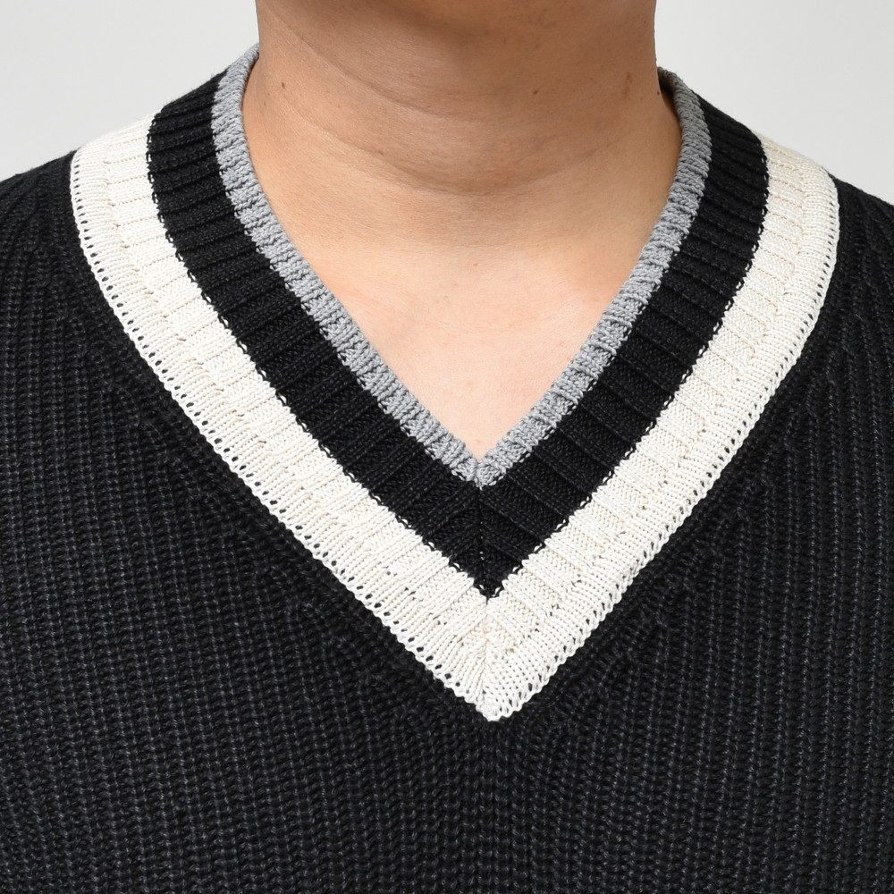 Vネックの開きはチルデンとしてはやや浅め、クラシックに見えすぎないよう曲線を入れず、シャープなVを描くネックラインが特徴ですね。