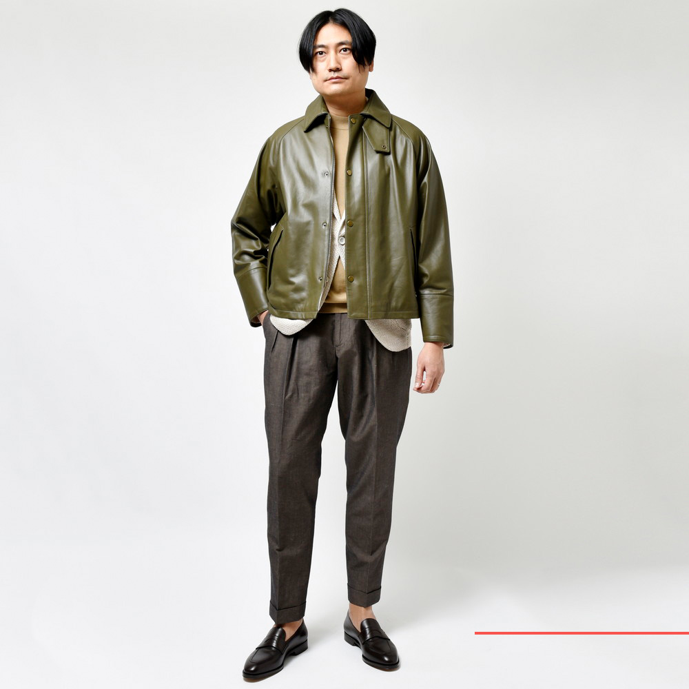 バブアー的な印象を彷彿とさせる一着でして、定番のライダースに比べると意外性がある感じですね。ただ、合わせ自体はそこまで難しくない感じです。身幅ゆるめのストンと落ちるような短めの丈感になっているので、感覚的には軽いブルゾンを着るように着用してもらえる感じです。
