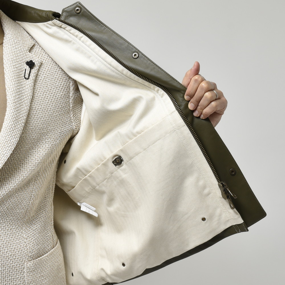 オマージュというとやや大げさかもしれませんが、伝統的な英国デザインをイタリアらしく解釈したレザーブルゾンで、非常に小気味の良い仕上がりかと思います。
