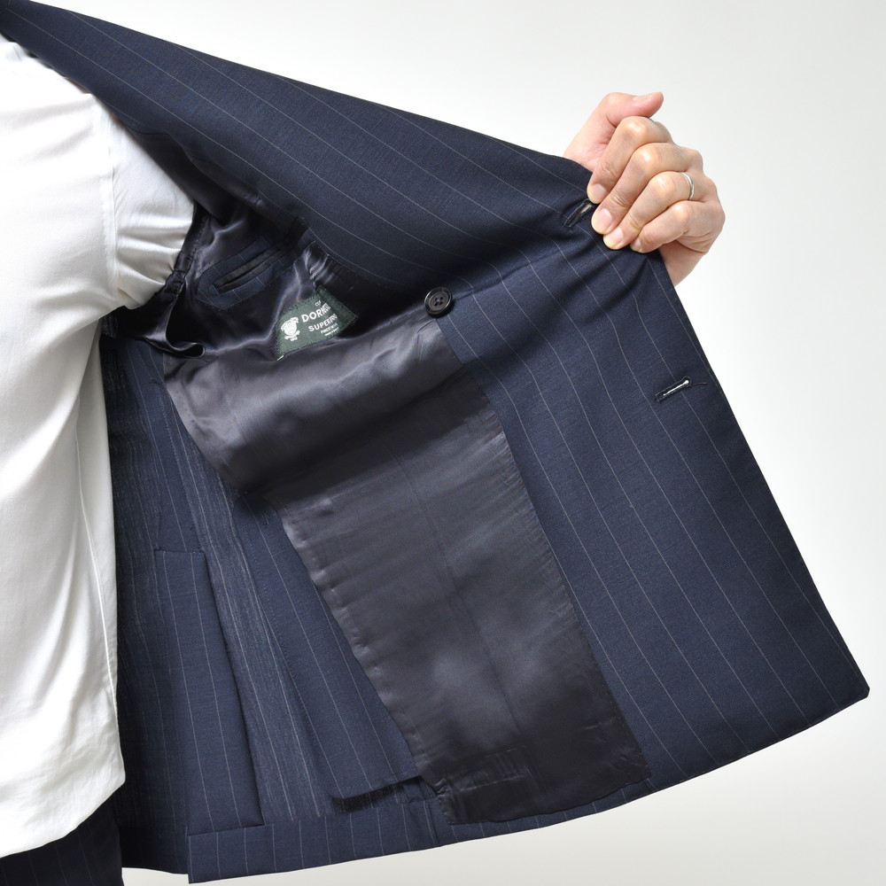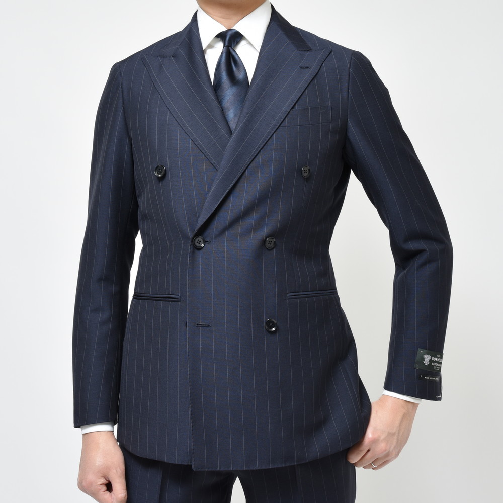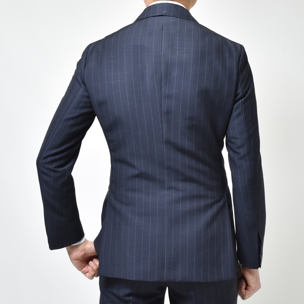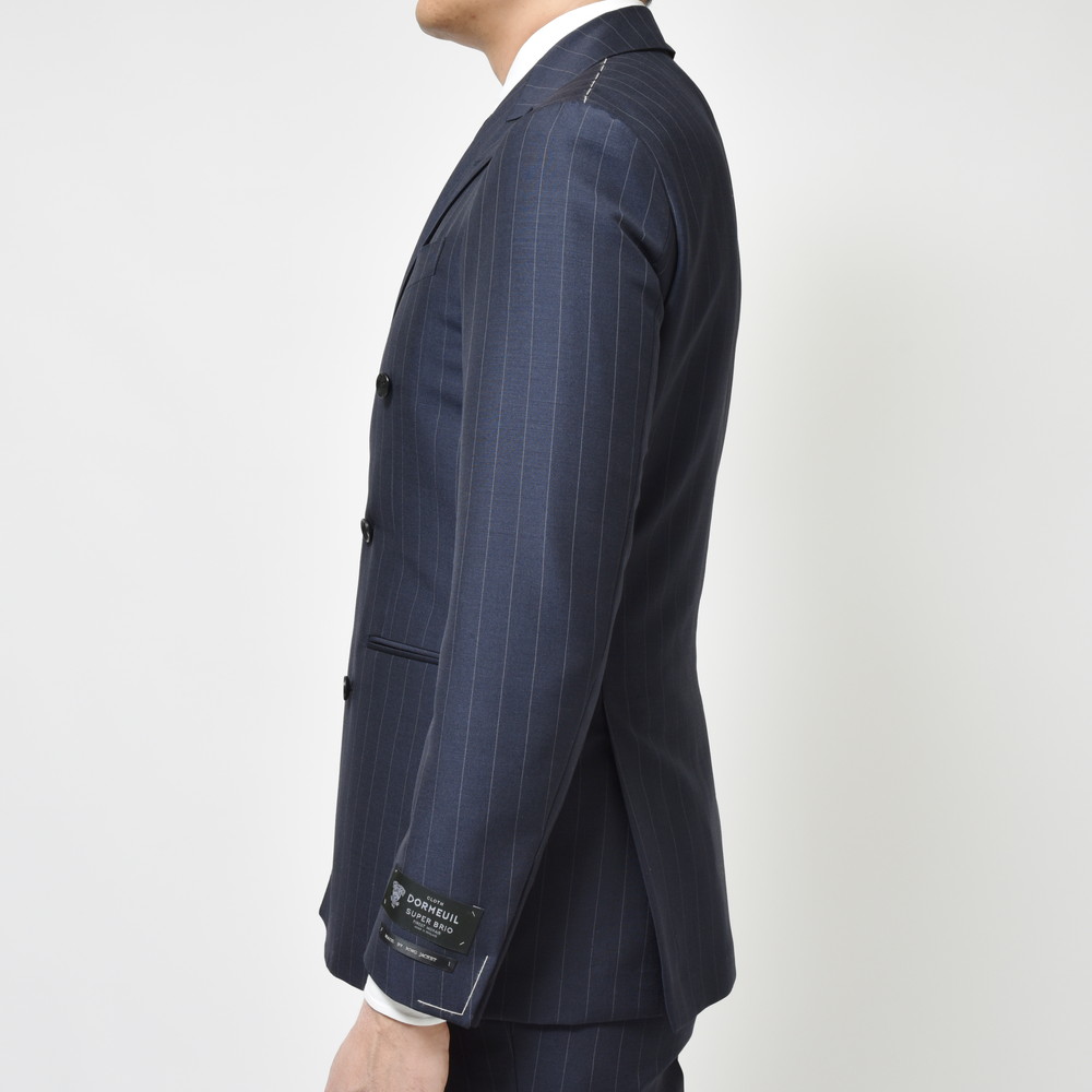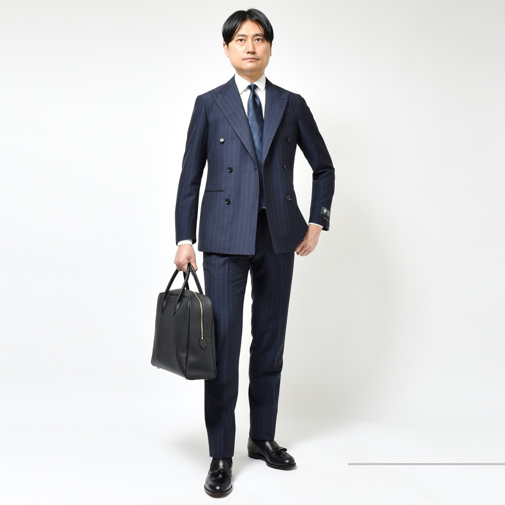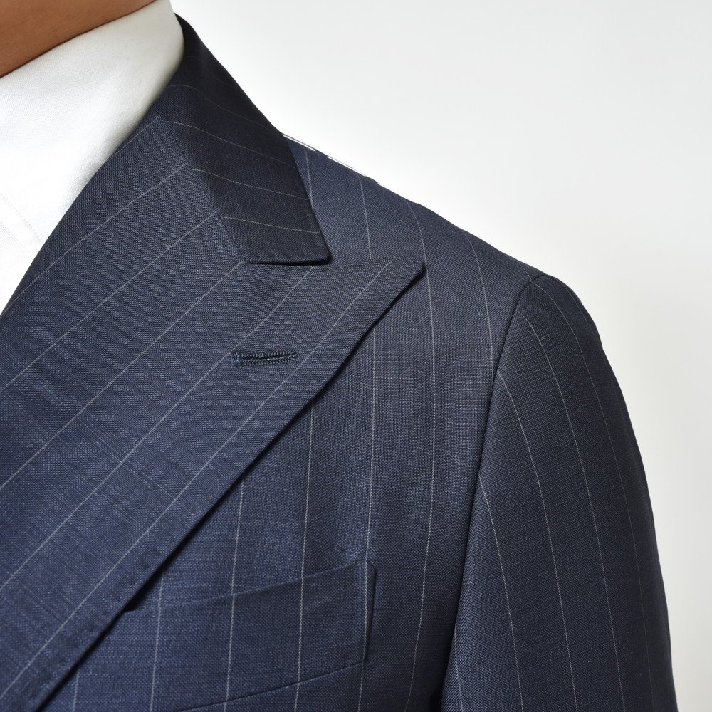 ダブルブレストのストライプスーツは貫禄のあるイメージが強くてハードルが高いと思っていらっしゃる方も多いと思いますが、DORMEUIL社のSUPER BRIOに2.0cmピッチのストライプ幅を指定した別注ファブリックを用いることで、強いイメージになりすぎないので、お召しいただける仕上がりになっていると思います。