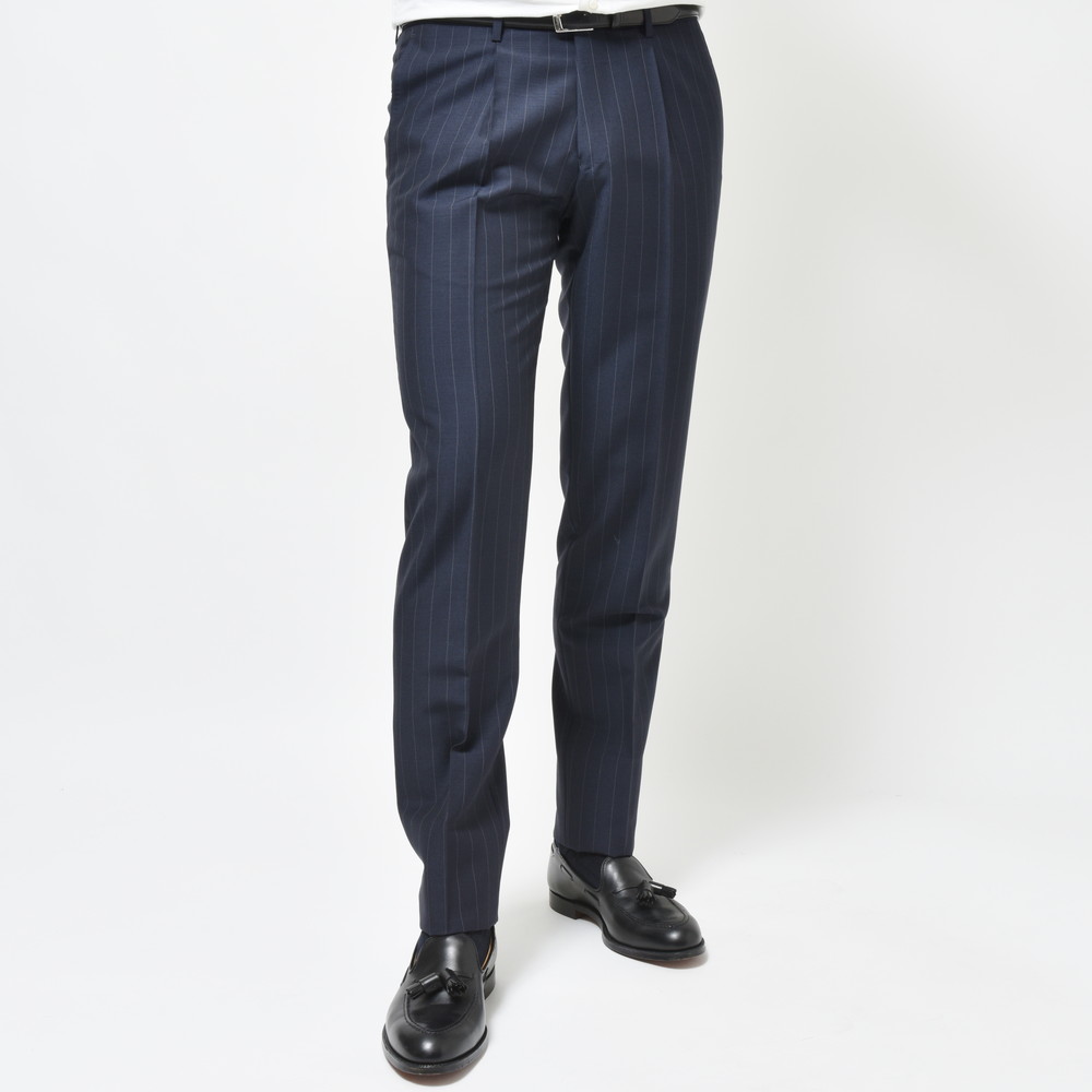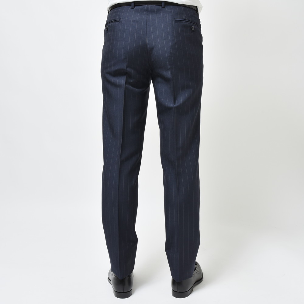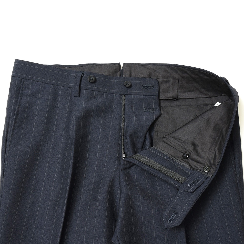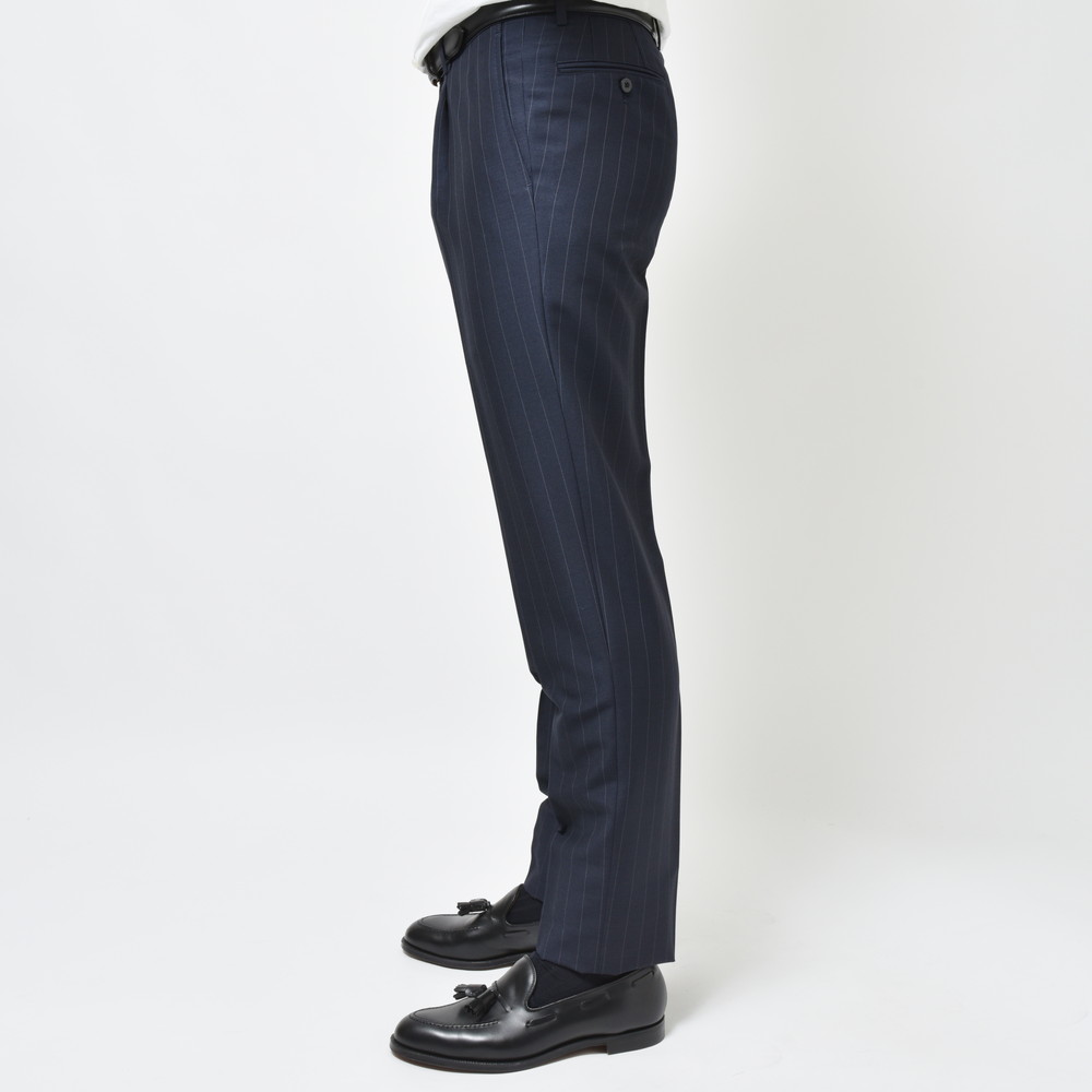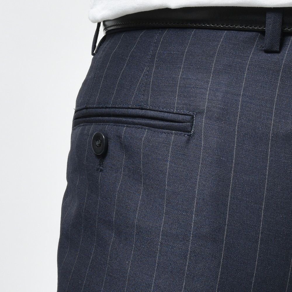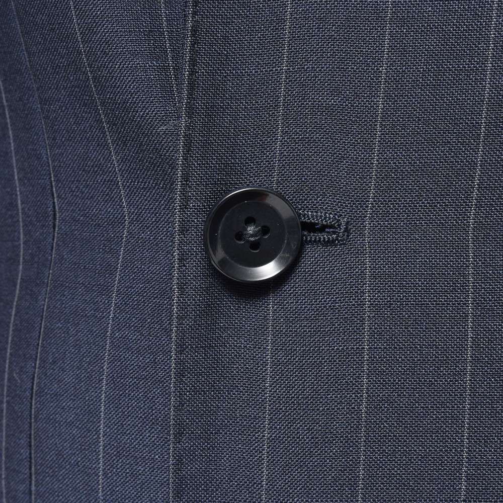 ダブルブレストのストライプスーツは貫禄のあるイメージが強くてハードルが高いと思っていらっしゃる方も多いと思いますが、DORMEUIL社のSUPER BRIOに2.0cmピッチのストライプ幅を指定した別注ファブリックを用いることで、強いイメージになりすぎないので、お召しいただける仕上がりになっていると思います。